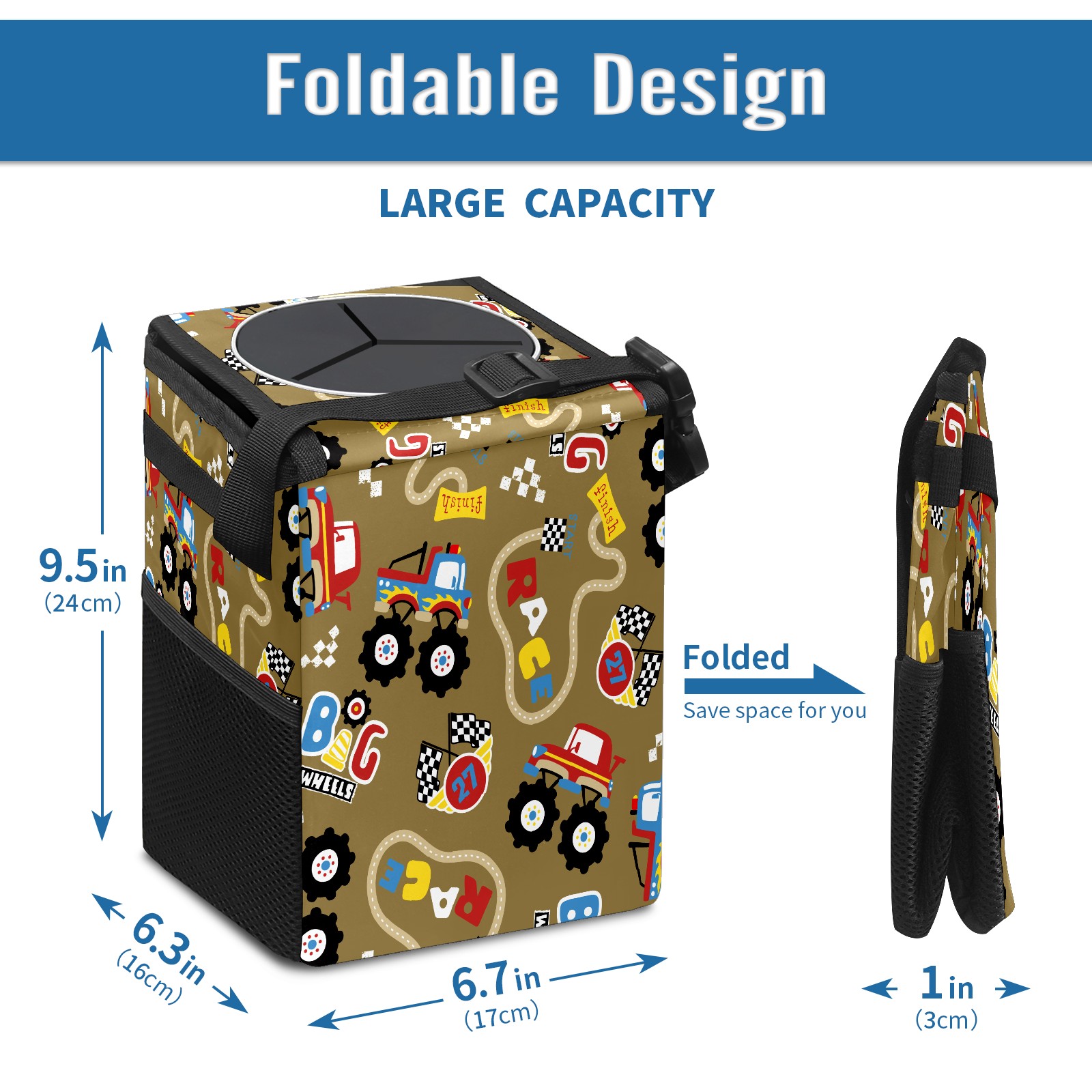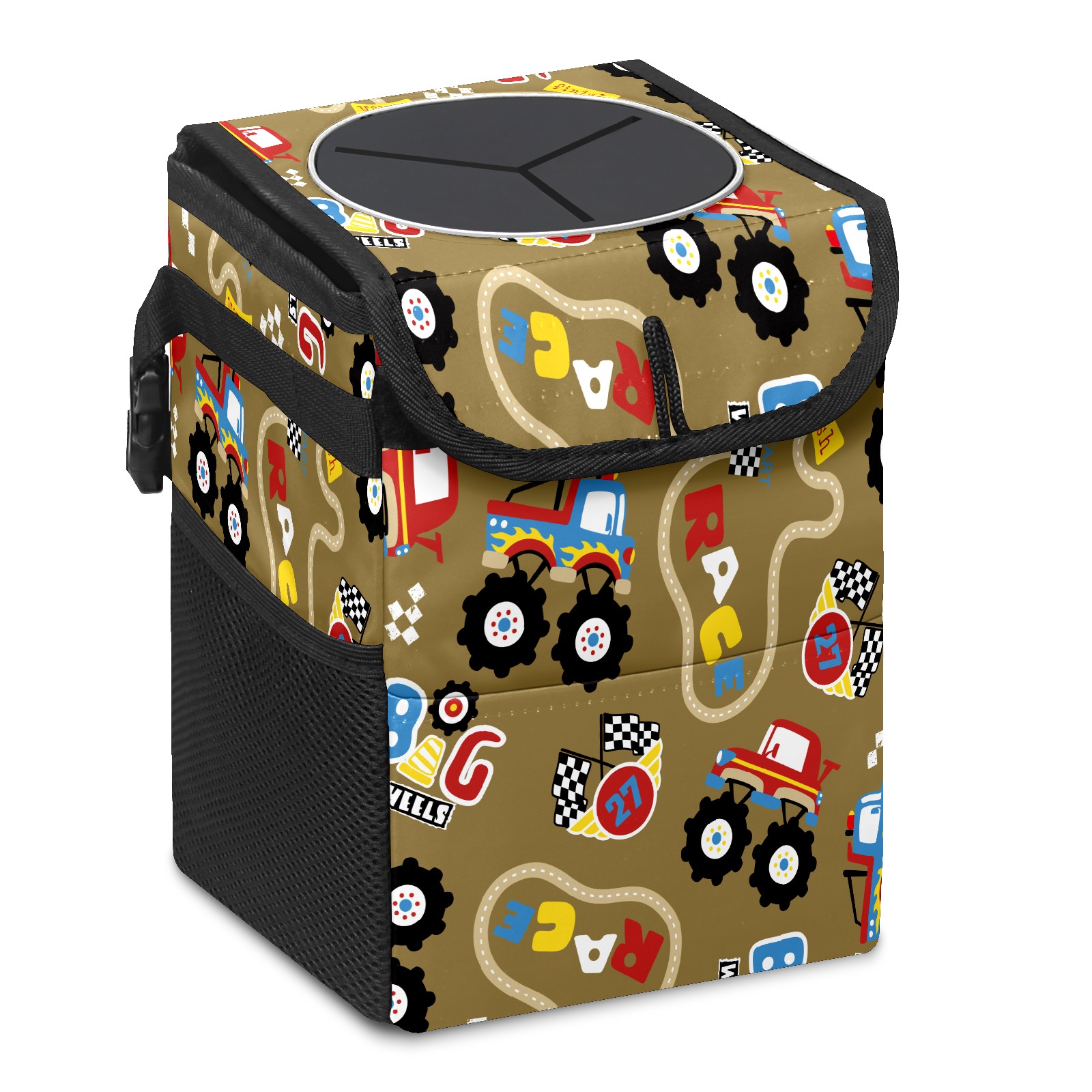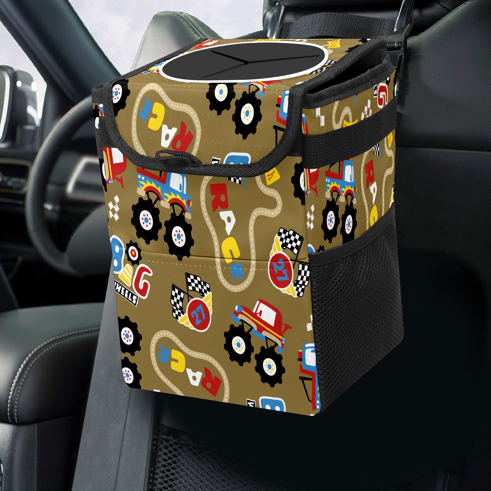 Car Garbage Can — Multi-functional, Lightweight Portable, Reusable Vehicle Trash Can, Waterproof with Sufficient Storage Capacity Vintage Retro Cartoon Monster Trucks Pattern