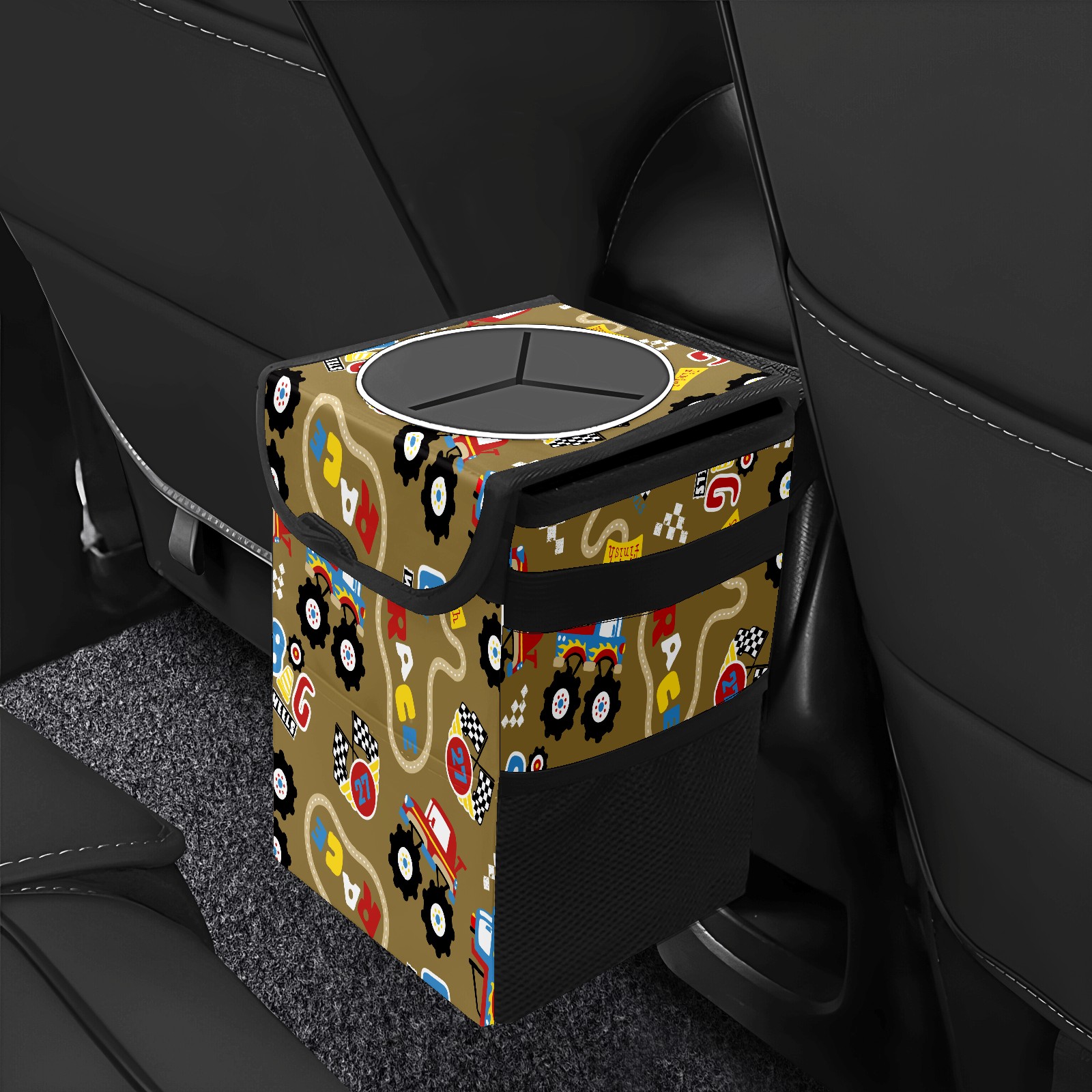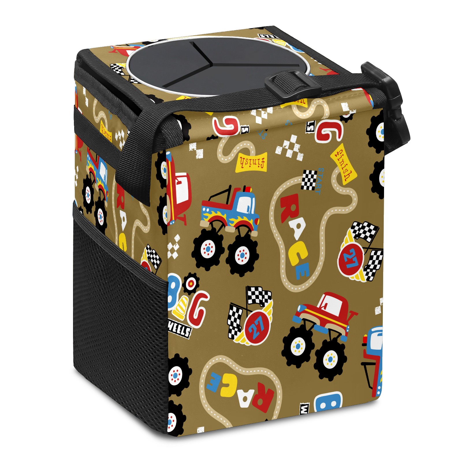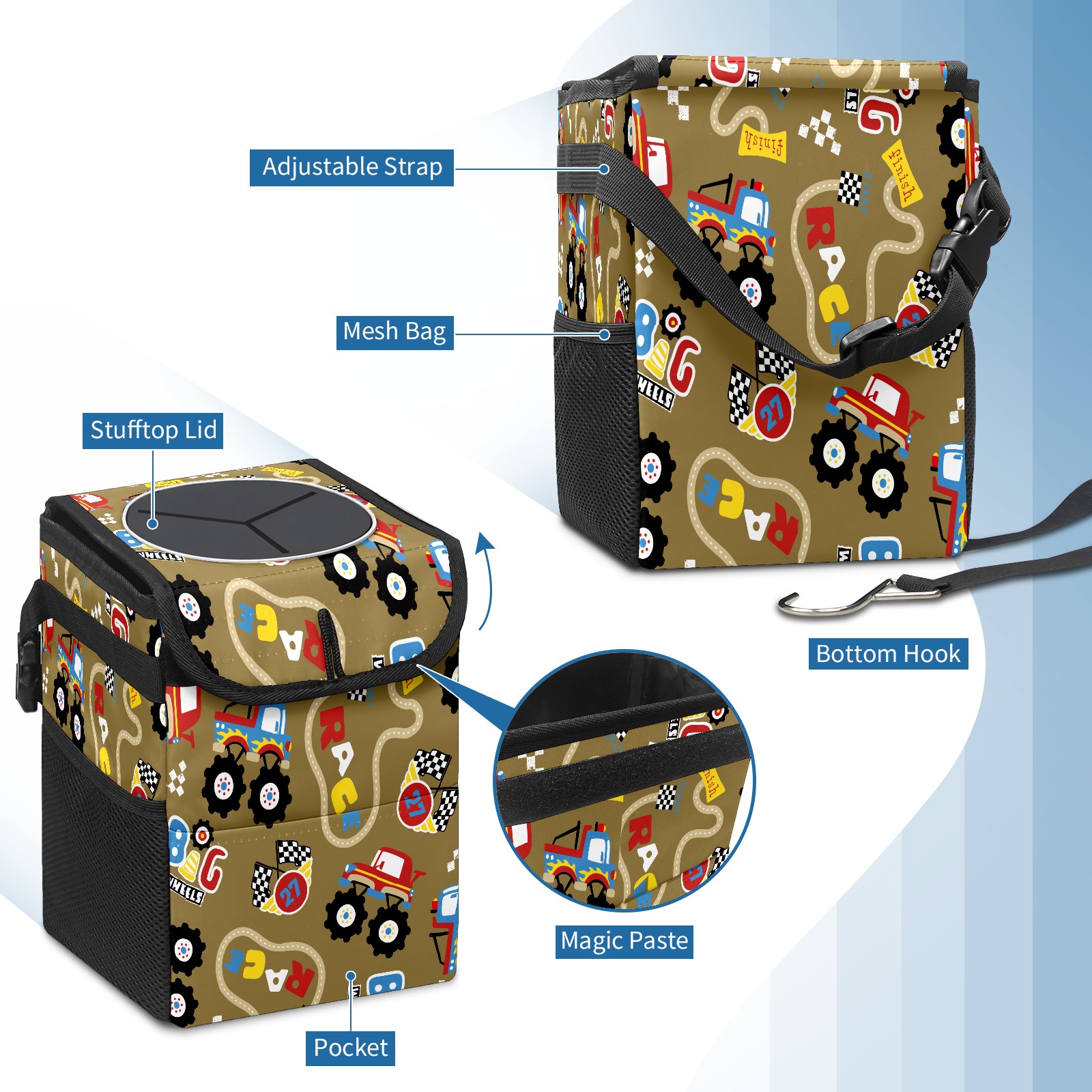 Car Garbage Can — Multi-functional, Lightweight Portable, Reusable Vehicle Trash Can, Waterproof with Sufficient Storage Capacity Vintage Retro Cartoon Monster Trucks Pattern