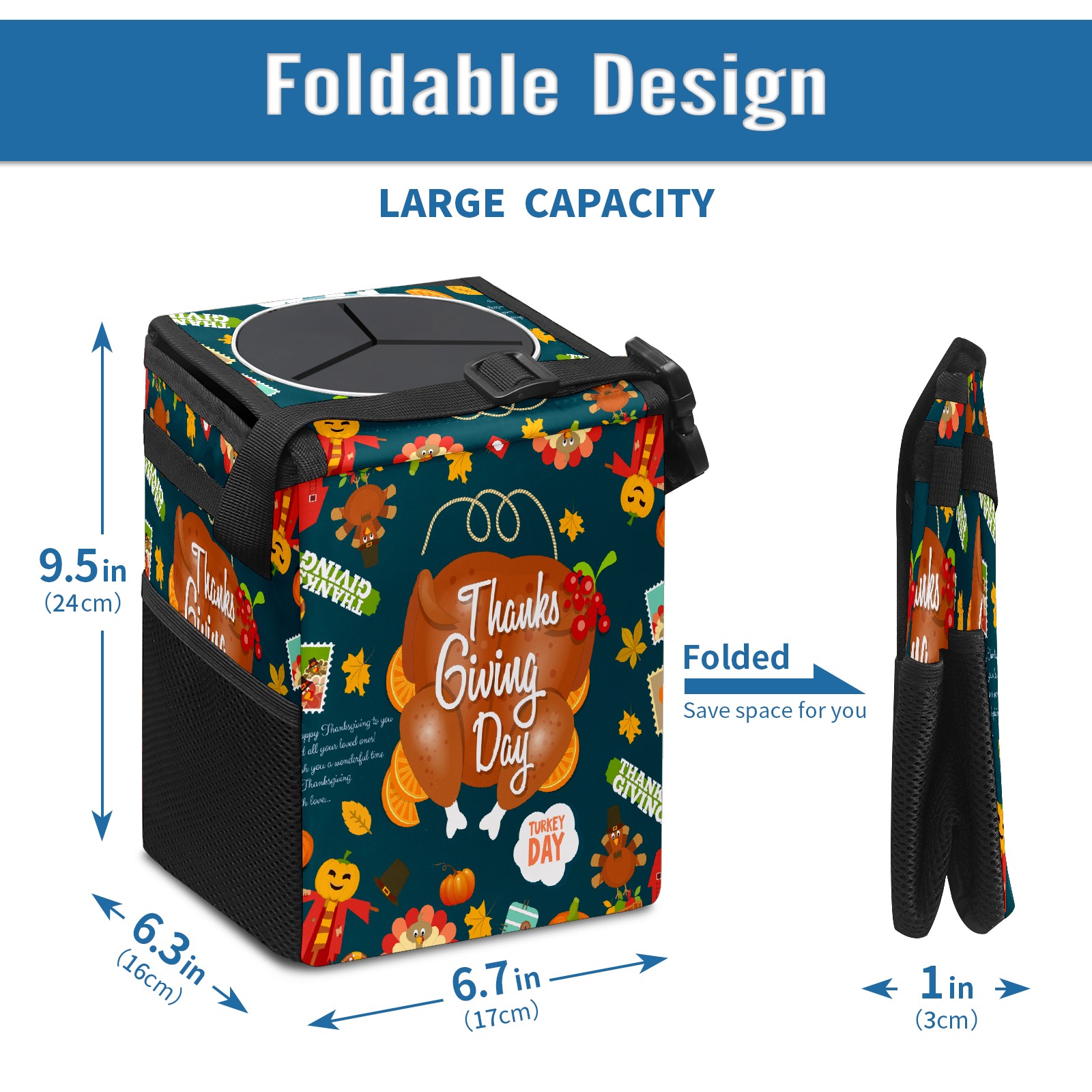 FOLDABLE & SPACE-SAVING Compact 9.5"×6.7"×6.3" size fits perfectly in any vehicle space Instantly folds flat when not in use - stores effortlessly under seats or in door pockets MULTI-FUNCTION ORGANIZER Large main compartment holds bottles, wrappers and tissues Additional pockets for wet wipes, masks or small accessories WATERPROOF & LEAKPROOF Made with premium leak-proof polyester material Contains messy spills from drinks, snacks, and food Wipe-clean surface resists stains and eliminates odors Package Includes 1× Car Trash Can