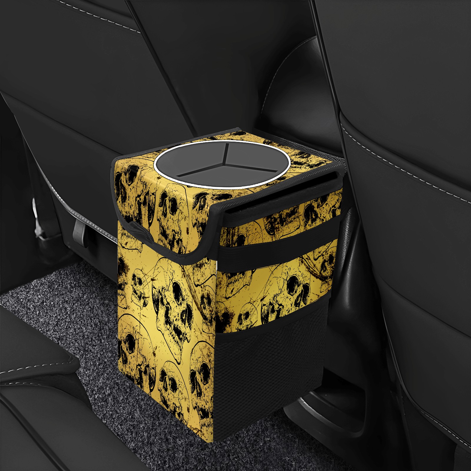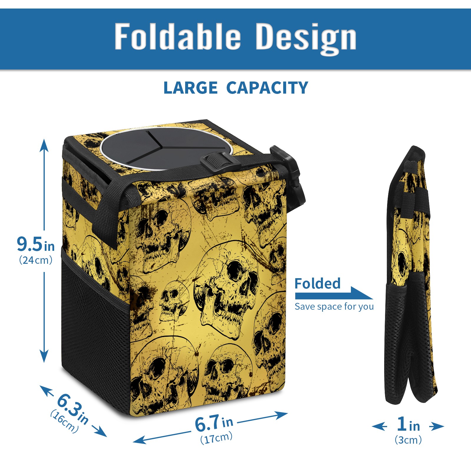 FOLDABLE & SPACE-SAVING Compact 9.5"×6.7"×6.3" size fits perfectly in any vehicle space Instantly folds flat when not in use - stores effortlessly under seats or in door pockets MULTI-FUNCTION ORGANIZER Large main compartment holds bottles, wrappers and tissues Additional pockets for wet wipes, masks or small accessories WATERPROOF & LEAKPROOF Made with premium leak-proof polyester material Contains messy spills from drinks, snacks, and food Wipe-clean surface resists stains and eliminates odors Package Includes 1× Car Trash Can