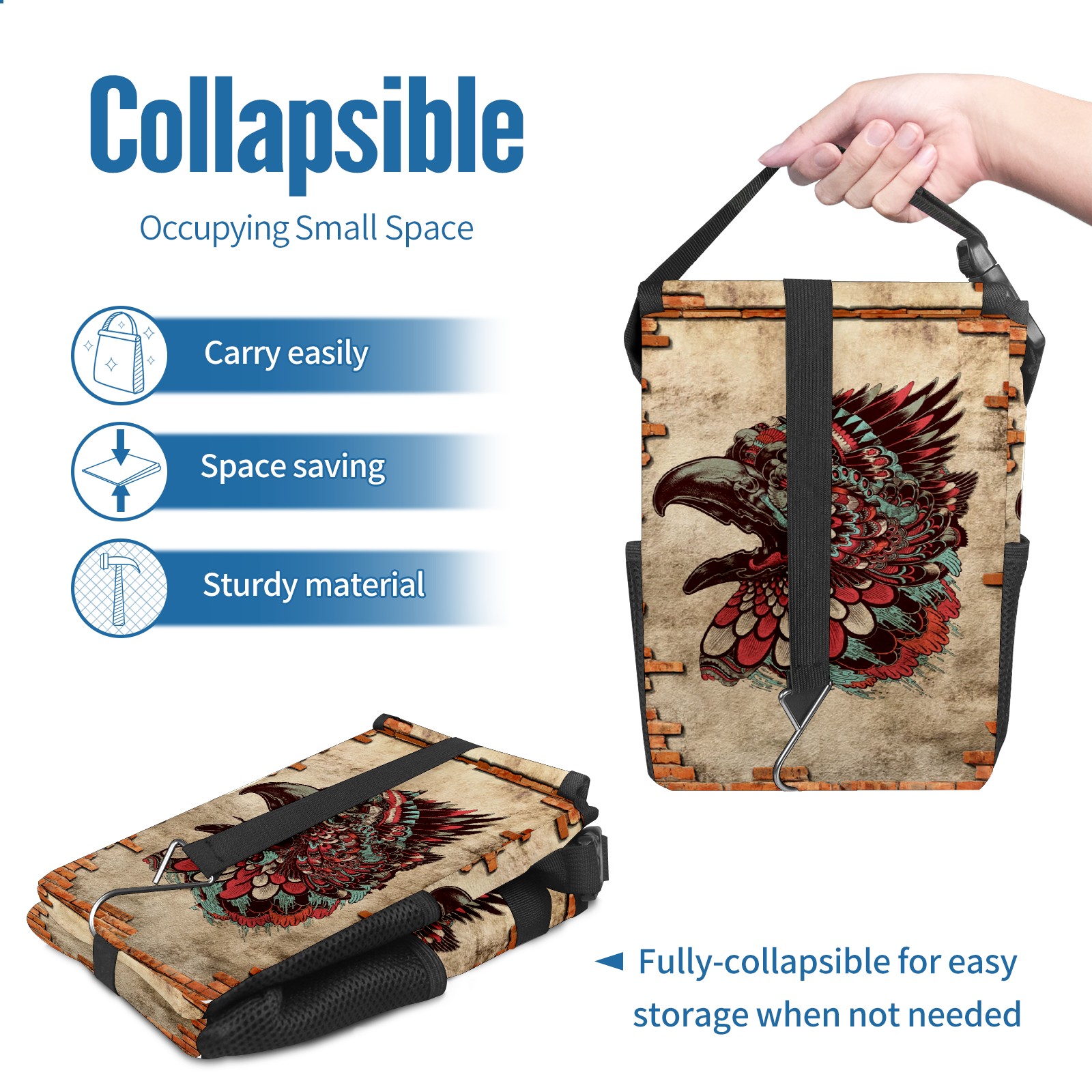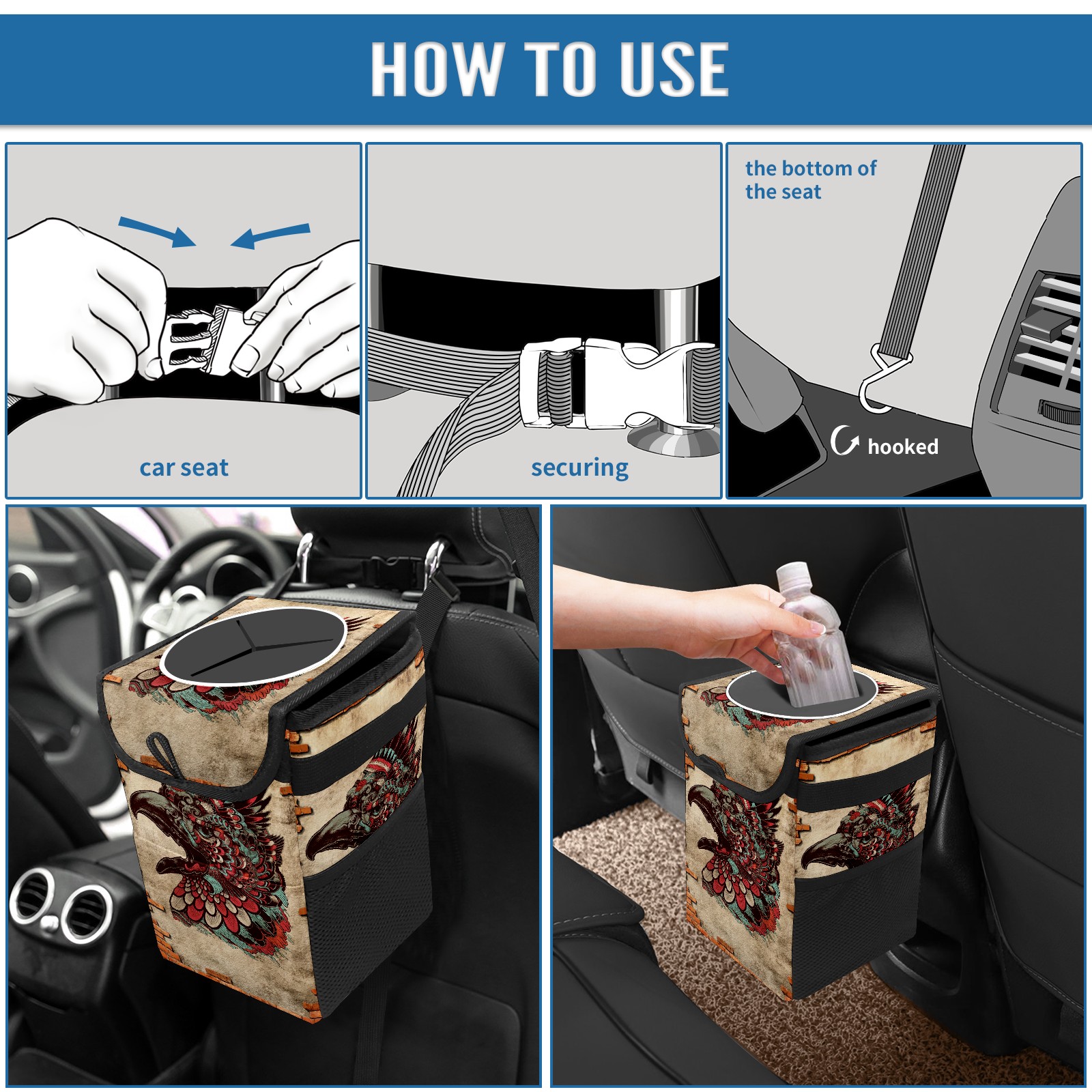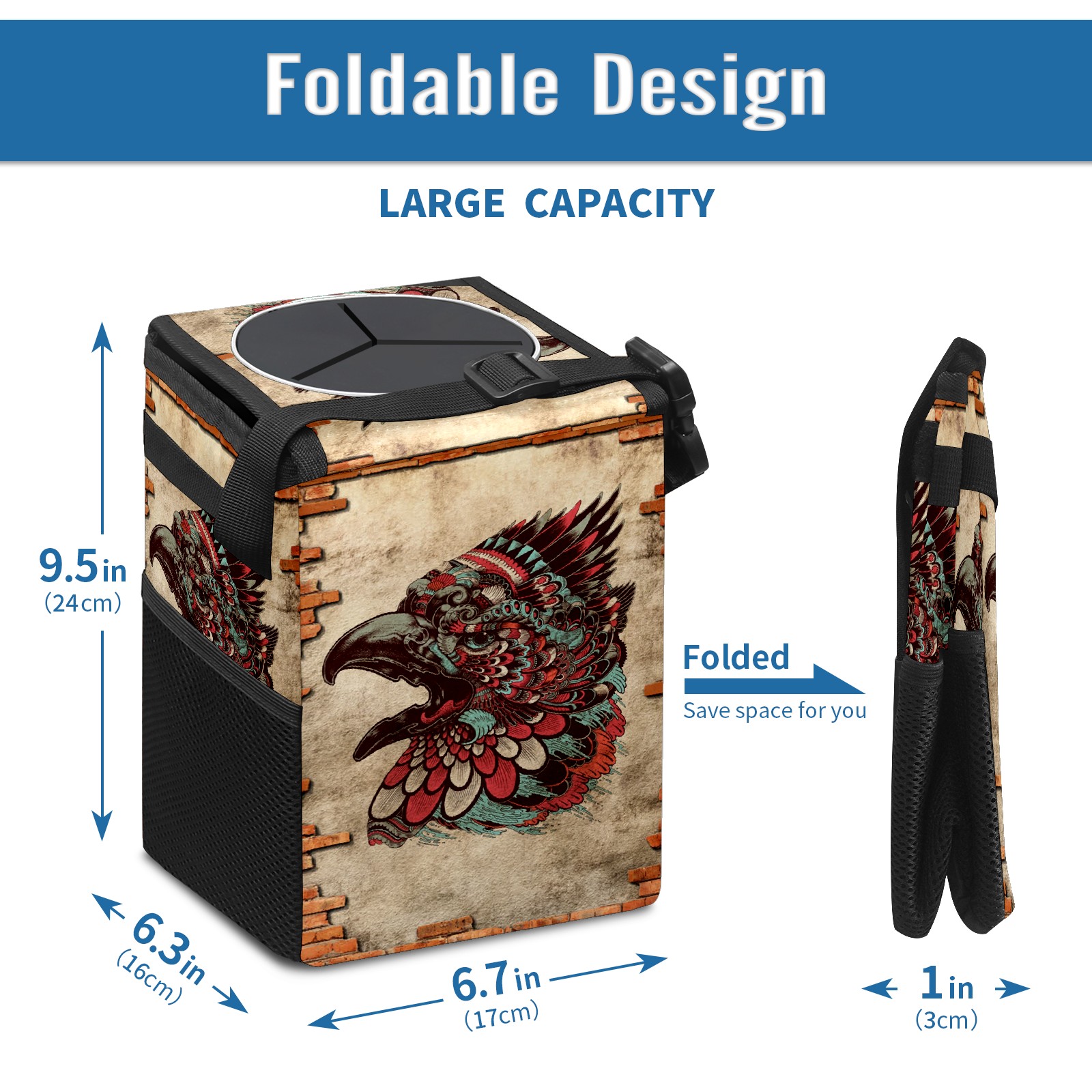 FOLDABLE & SPACE-SAVING Compact 9.5"×6.7"×6.3" size fits perfectly in any vehicle space Instantly folds flat when not in use - stores effortlessly under seats or in door pockets MULTI-FUNCTION ORGANIZER Large main compartment holds bottles, wrappers and tissues Additional pockets for wet wipes, masks or small accessories WATERPROOF & LEAKPROOF Made with premium leak-proof polyester material Contains messy spills from drinks, snacks, and food Wipe-clean surface resists stains and eliminates odors Package Includes 1× Car Trash Can