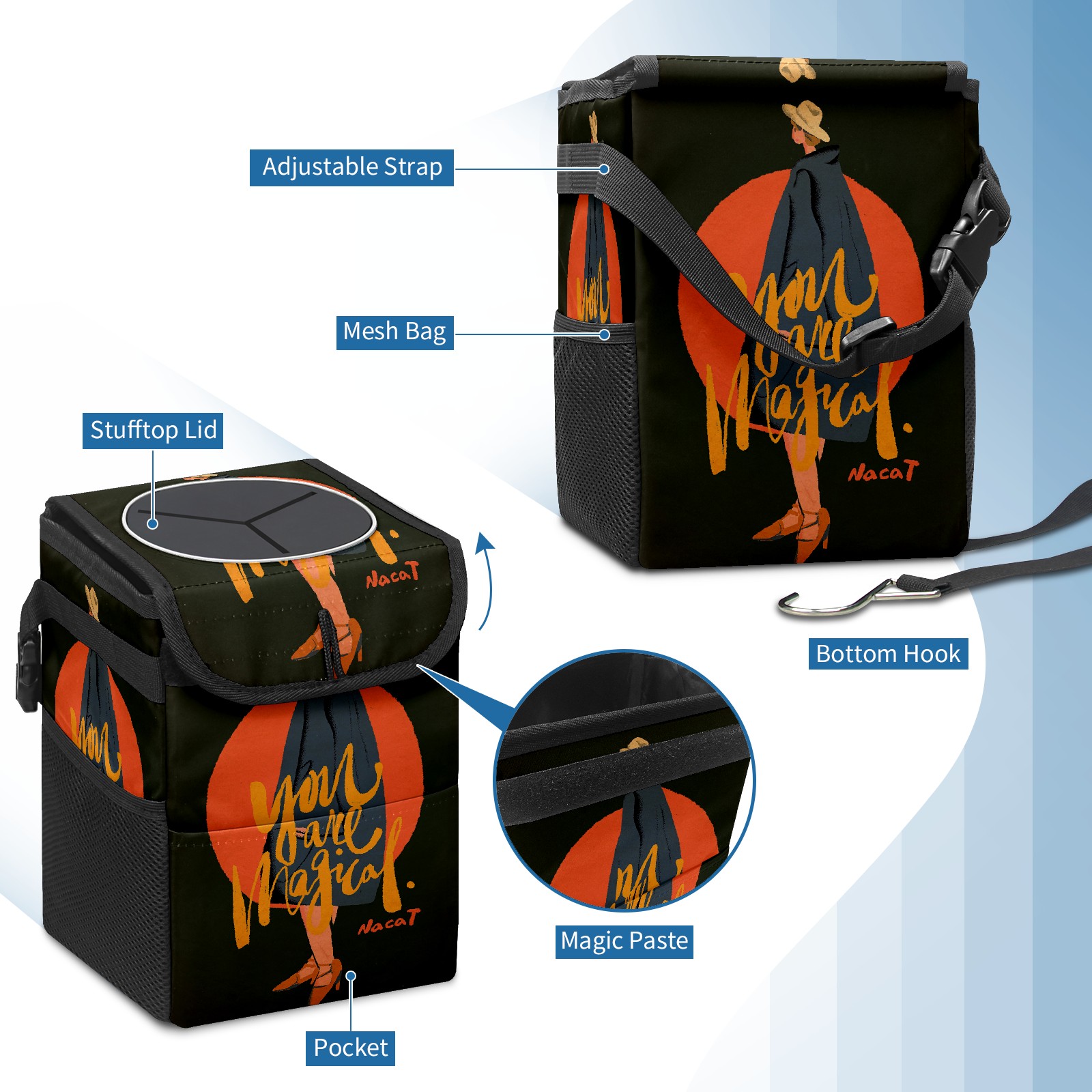 FOLDABLE & SPACE-SAVING Compact 9.5"×6.7"×6.3" size fits perfectly in any vehicle space Instantly folds flat when not in use - stores effortlessly under seats or in door pockets MULTI-FUNCTION ORGANIZER Large main compartment holds bottles, wrappers and tissues Additional pockets for wet wipes, masks or small accessories WATERPROOF & LEAKPROOF Made with premium leak-proof polyester material Contains messy spills from drinks, snacks, and food Wipe-clean surface resists stains and eliminates odors Package Includes 1× Car Trash Can