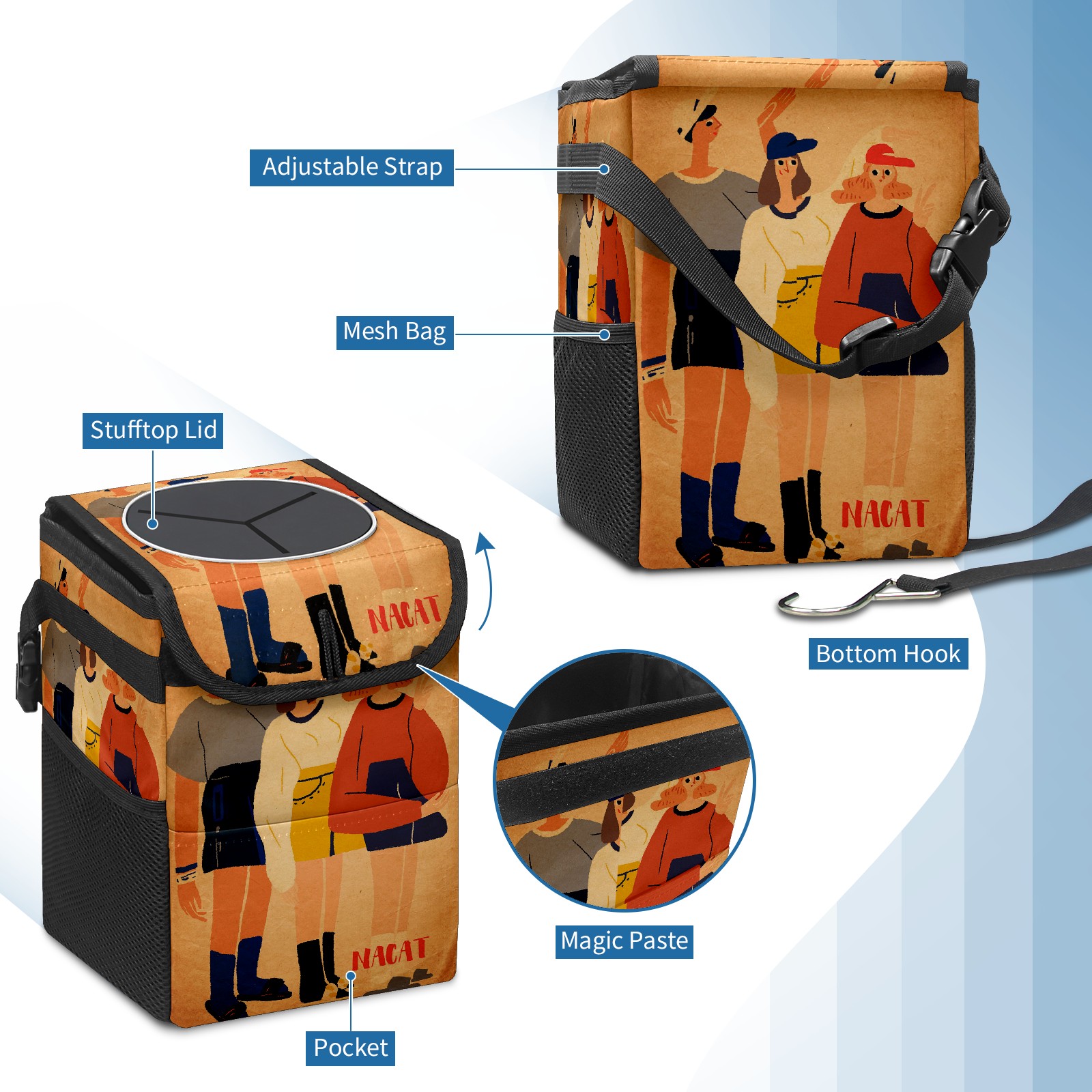 • FOLDABLE & SPACE-SAVING Compact 9.5"×6.7"×6.3" size fits perfectly in any vehicle space Instantly folds flat when not in use - stores effortlessly under seats or in door pockets MULTI-FUNCTION ORGANIZER Large main compartment holds bottles, wrappers and tissues Additional pockets for wet wipes, masks or small accessories WATERPROOF & LEAKPROOF Made with premium leak-proof polyester material Contains messy spills from drinks, snacks, and food Wipe-clean surface resists stains and eliminates odors Package Includes 1× Car Trash Can