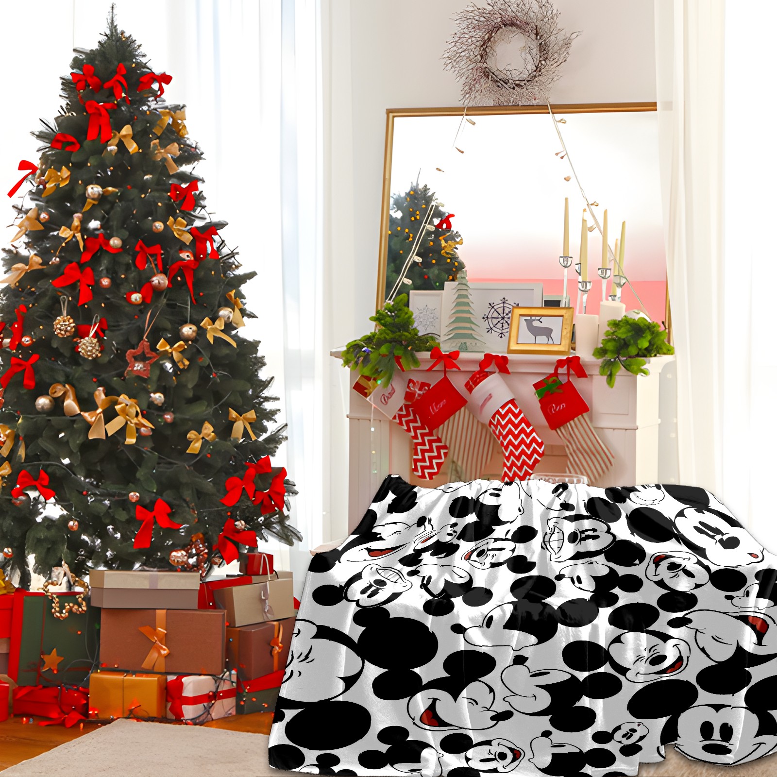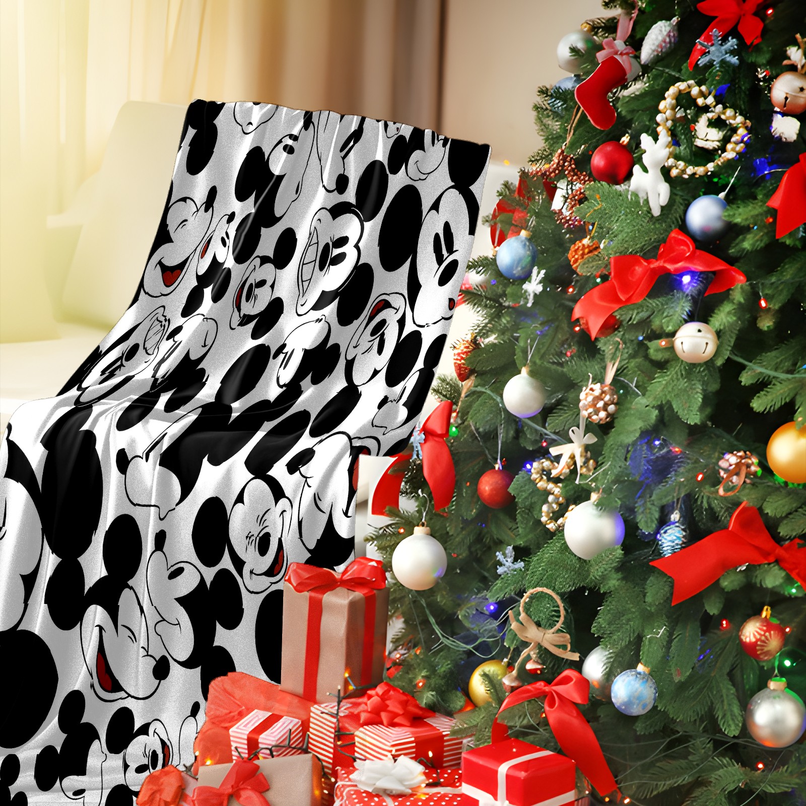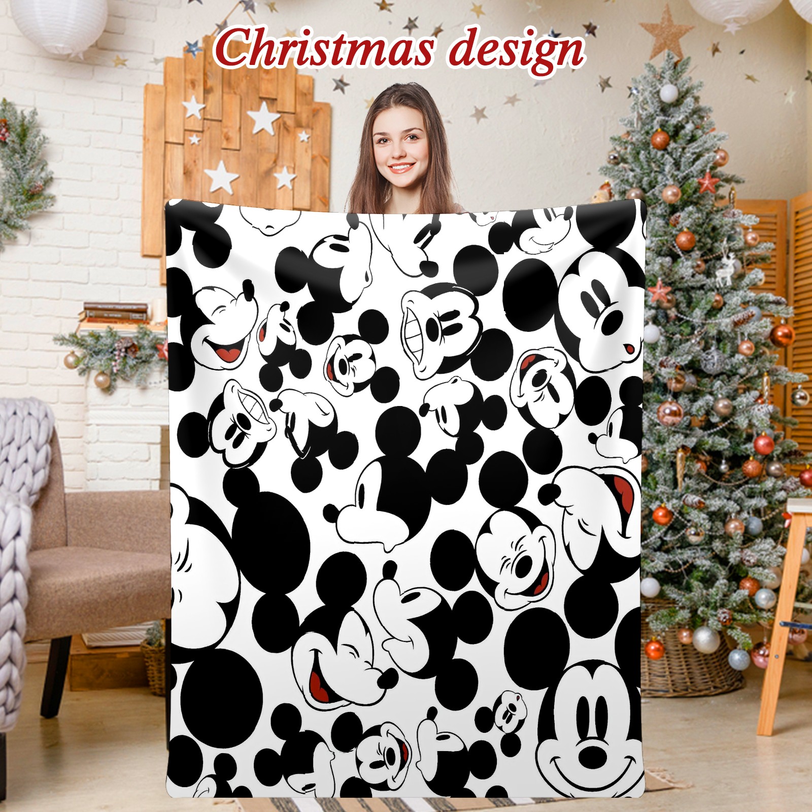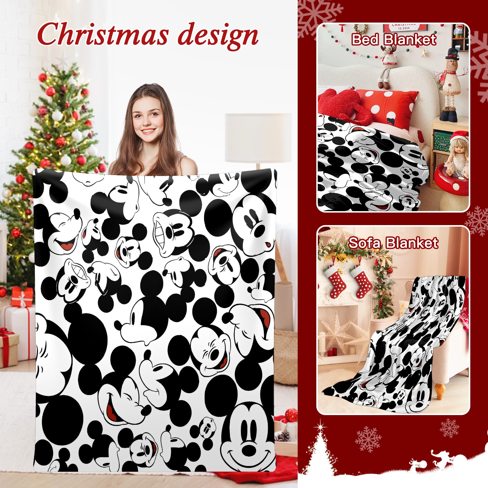 Премиальная фланелевая одеяло Happy Mickey Mouse Black White