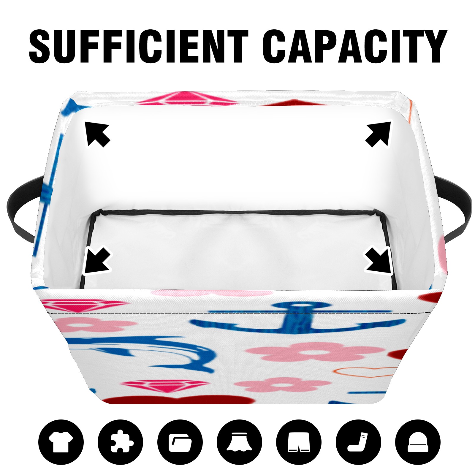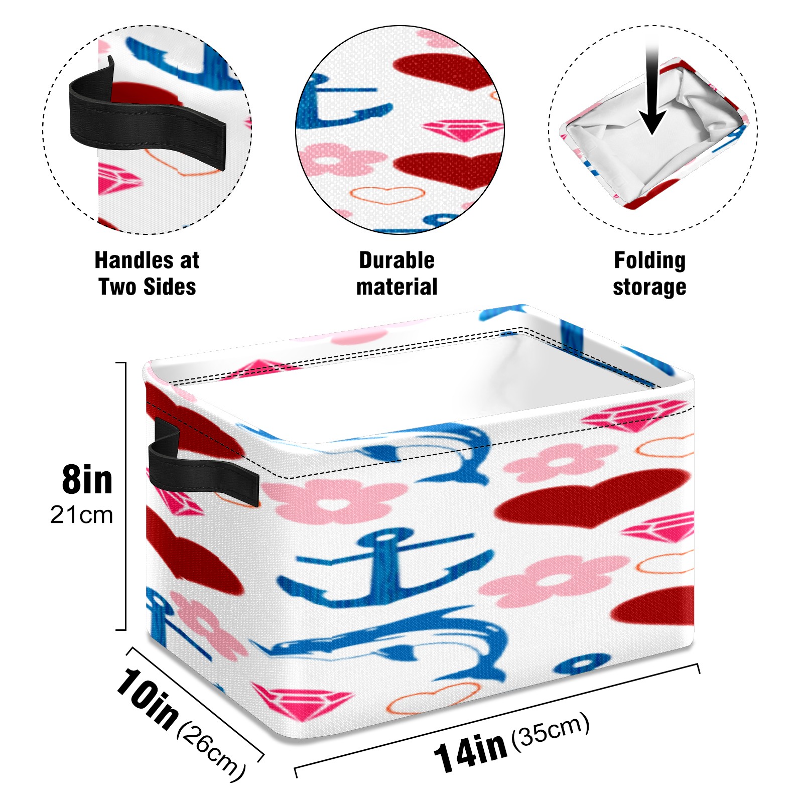 【Материал】Оксфордская ткань из полиэстера 600D; ручки изготовлены из полиэстера. 【Описание материала】Внешняя ткань: Оксфордская ткань полотняного переплетения высокой плотности 300D (ПВХ); Подкладка: белая ткань 750D; Ручки: черная композитная ткань 290T. 【Размер】26x35x21 см (10x14x8 дюймов) 【Описание продукта】Эта корзина для хранения с ручками с обеих сторон предлагает достаточно места для хранения предметов разных размеров, что делает ее подходящей для различных случаев, таких как дом, офис и школа. Ручки с обеих сторон закреплены гвоздями для долговечности. Прочный металлический каркас окружает корзину, поддерживая ее форму. Складная корзина для хранения: Наши корзины для хранения легко складываются, когда не используются. Эти ящики для хранения изготовлены из легко моющейся оксфордской ткани и при необходимости могут быть аккуратно протерты мягким мылом и водой. Из-за внутреннего металлического каркаса и жесткого дна машинная стирка не рекомендуется. 【Подходящие сценарии использования】Дом, офис и школа 【Инструкции по стирке】Рекомендуется ручная стирка; избегайте длительного воздействия прямых солнечных лучей.