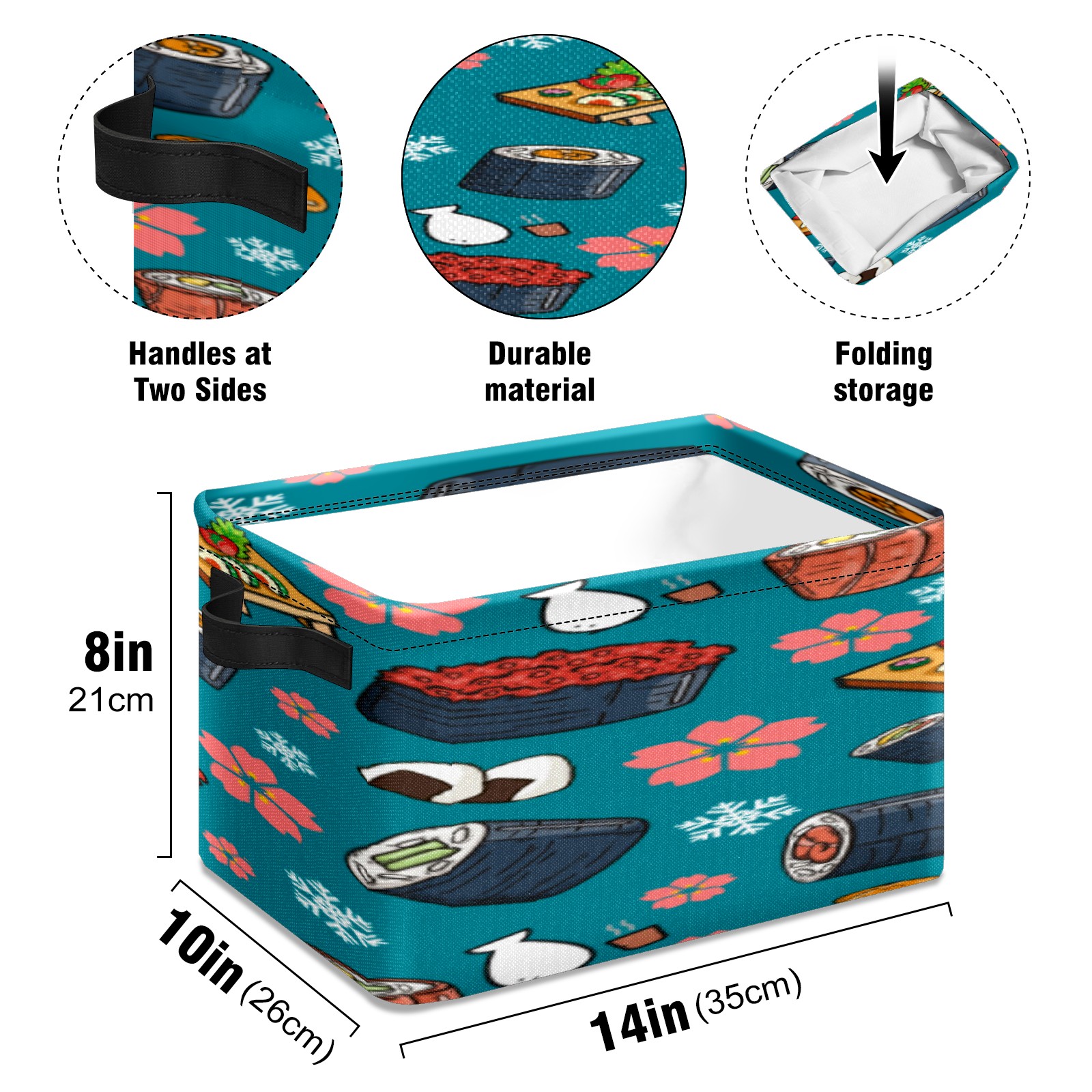 【Материал】Оксфордская ткань из полиэстера 600D; ручки изготовлены из полиэстера. 【Описание материала】Внешняя ткань: Оксфордская ткань полотняного переплетения высокой плотности 300D (ПВХ); Подкладка: белая ткань 750D; Ручки: черная композитная ткань 290T. 【Размер】26x35x21 см (10x14x8 дюймов) 【Описание продукта】Эта корзина для хранения с ручками с обеих сторон предлагает достаточно места для хранения предметов разных размеров, что делает ее подходящей для различных случаев, таких как дом, офис и школа. Ручки с обеих сторон закреплены гвоздями для долговечности. Прочный металлический каркас окружает корзину, поддерживая ее форму. Складная корзина для хранения: Наши корзины для хранения легко складываются, когда не используются. Эти ящики для хранения изготовлены из легко моющейся оксфордской ткани и при необходимости могут быть аккуратно протерты мягким мылом и водой. Из-за внутреннего металлического каркаса и жесткого дна машинная стирка не рекомендуется. 【Подходящие сценарии использования】Дом, офис и школа 【Инструкции по стирке】Рекомендуется ручная стирка; избегайте длительного воздействия прямых солнечных лучей.