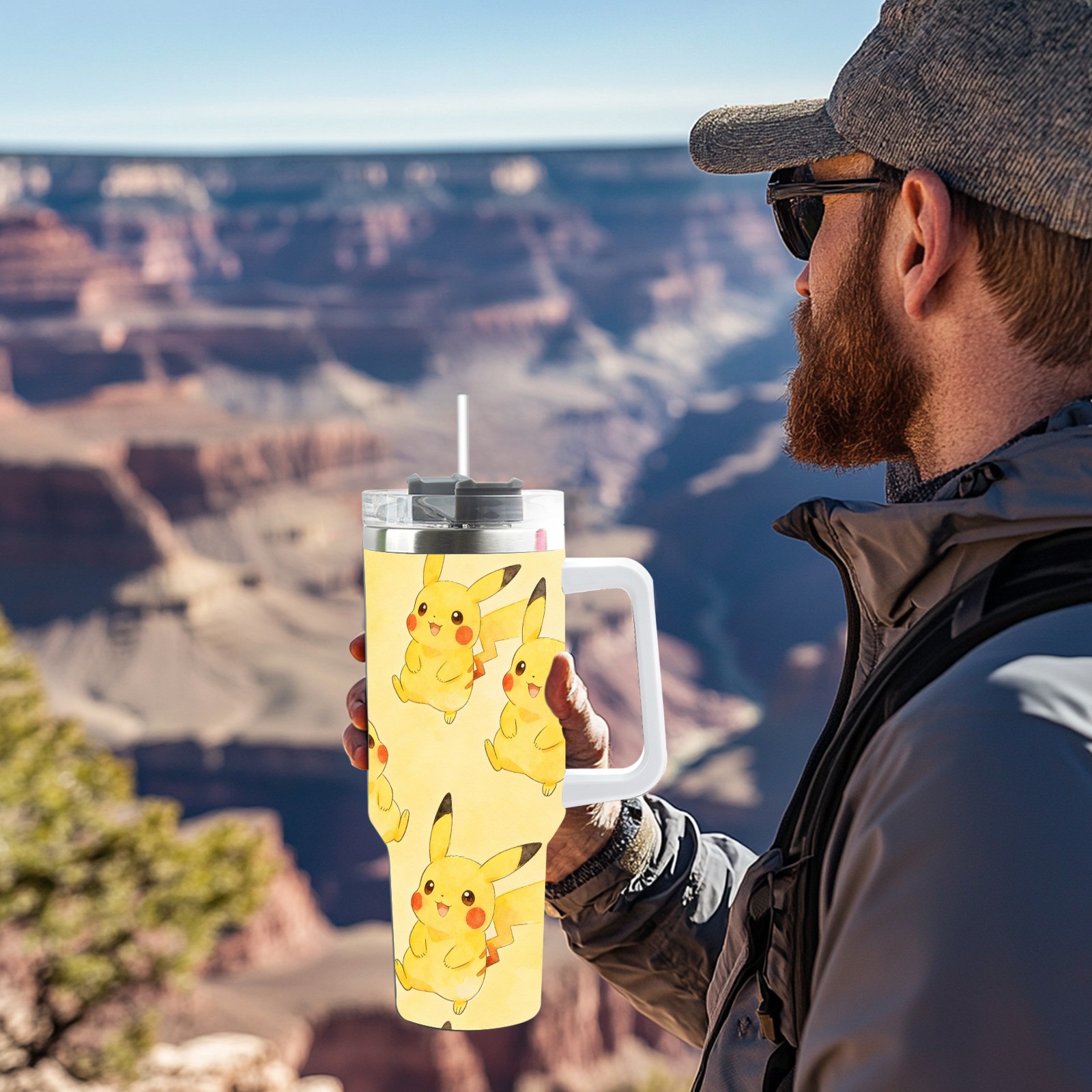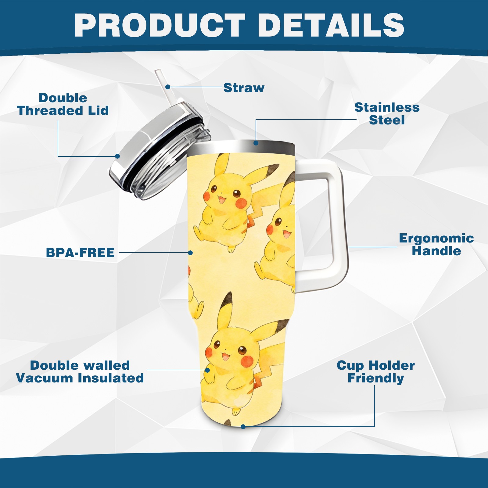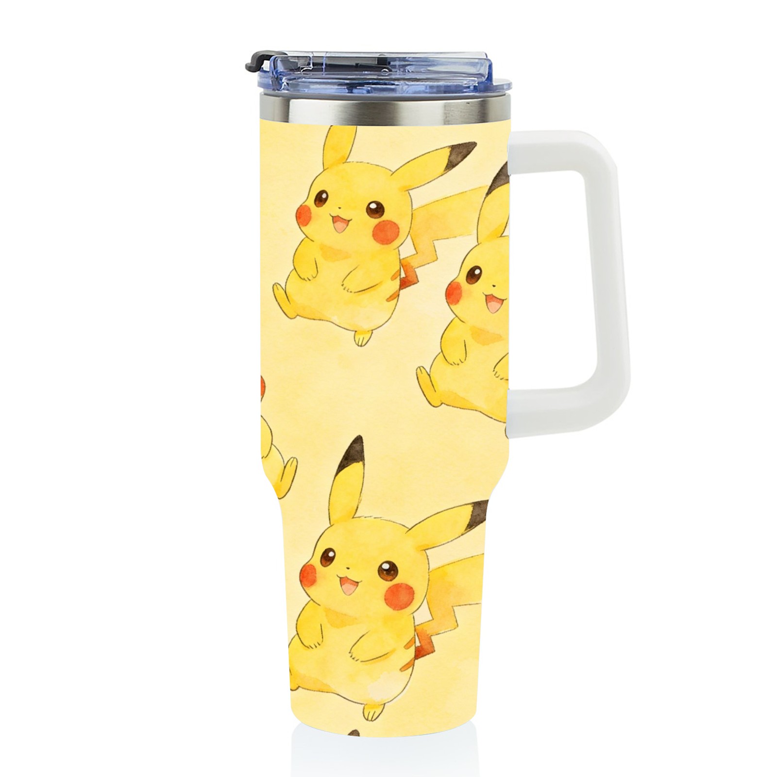 40oz Pikachu Fun thermos with lid and straw, leak-proof stainless steel, with handle, spill-proof bottle, convenient for travel(white)