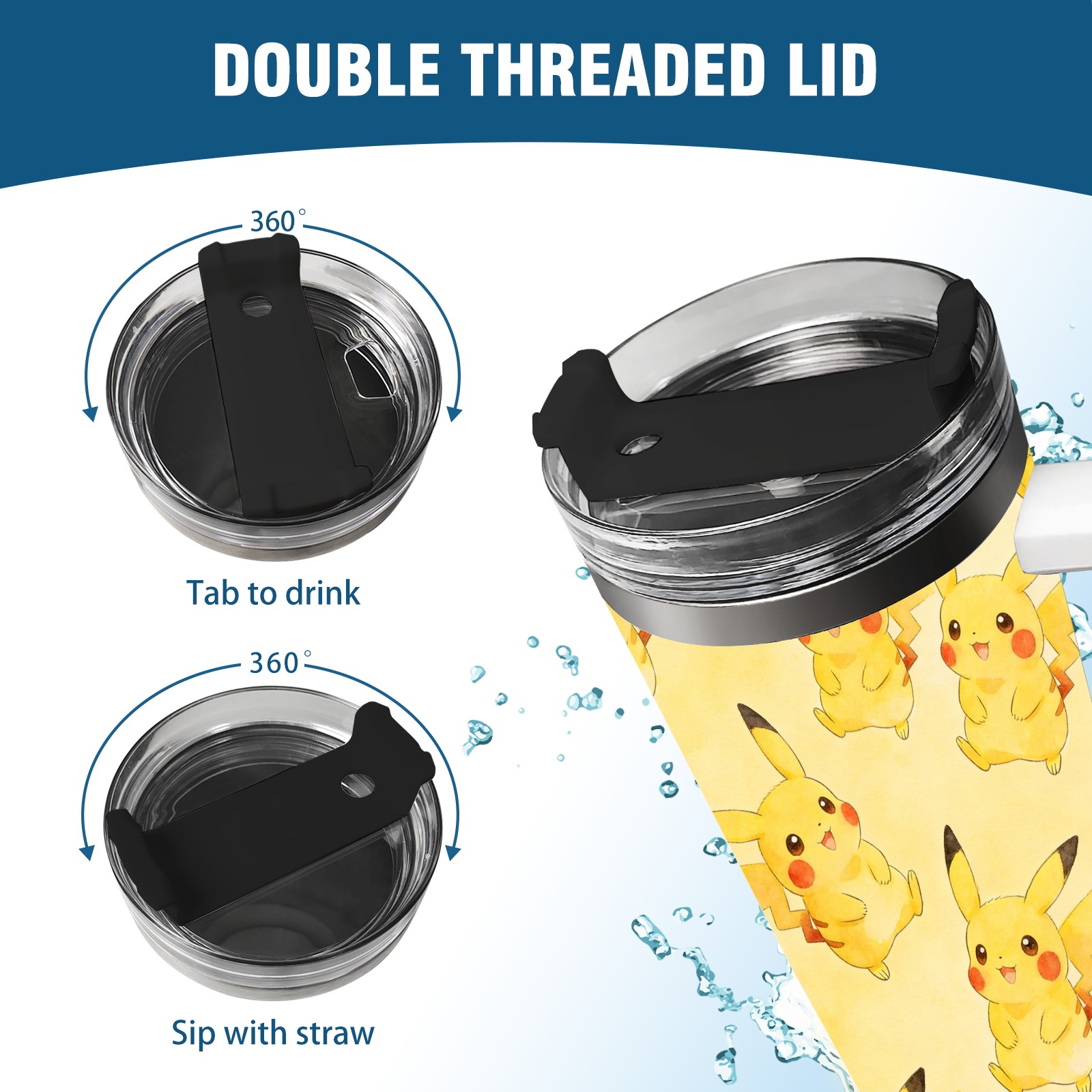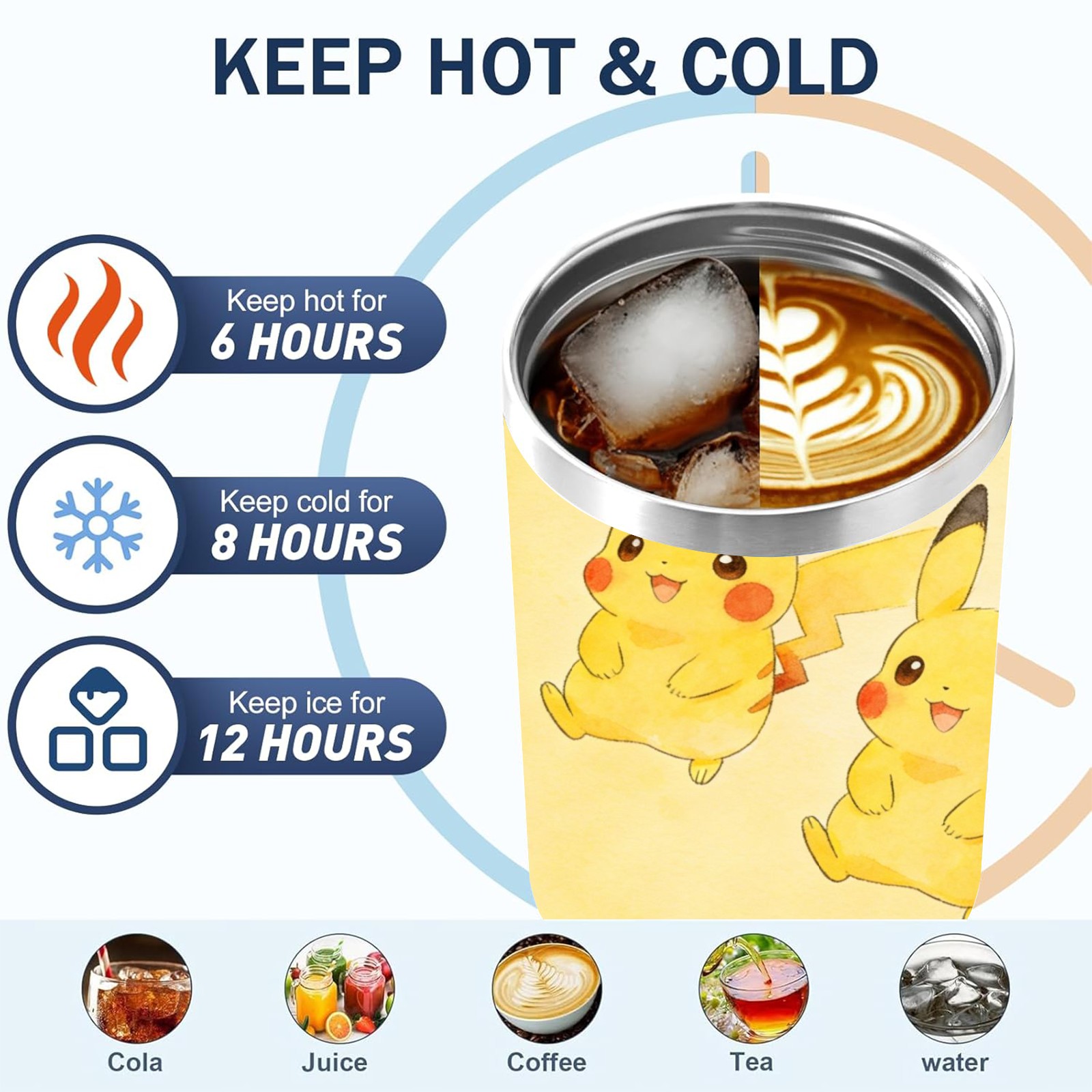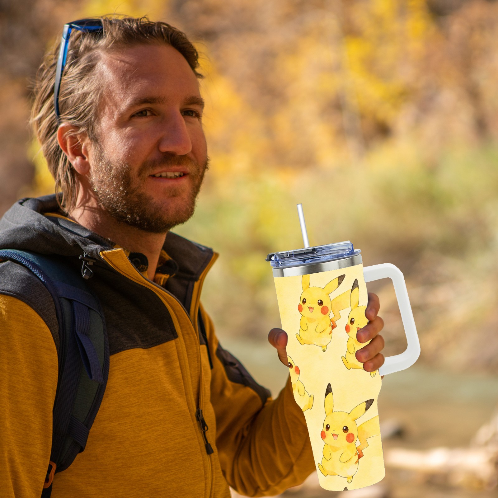 40oz Pikachu Fun thermos with lid and straw, leak-proof stainless steel, with handle, spill-proof bottle, convenient for travel(white)