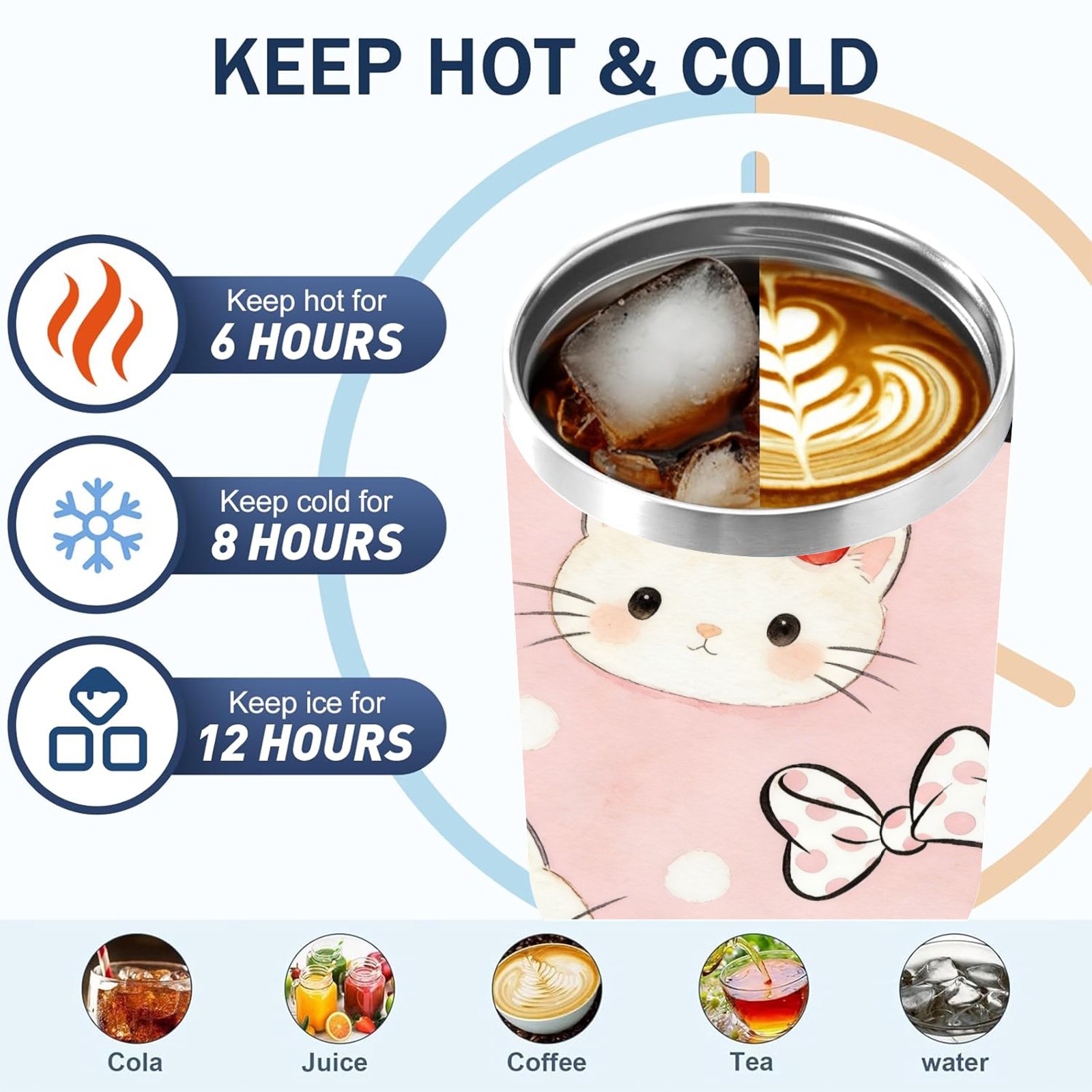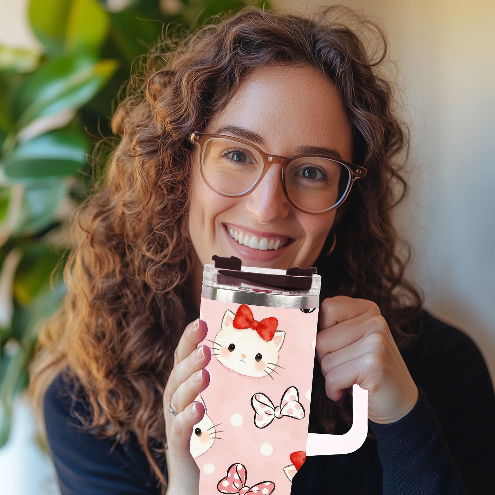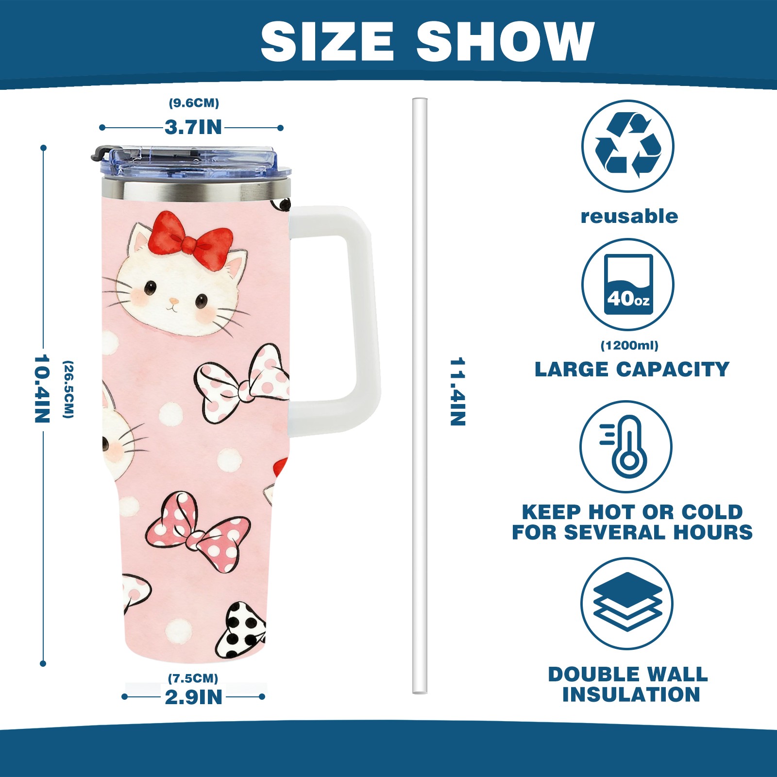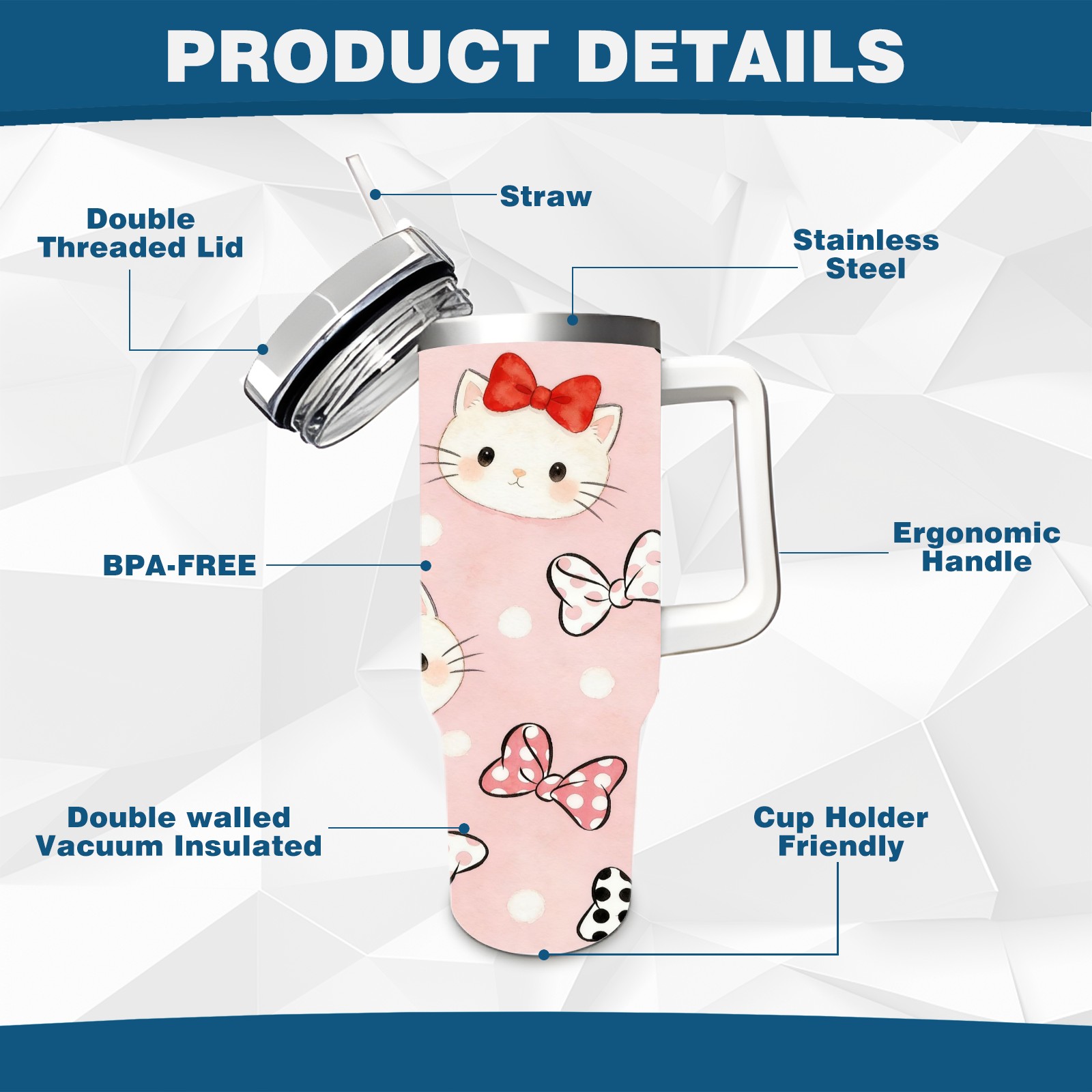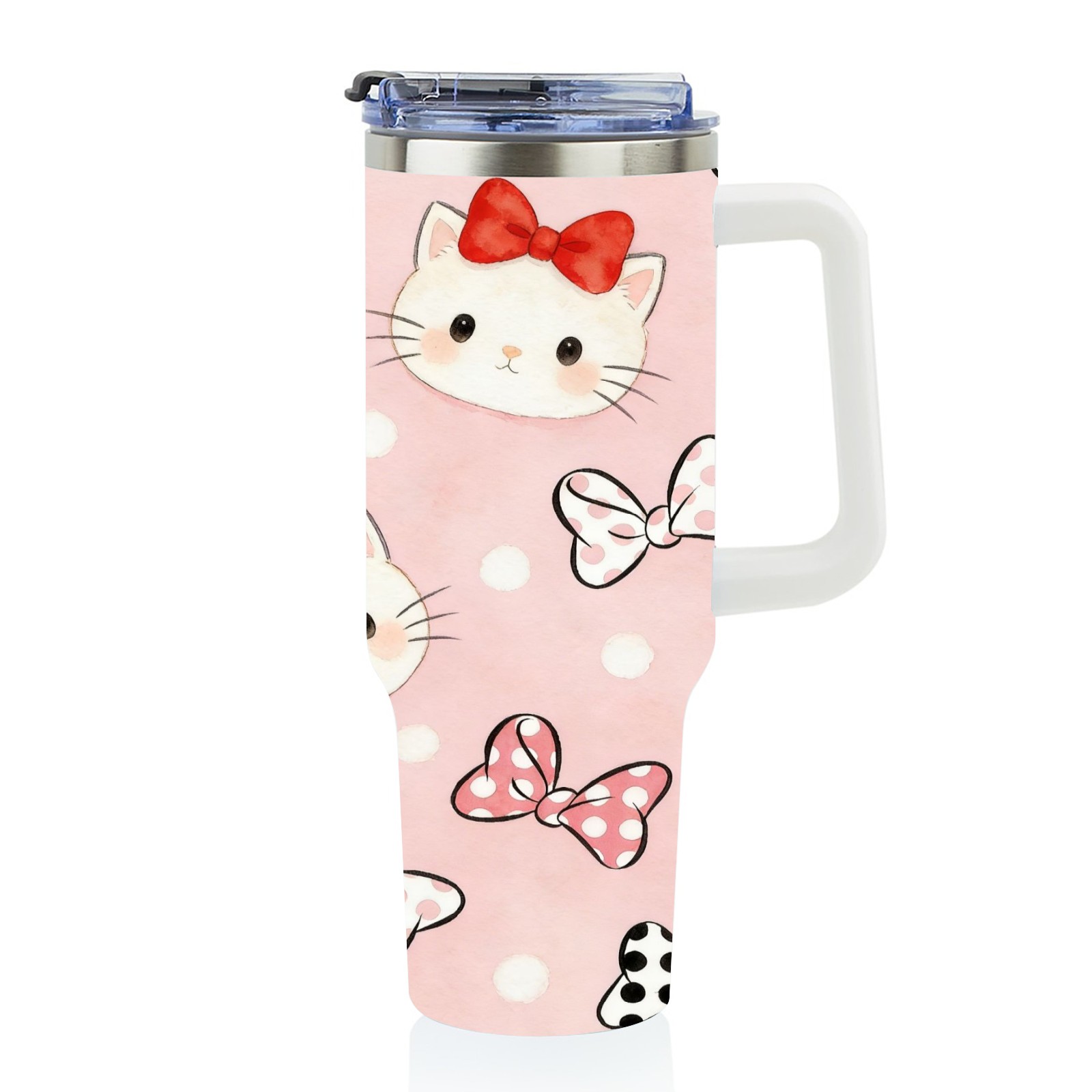 40oz Kitty Bows thermos with lid and straw, leak-proof stainless steel, with handle, spill-proof bottle, convenient for travel(white)