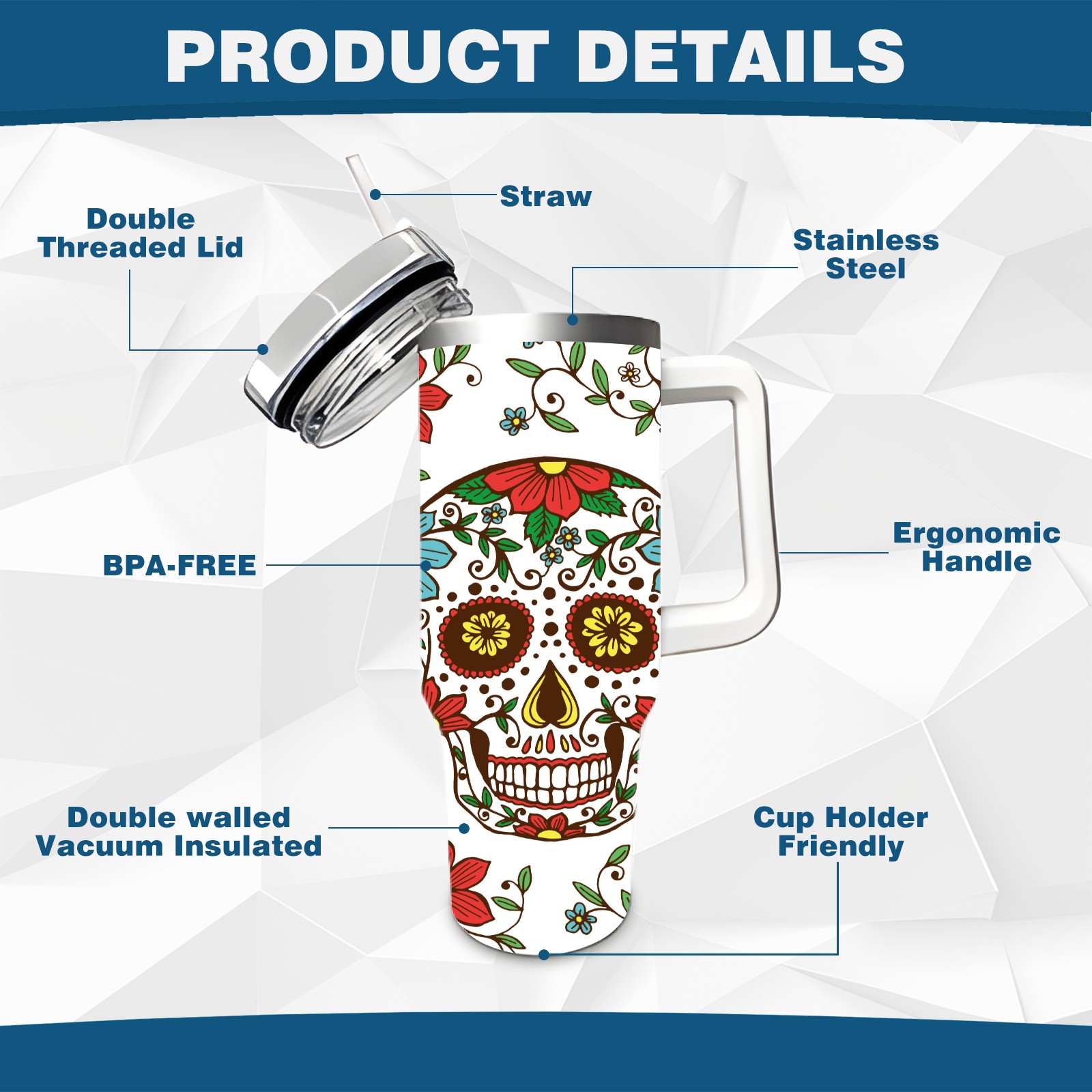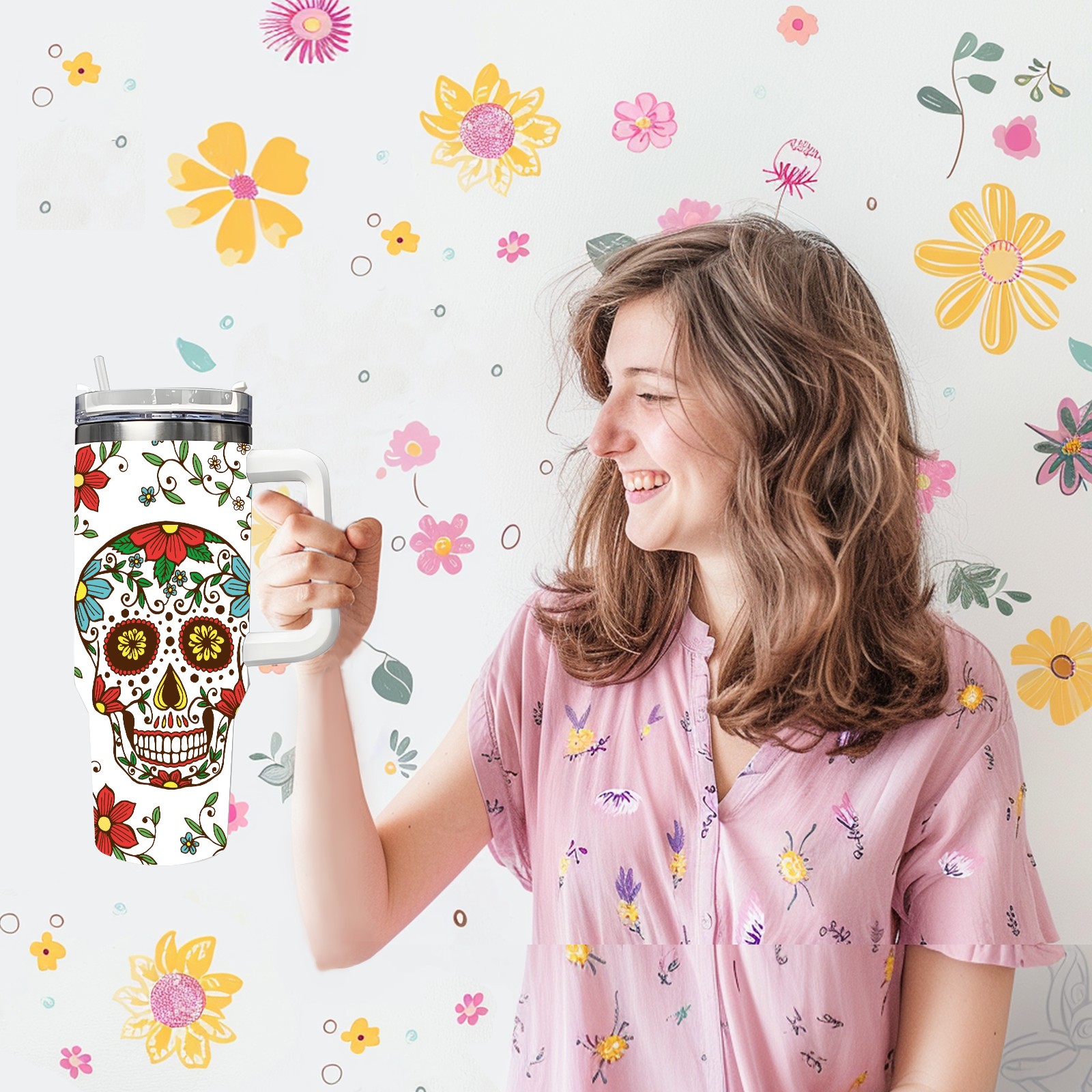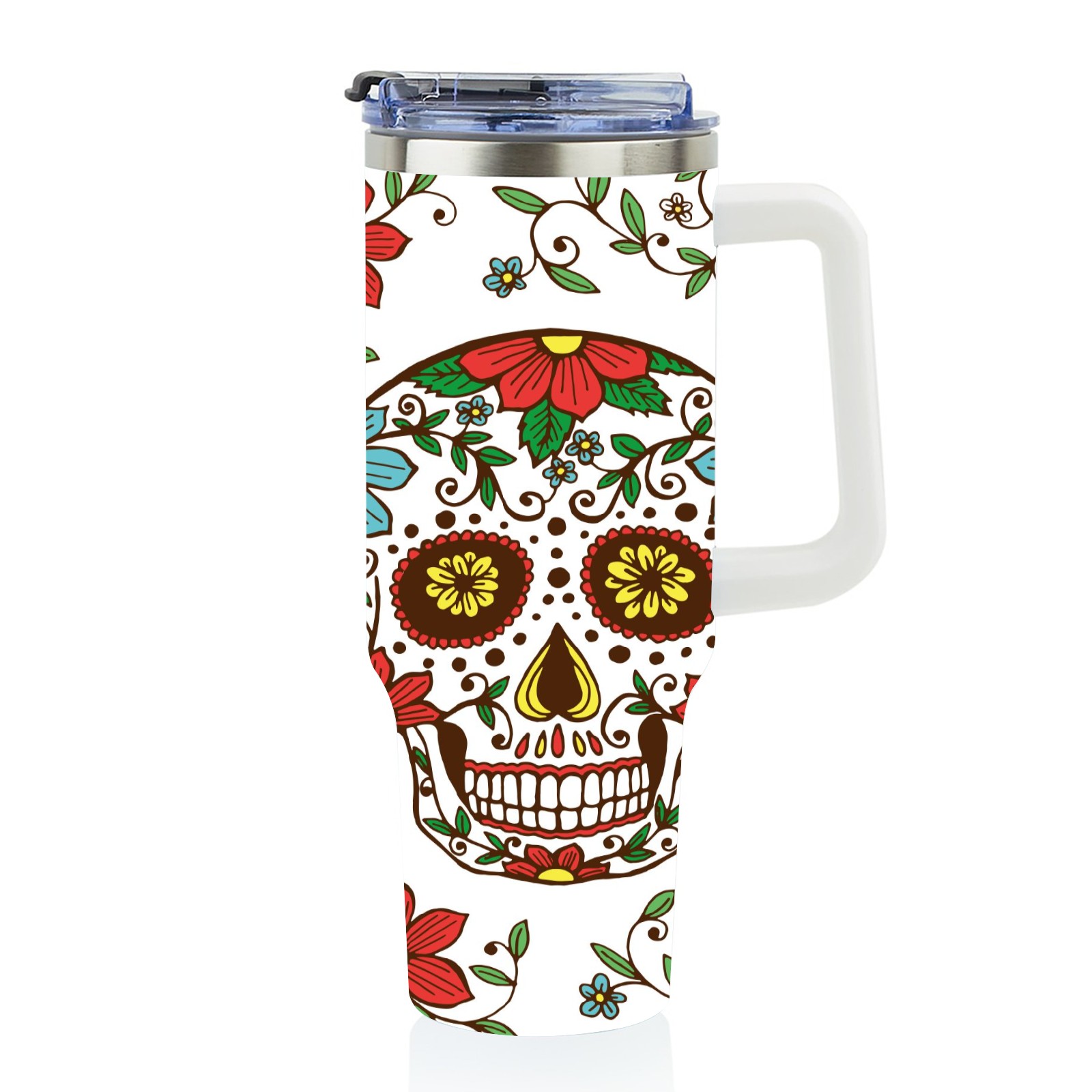 40 унций полностью напечатанный автомобильный стакан Sugar Skulls And Flowers Day Of The Dead