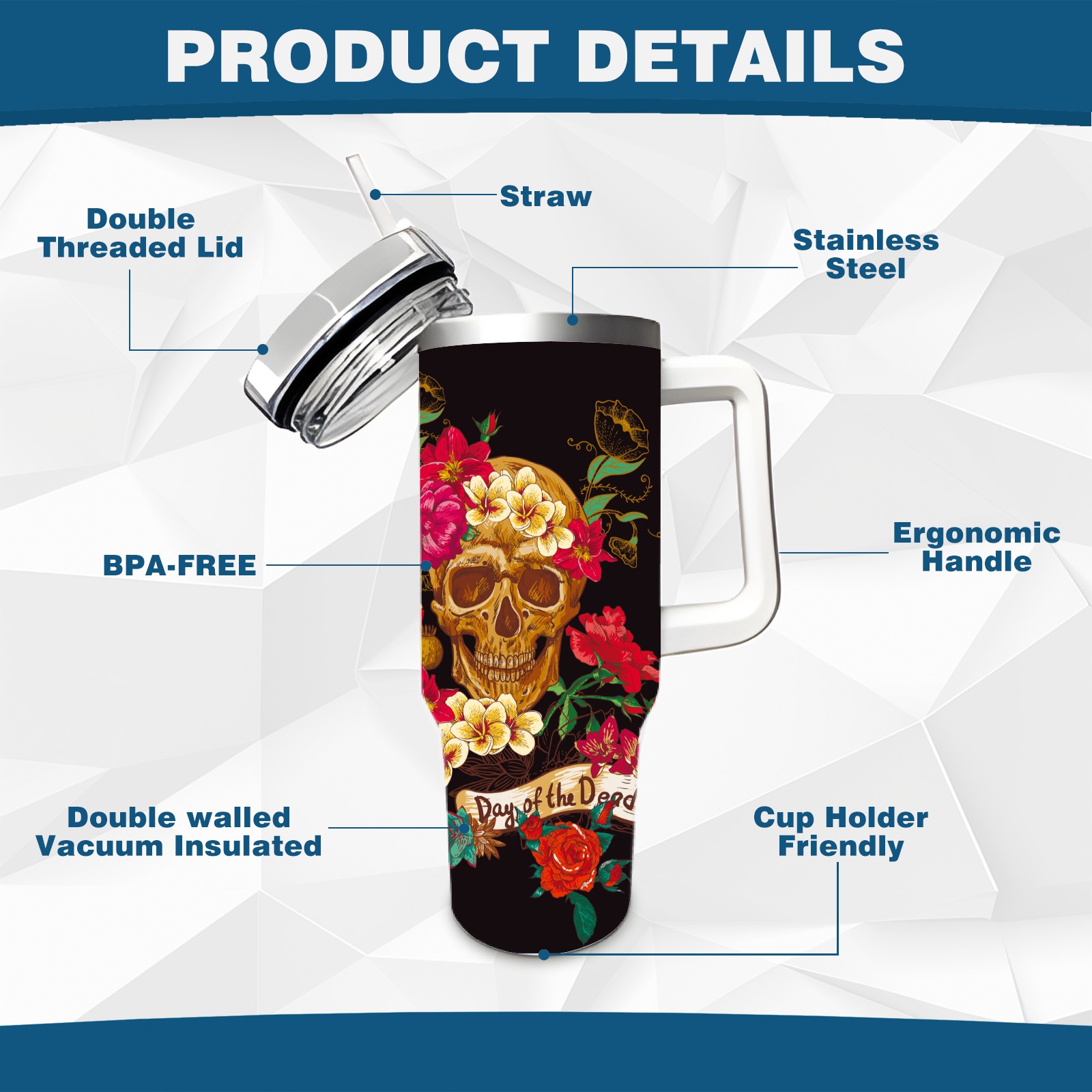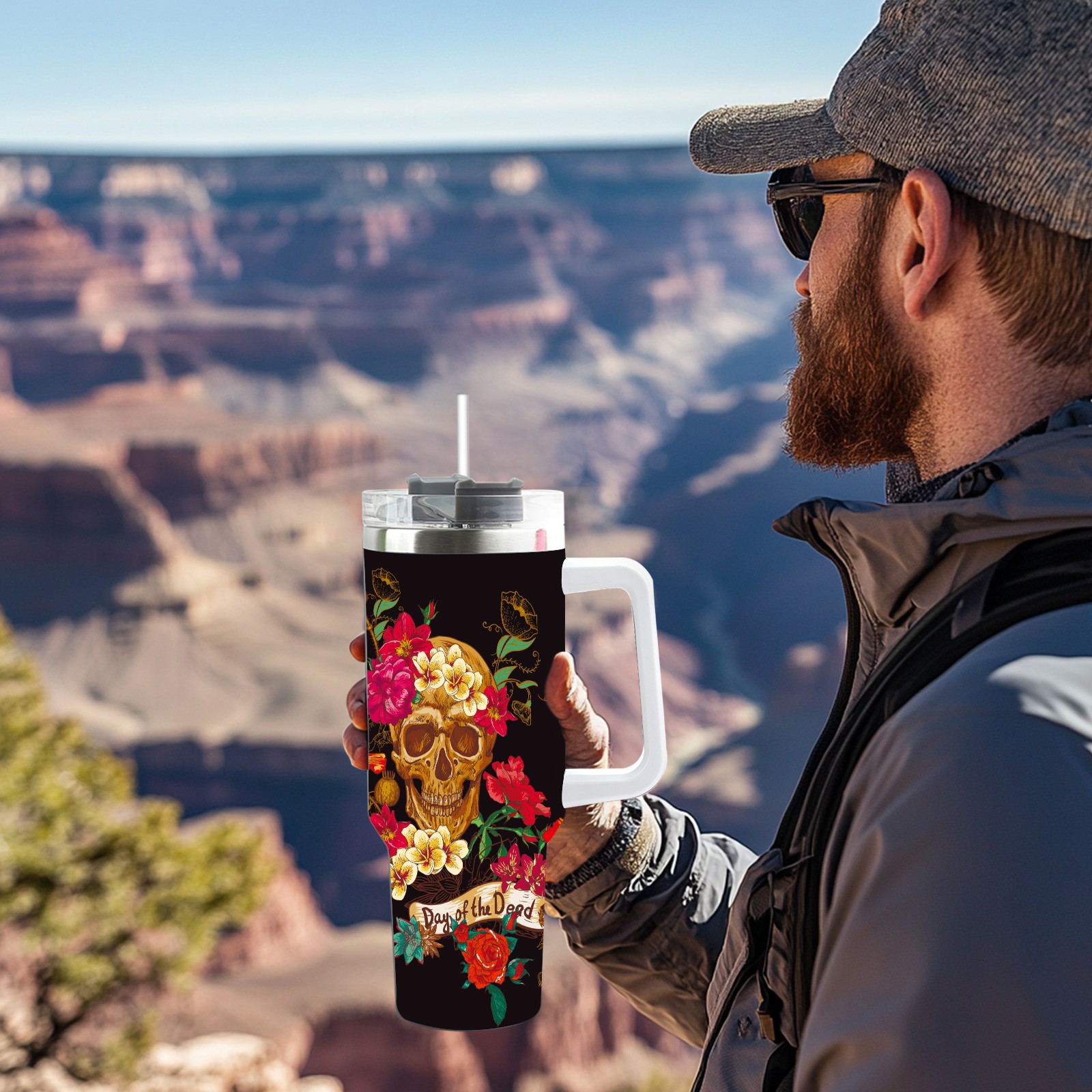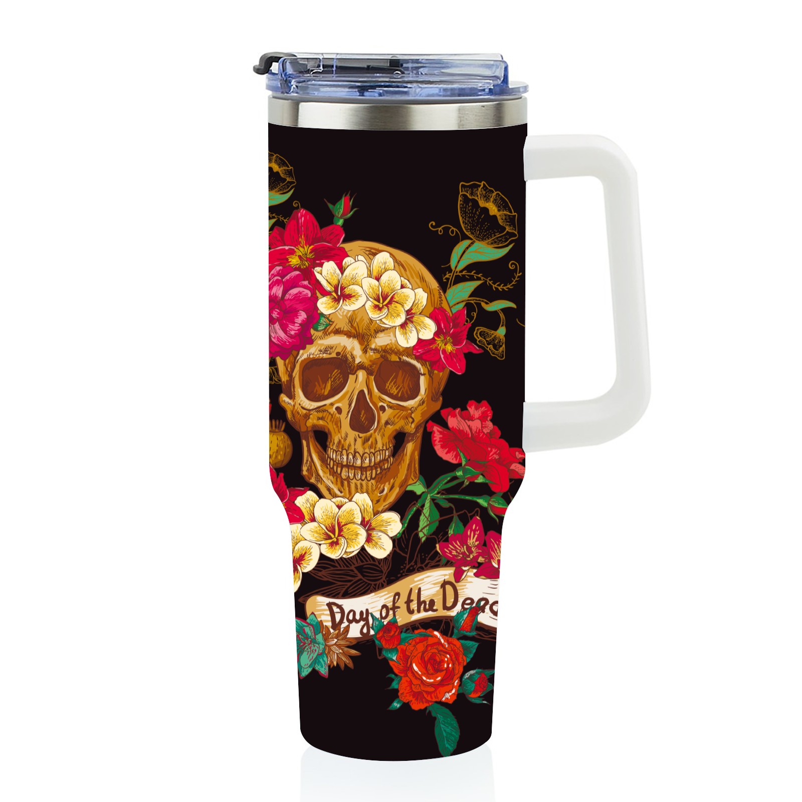 40 унций полностью напечатанный автомобильный стакан Day Of The Dead Sugar Skull Flower
