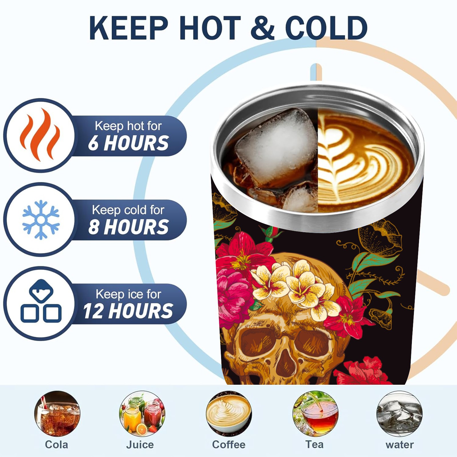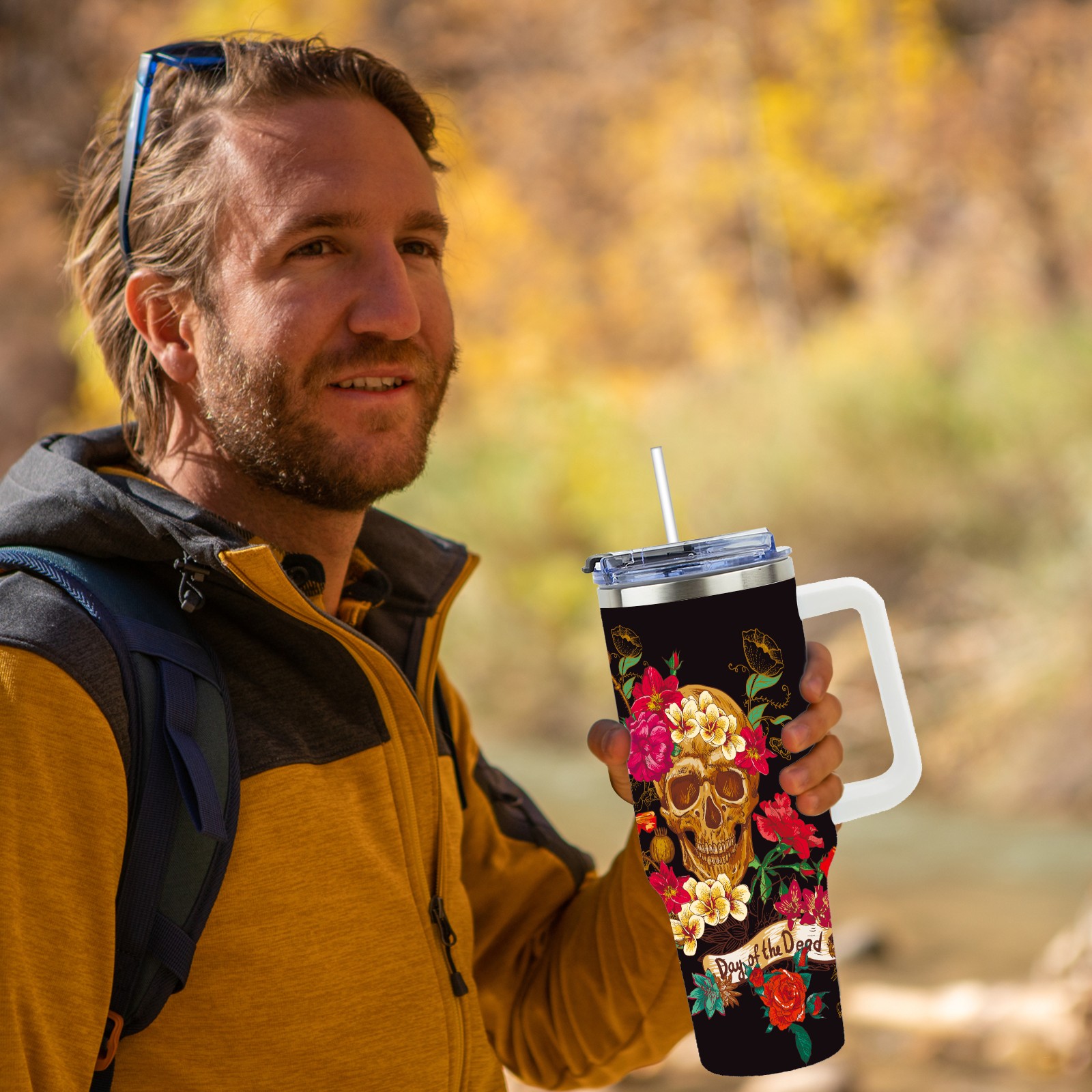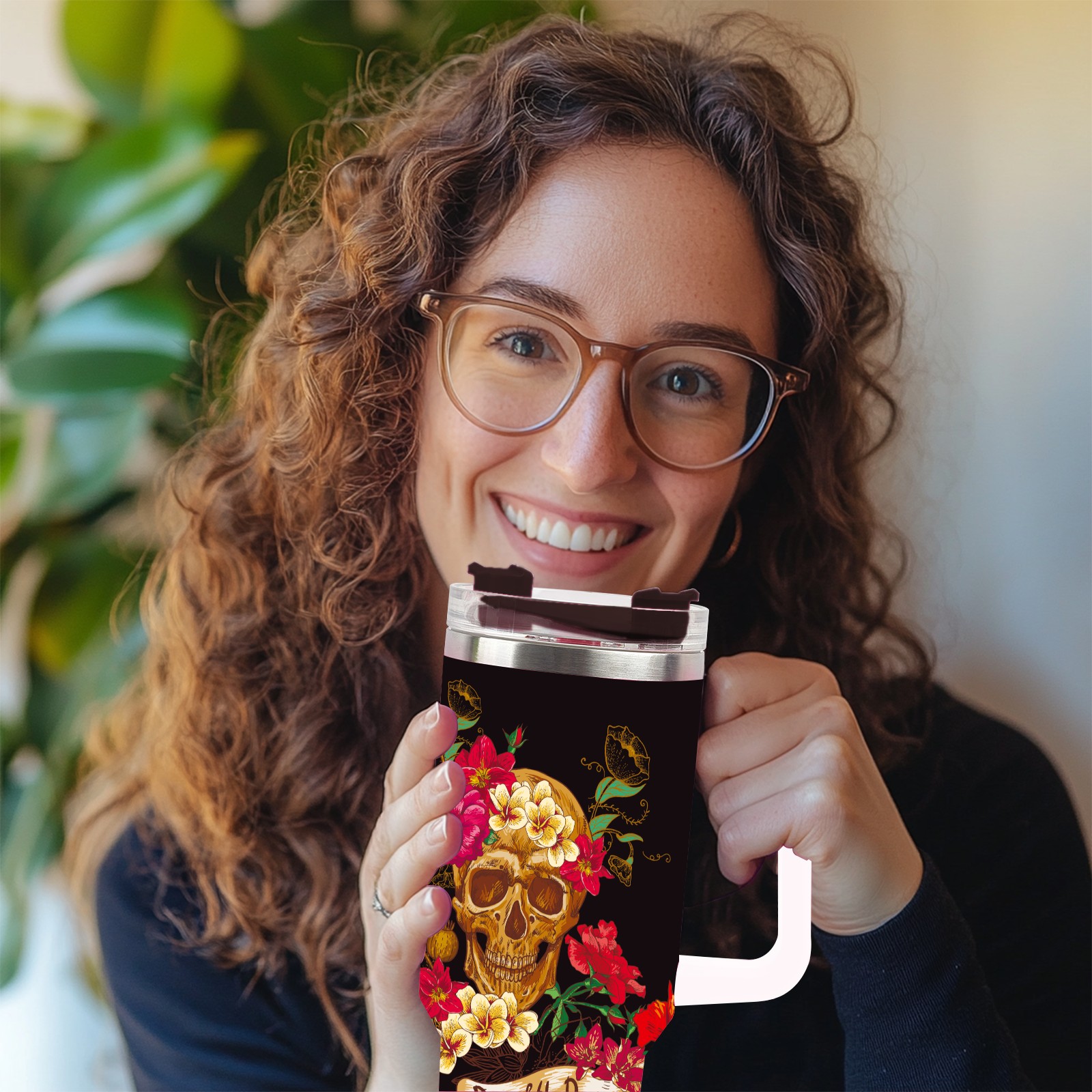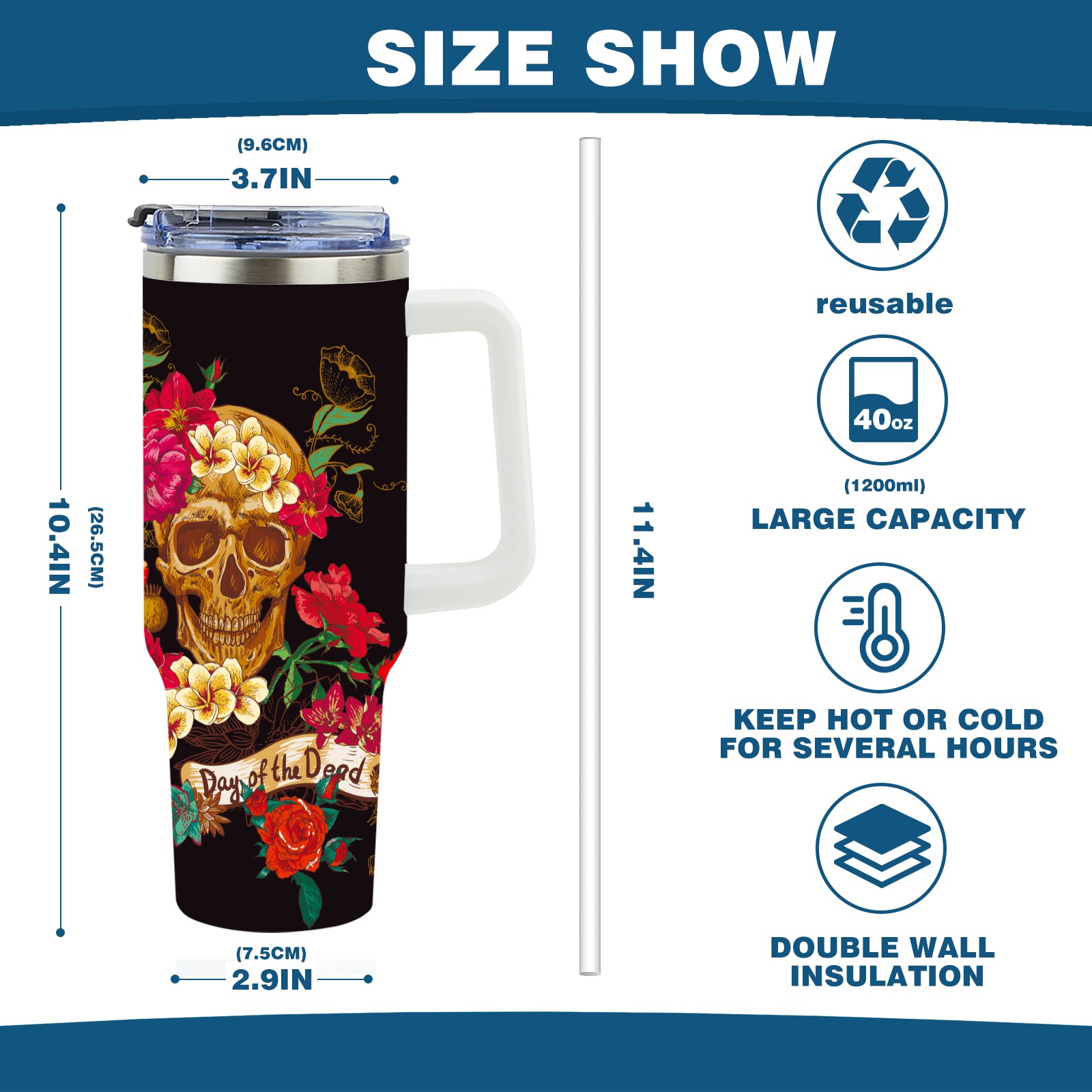 40 унций полностью напечатанный автомобильный стакан Day Of The Dead Sugar Skull Flower