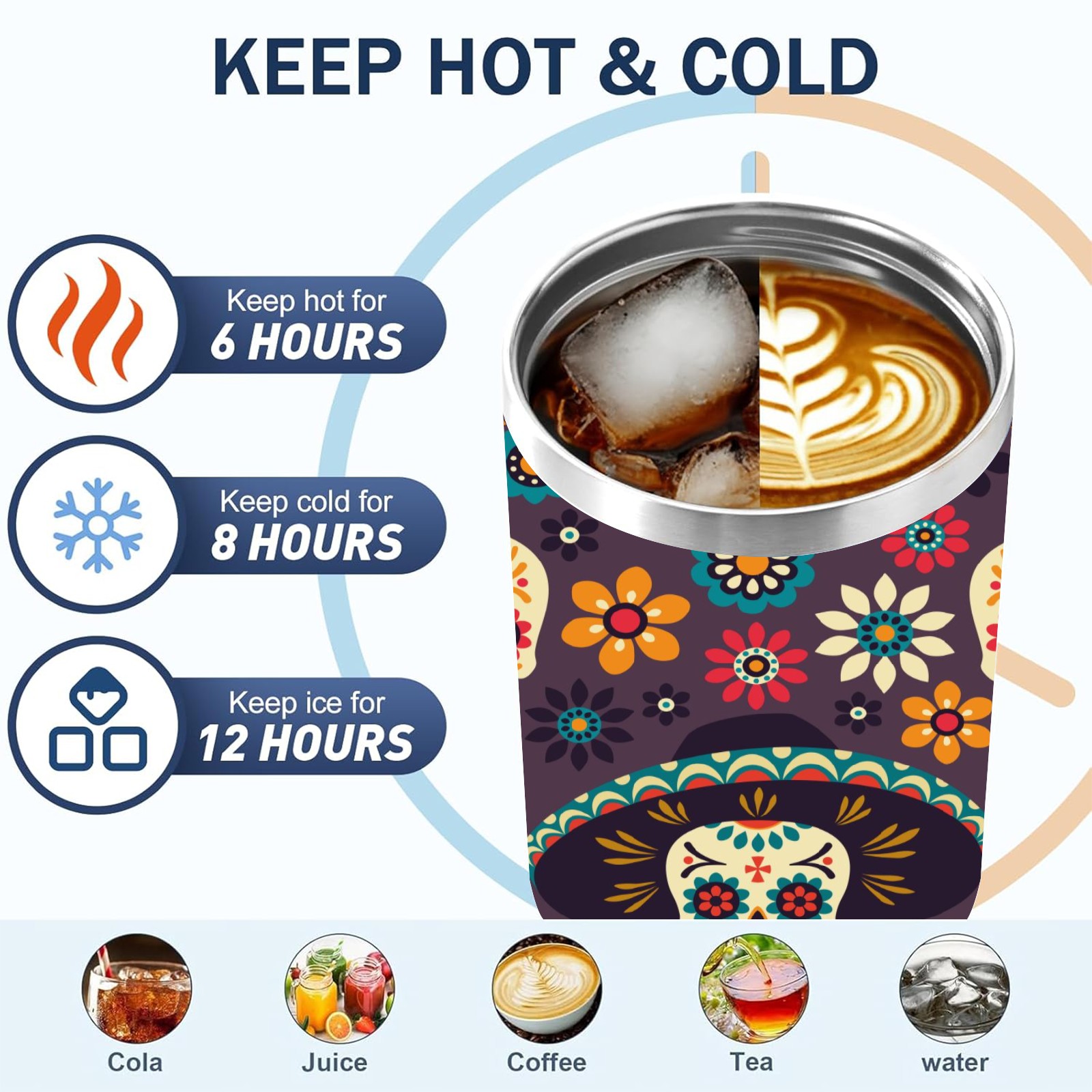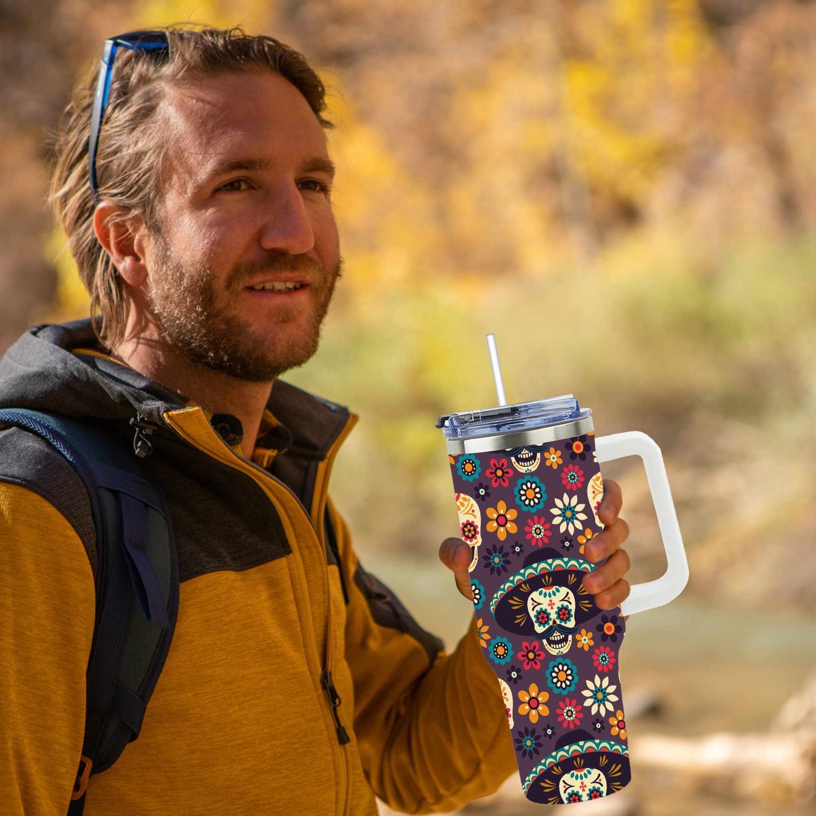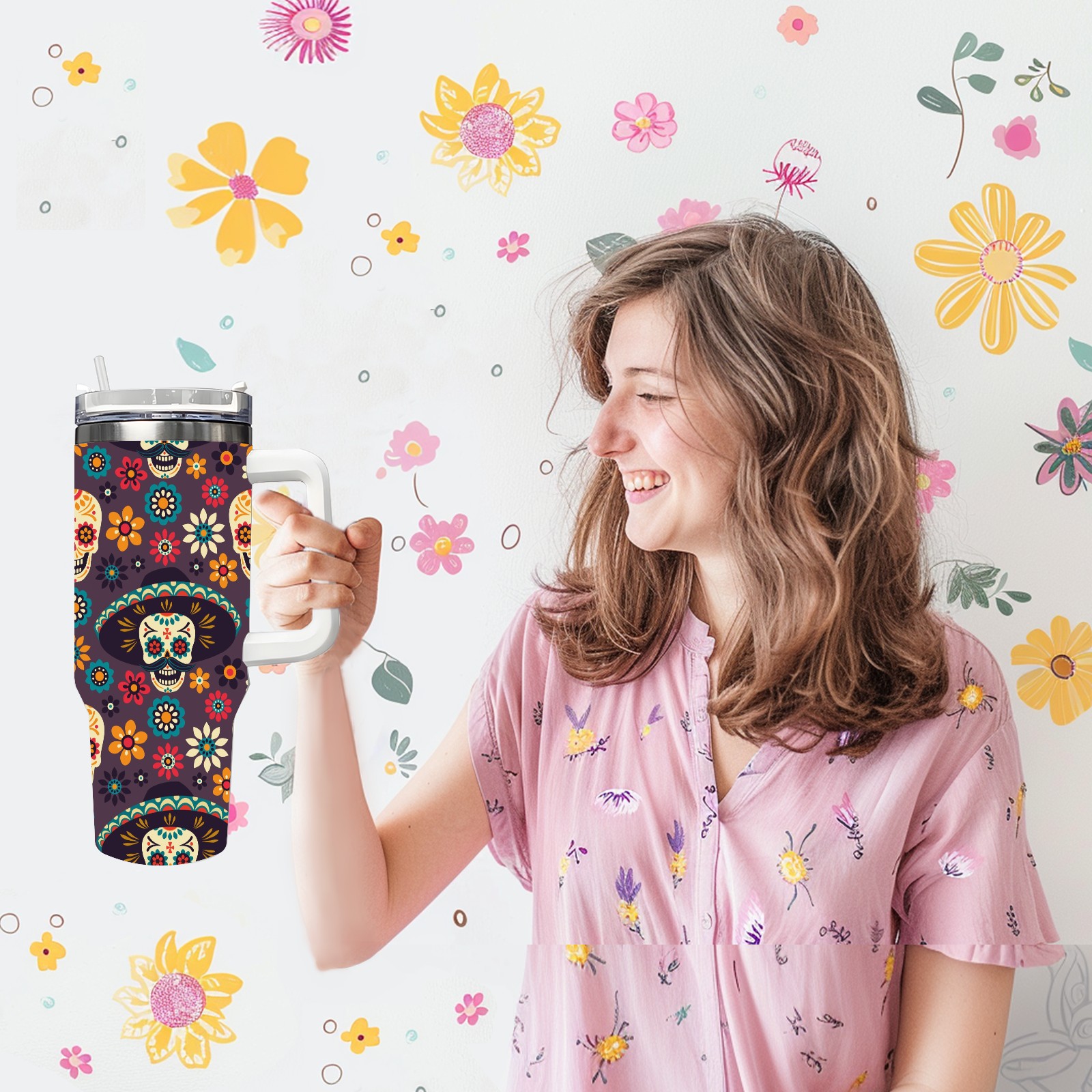 40 унций полностью напечатанный автомобильный стакан Flower Sugar Skull