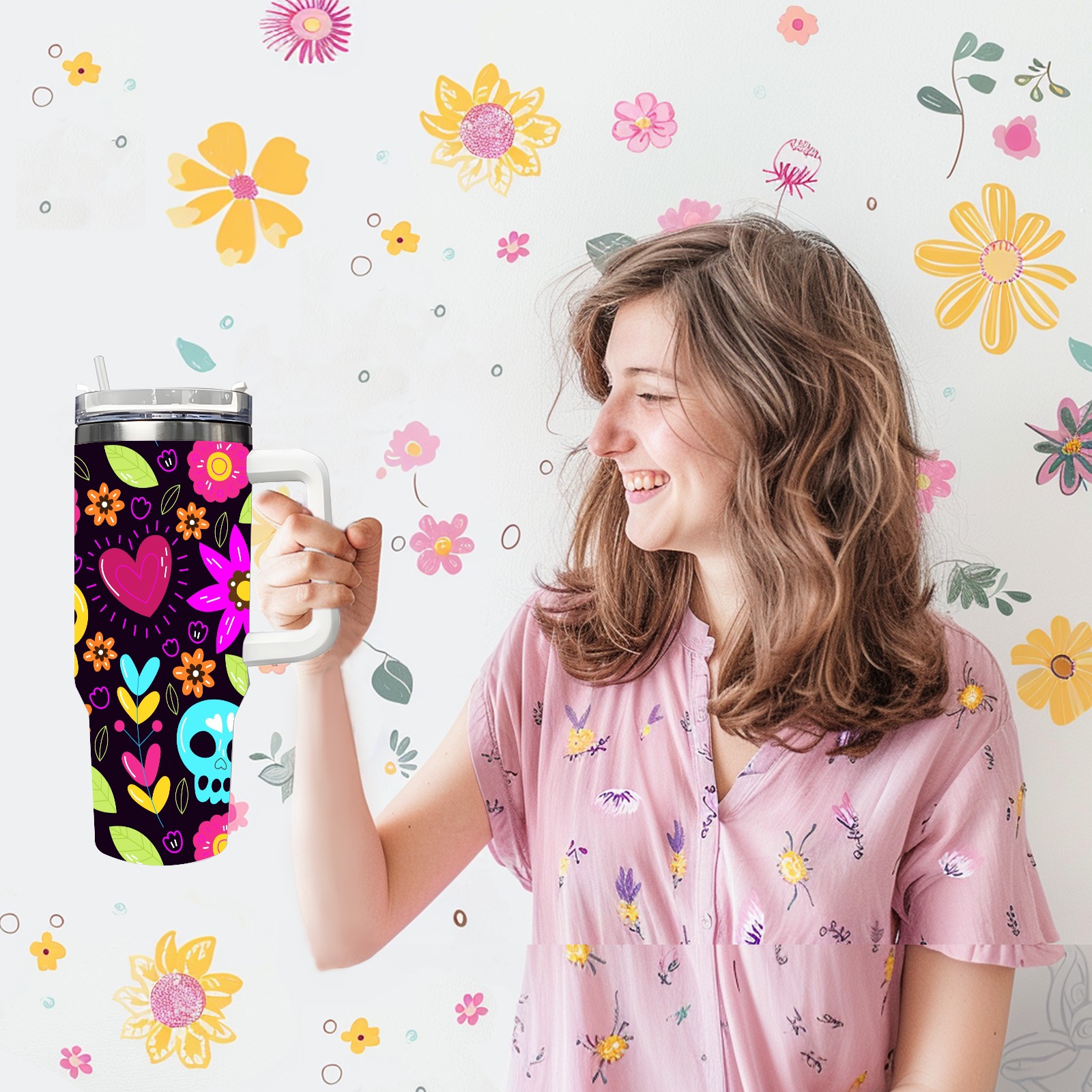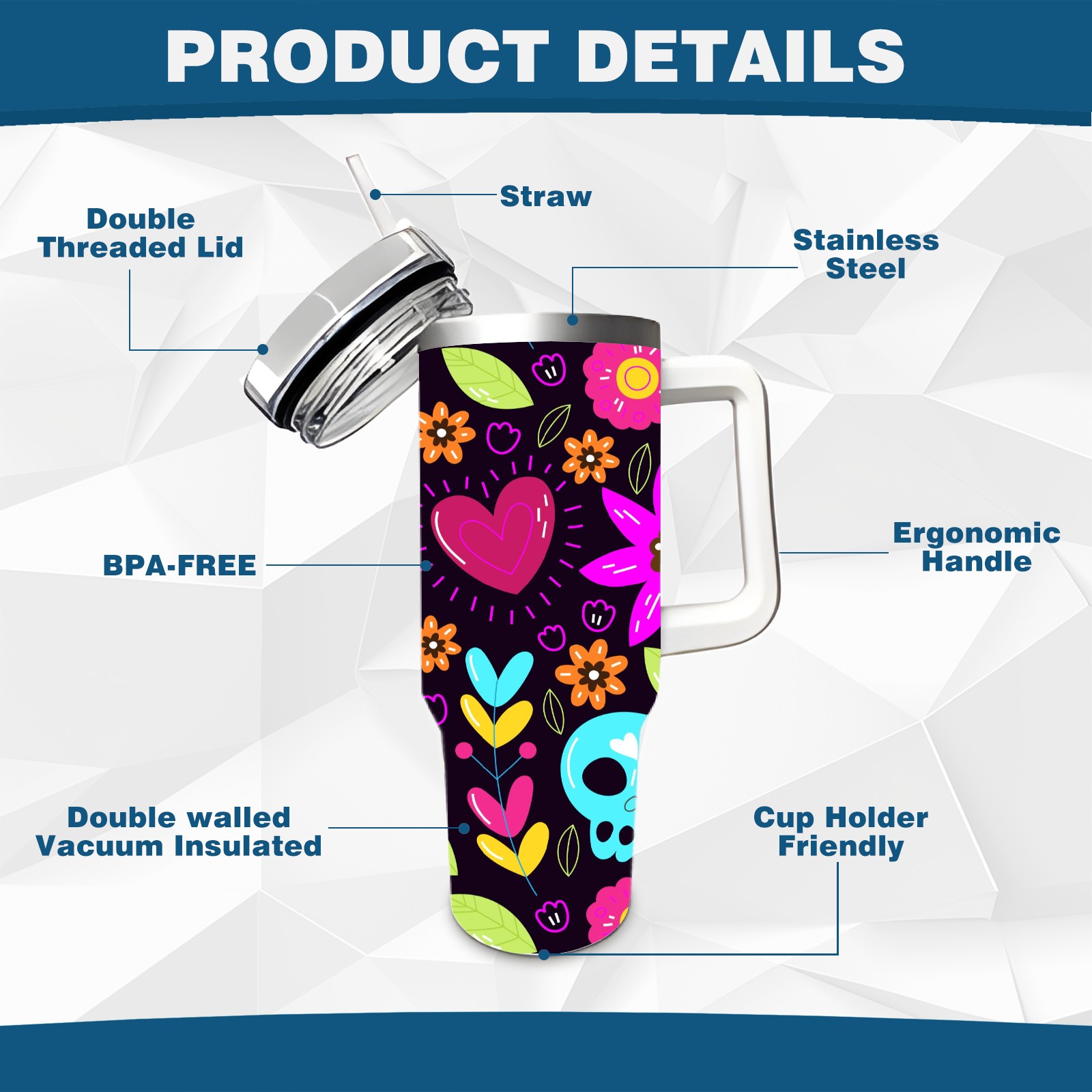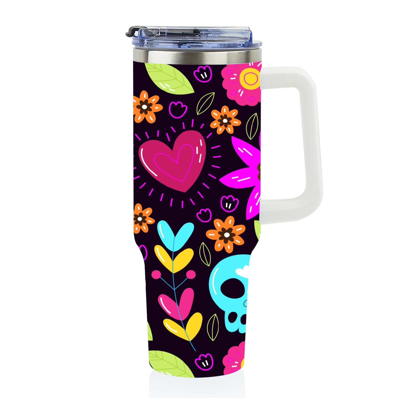 40 унций полностью напечатанный автомобильный стакан Skull Flower Heart