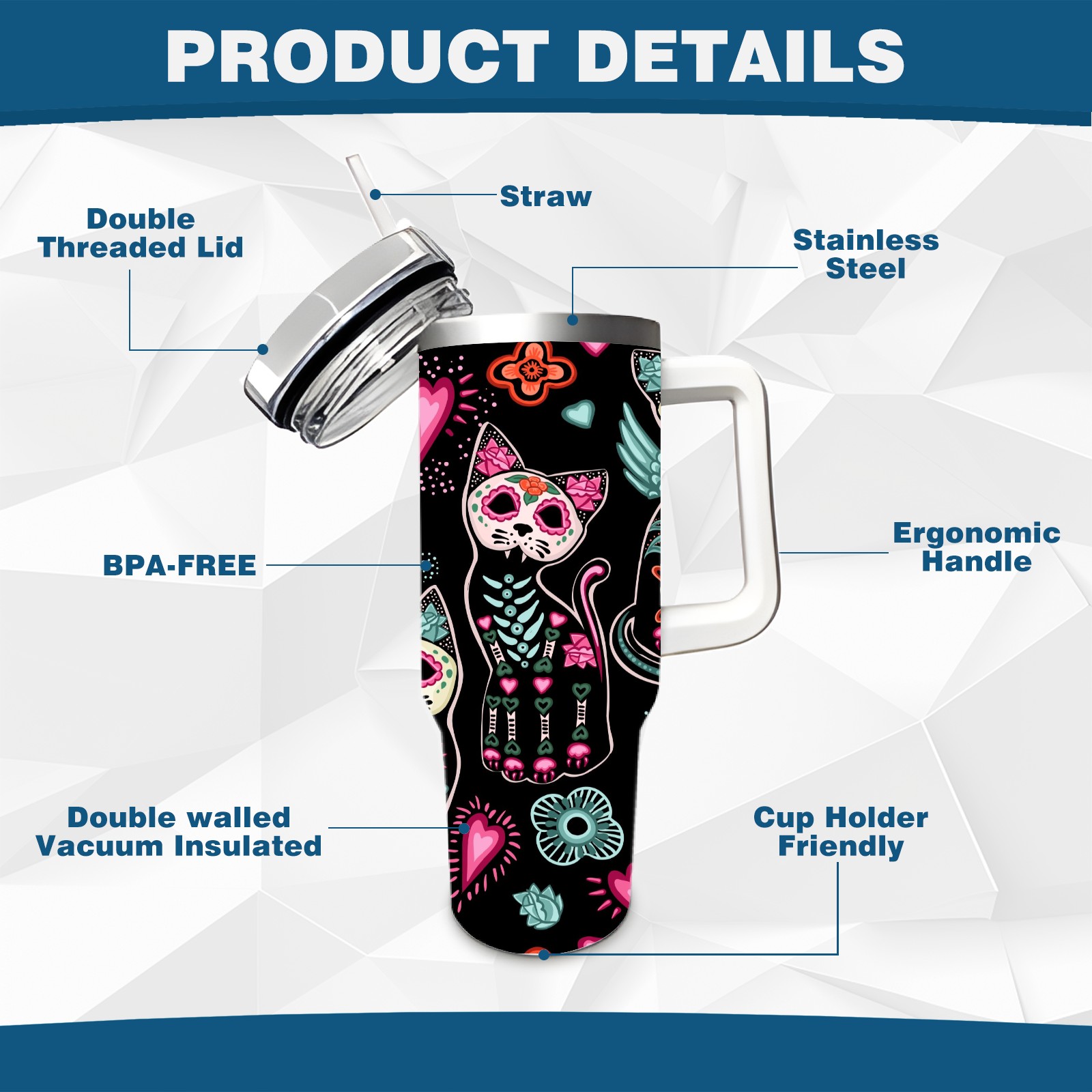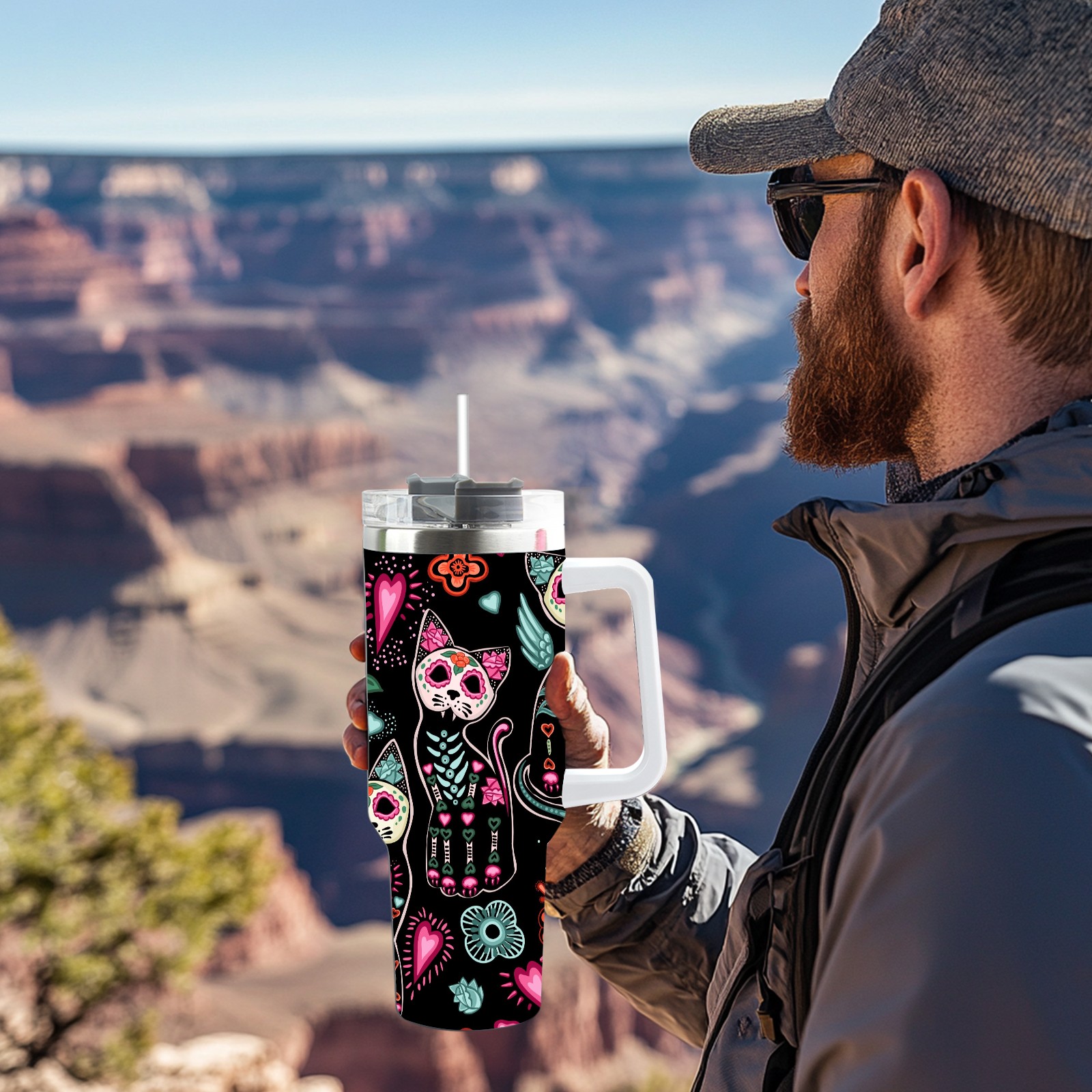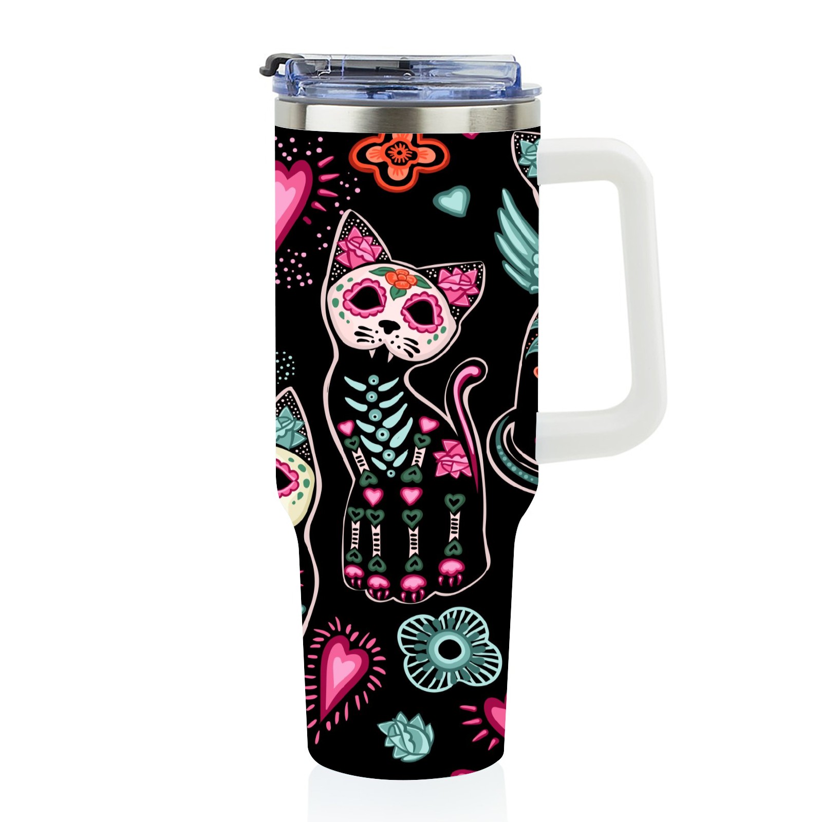 40 унций полностью напечатанный автомобильный стакан Skeleton Cat Skull Kitten Black
