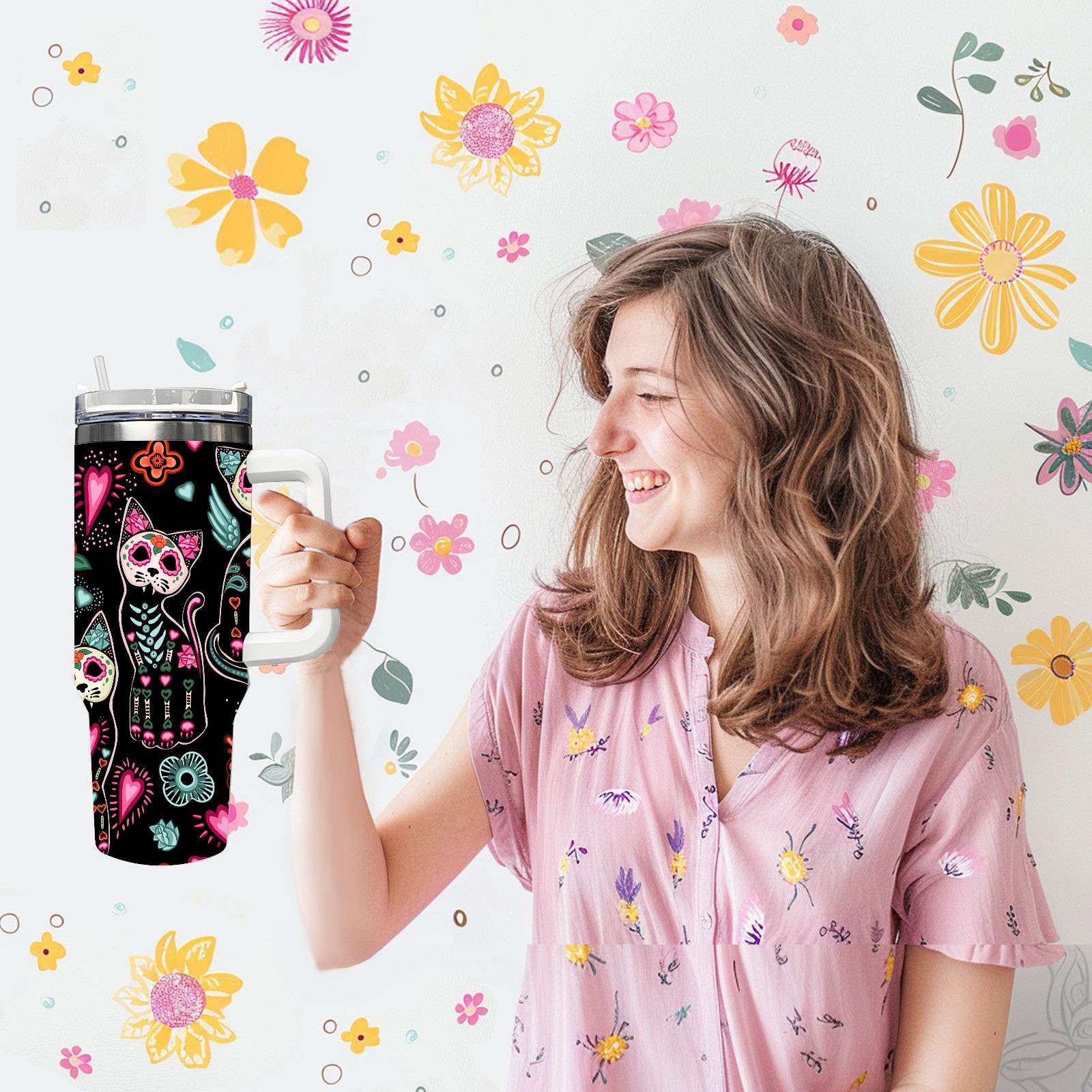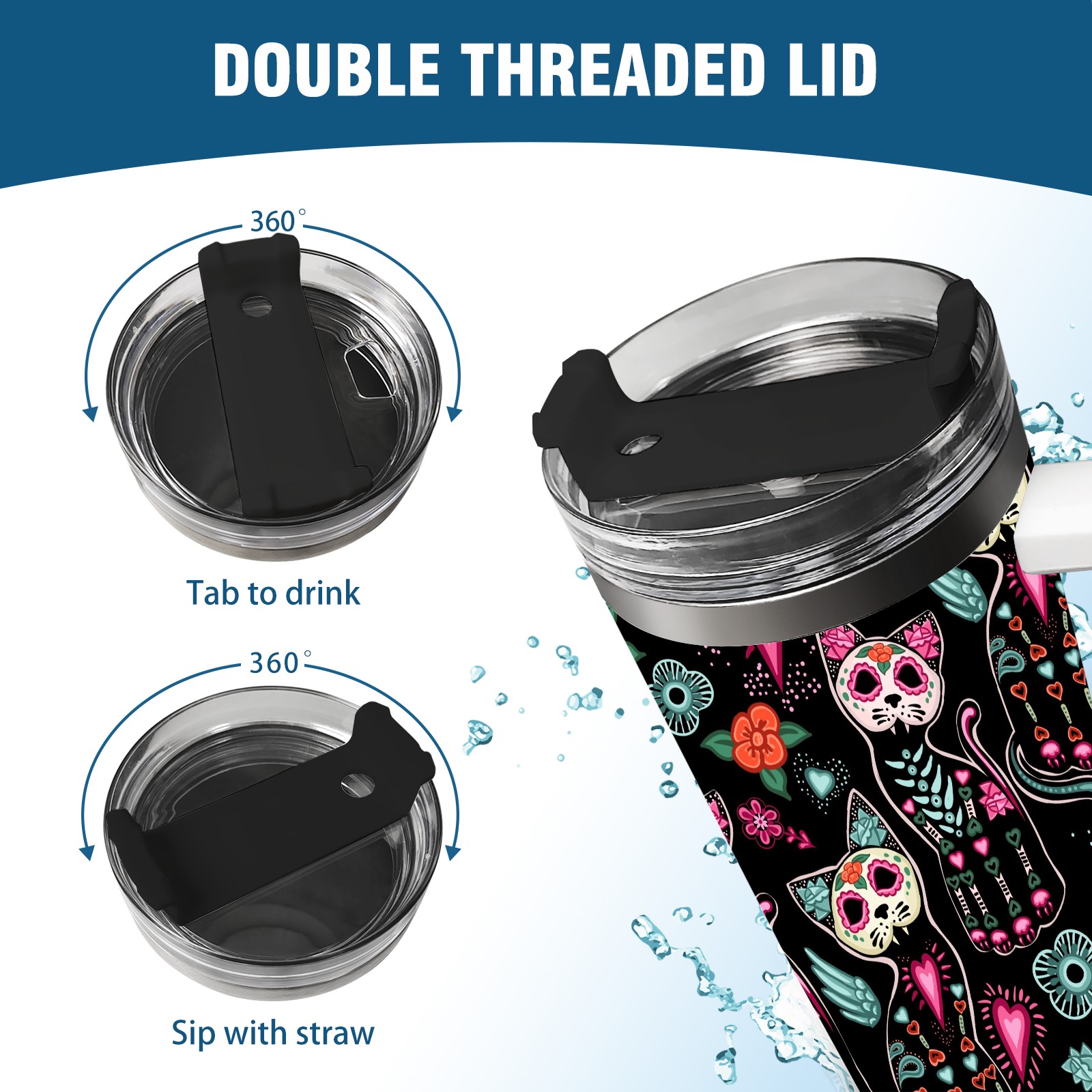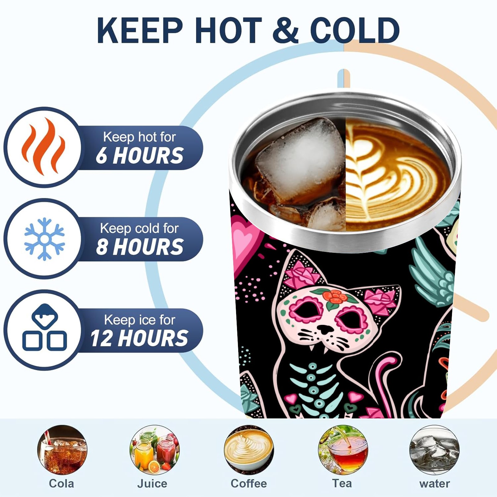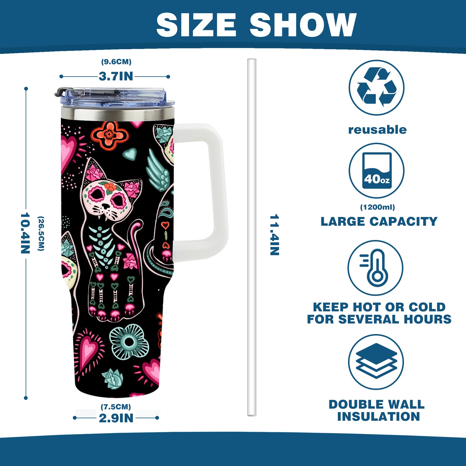 40 унций полностью напечатанный автомобильный стакан Skeleton Cat Skull Kitten Black