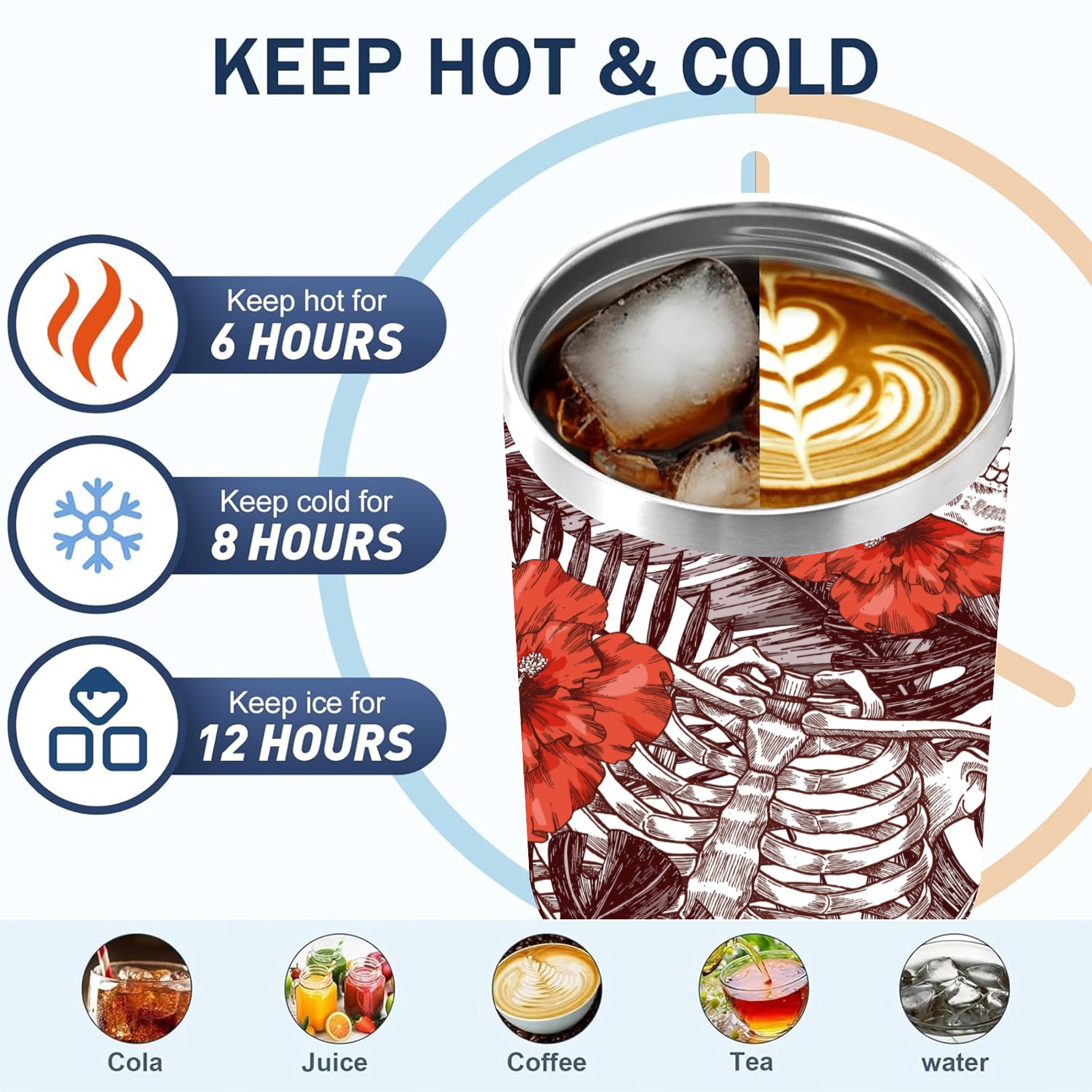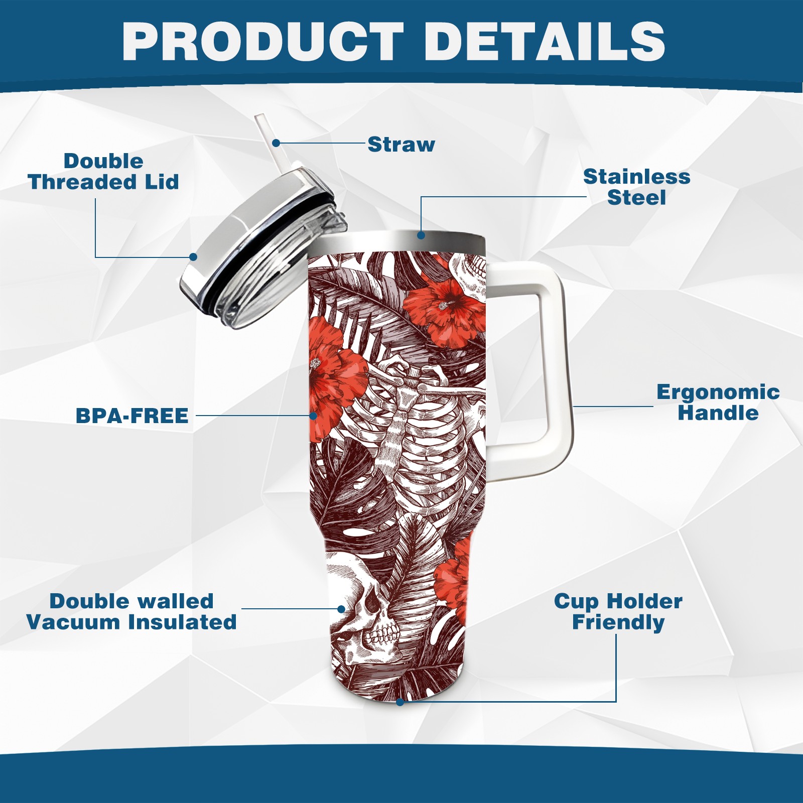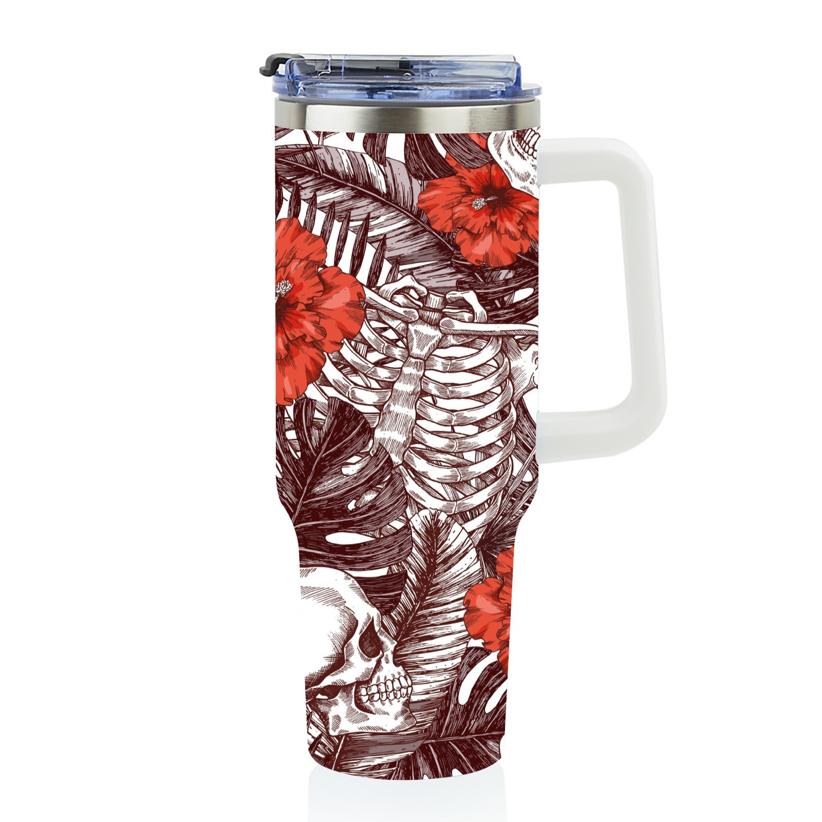 40 унций полностью напечатанный автомобильный стакан Skull With Flower Vintage