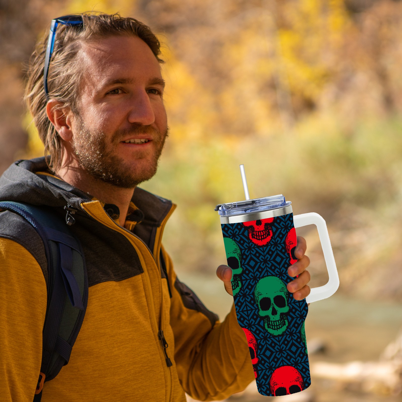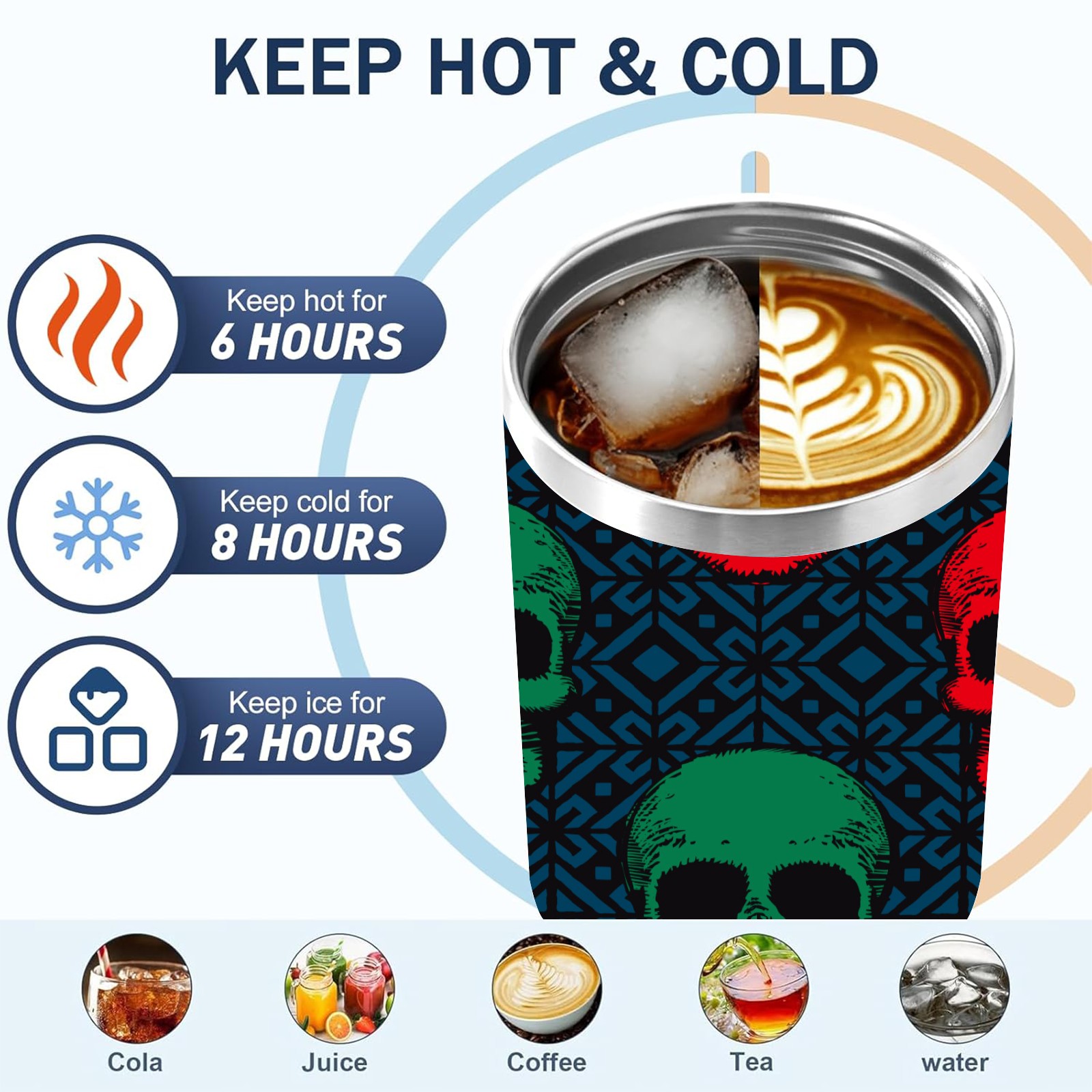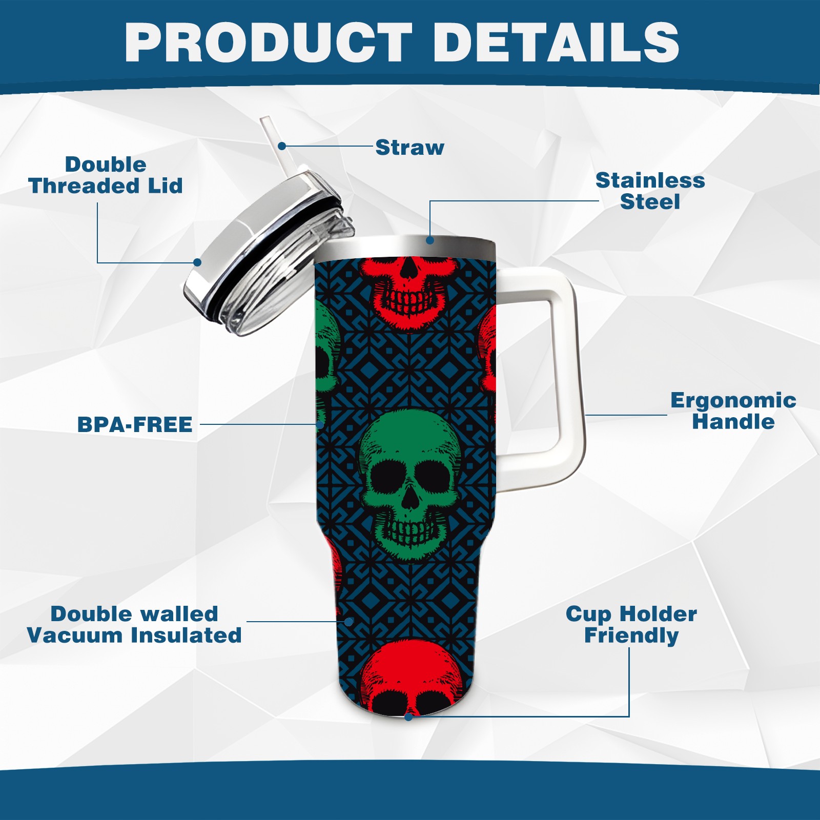 40 унций полностью напечатанный автомобильный стакан Green Red Skull Head Navy Background