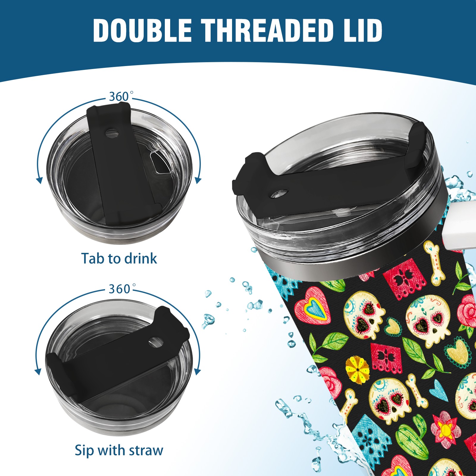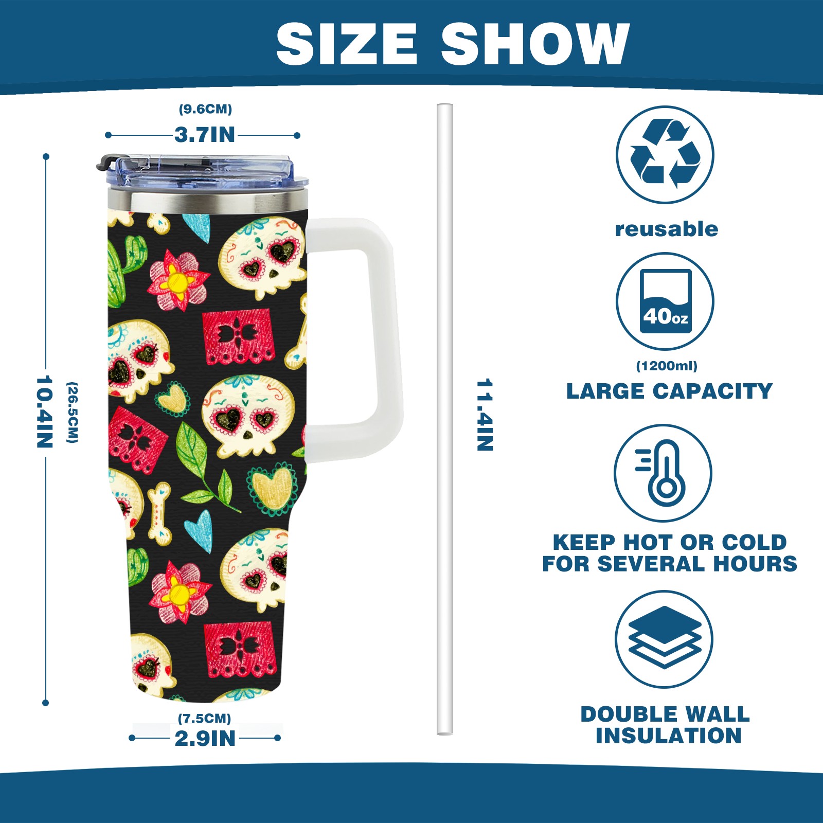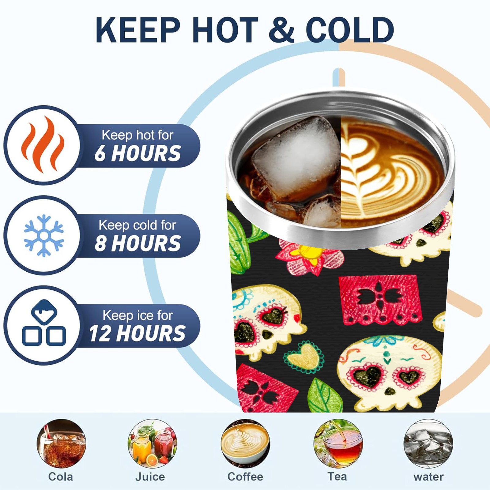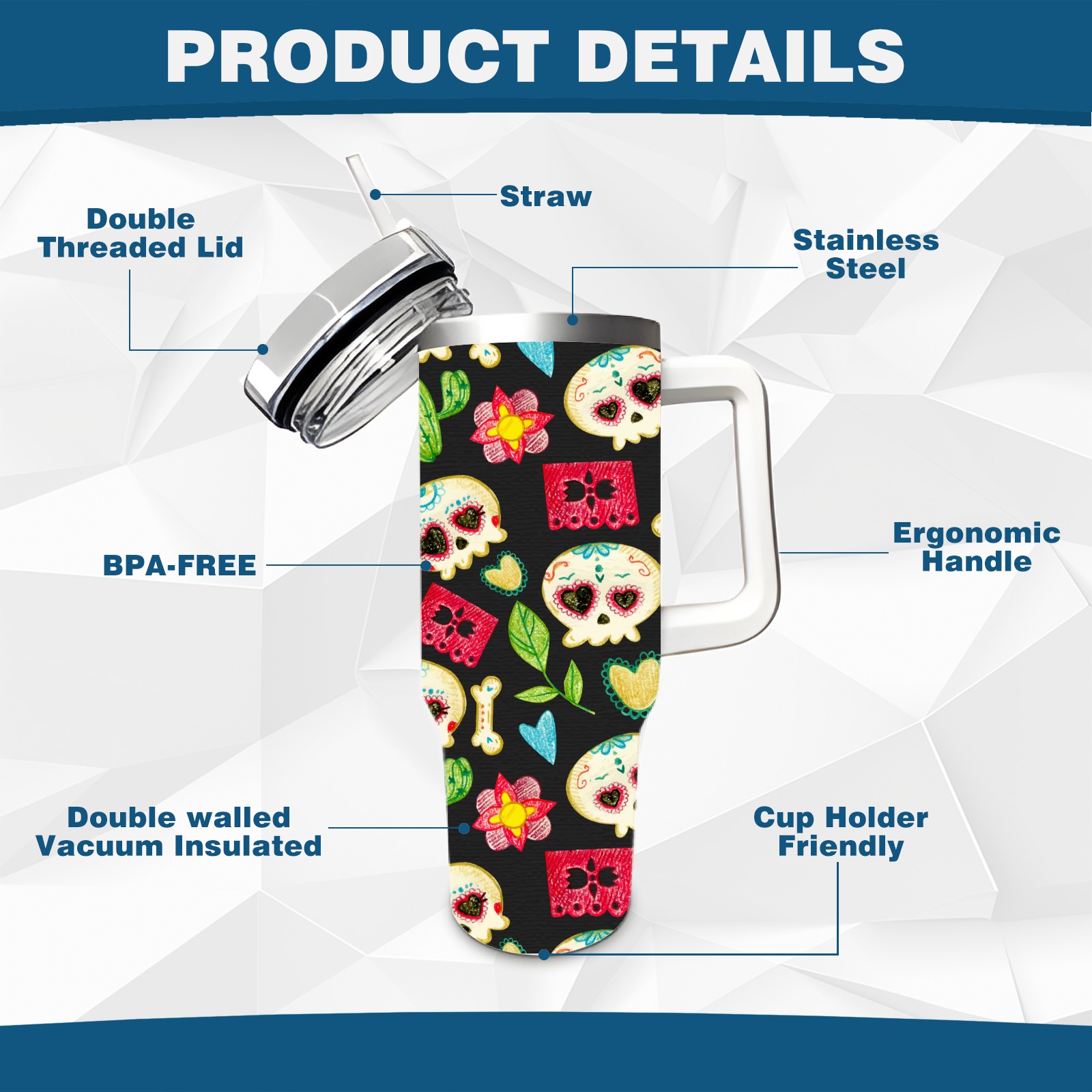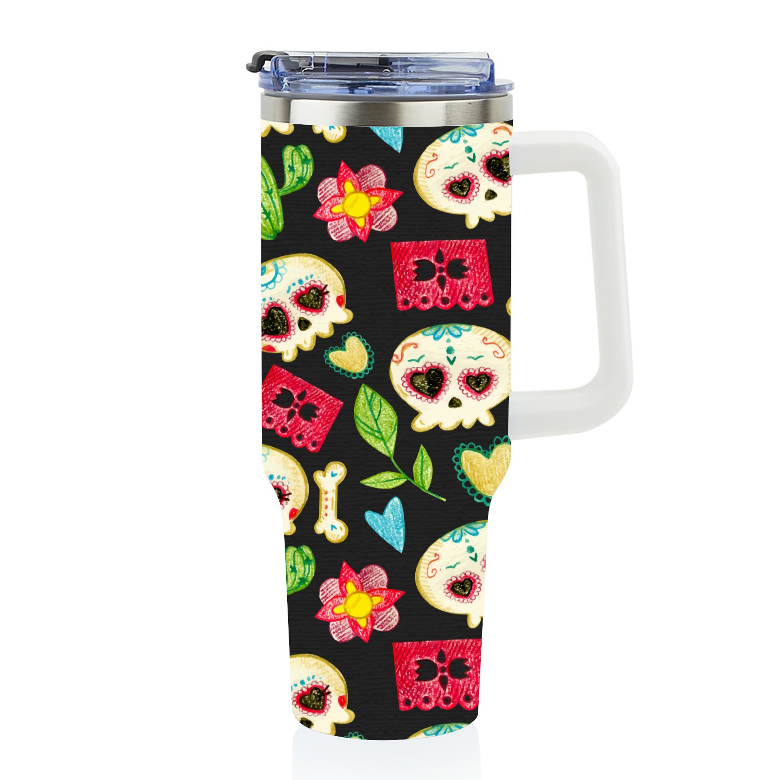40 унций полностью напечатанный автомобильный стакан Hand Drawn Colorful Day Of The Dead Skull Pattern-01