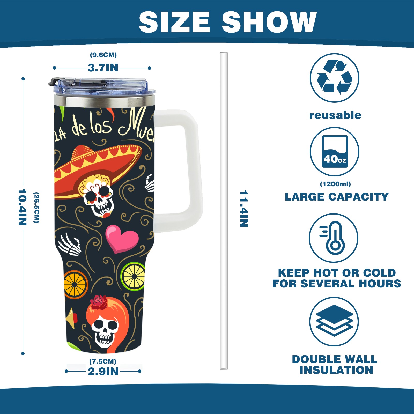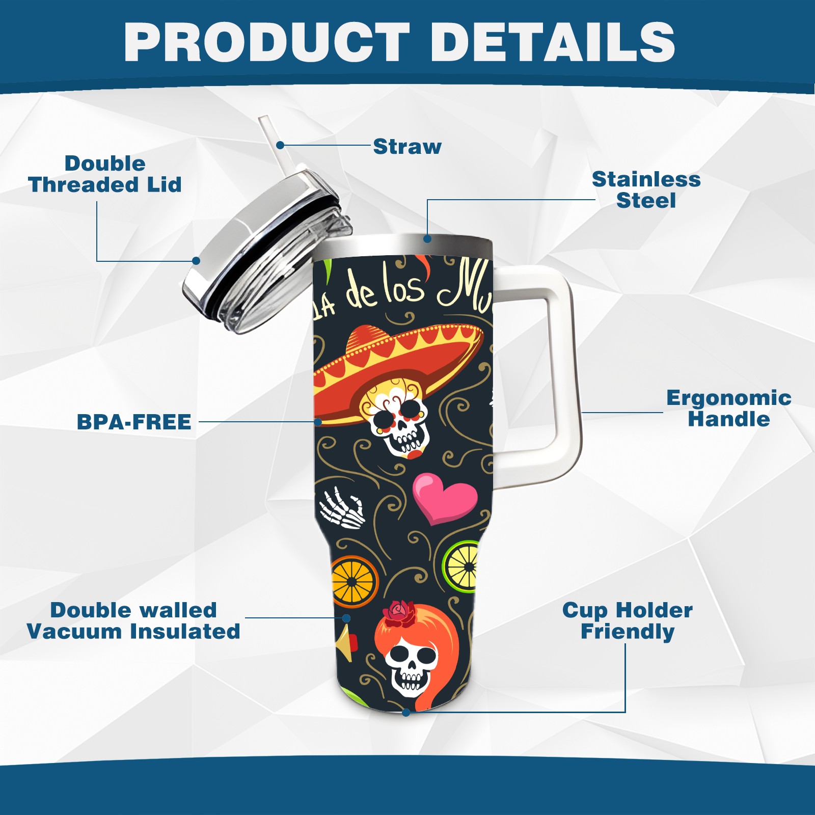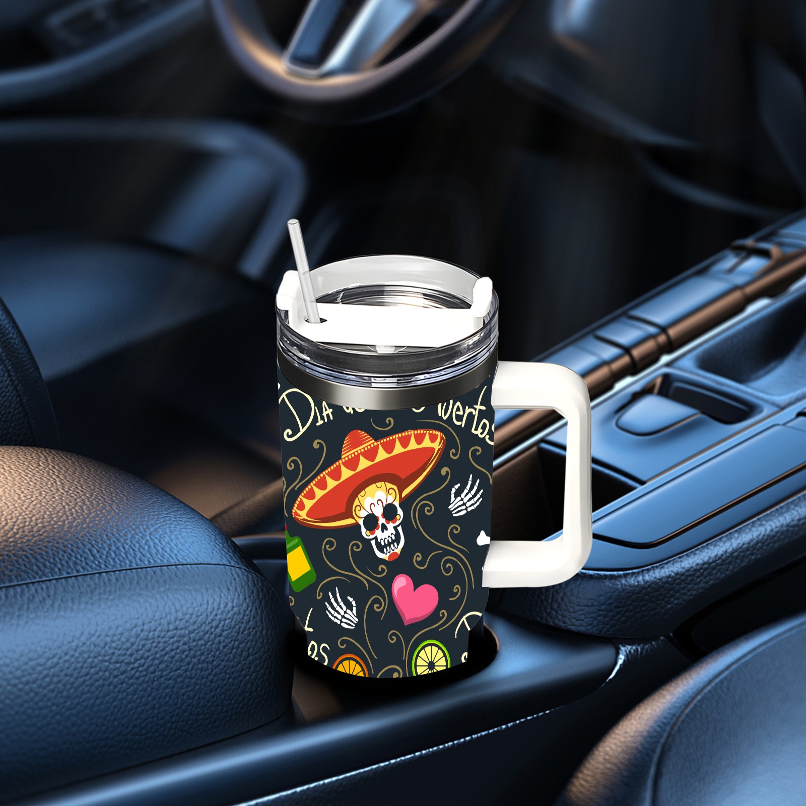 40 унций полностью напечатанный автомобильный стакан Mexico Sugar Skull Floral Heart