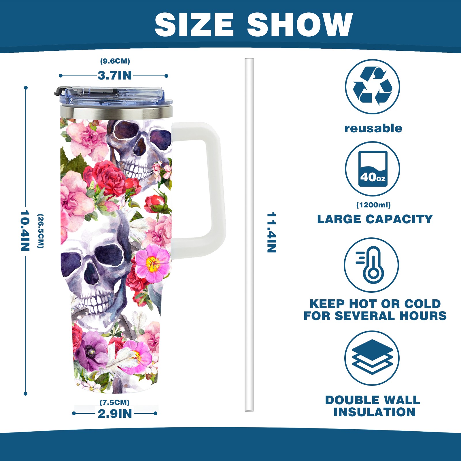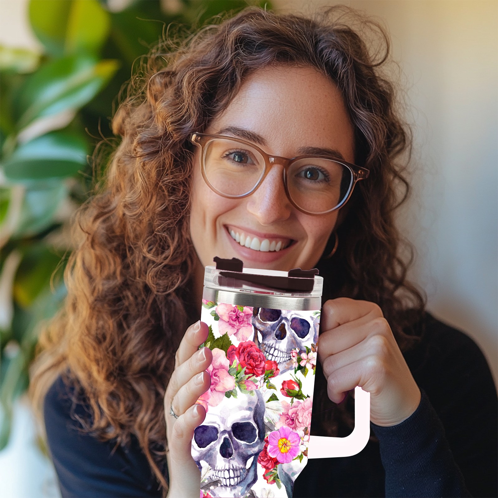 40 унций полностью напечатанный автомобильный стакан Watercolor Sugar Skull Rose Floral
