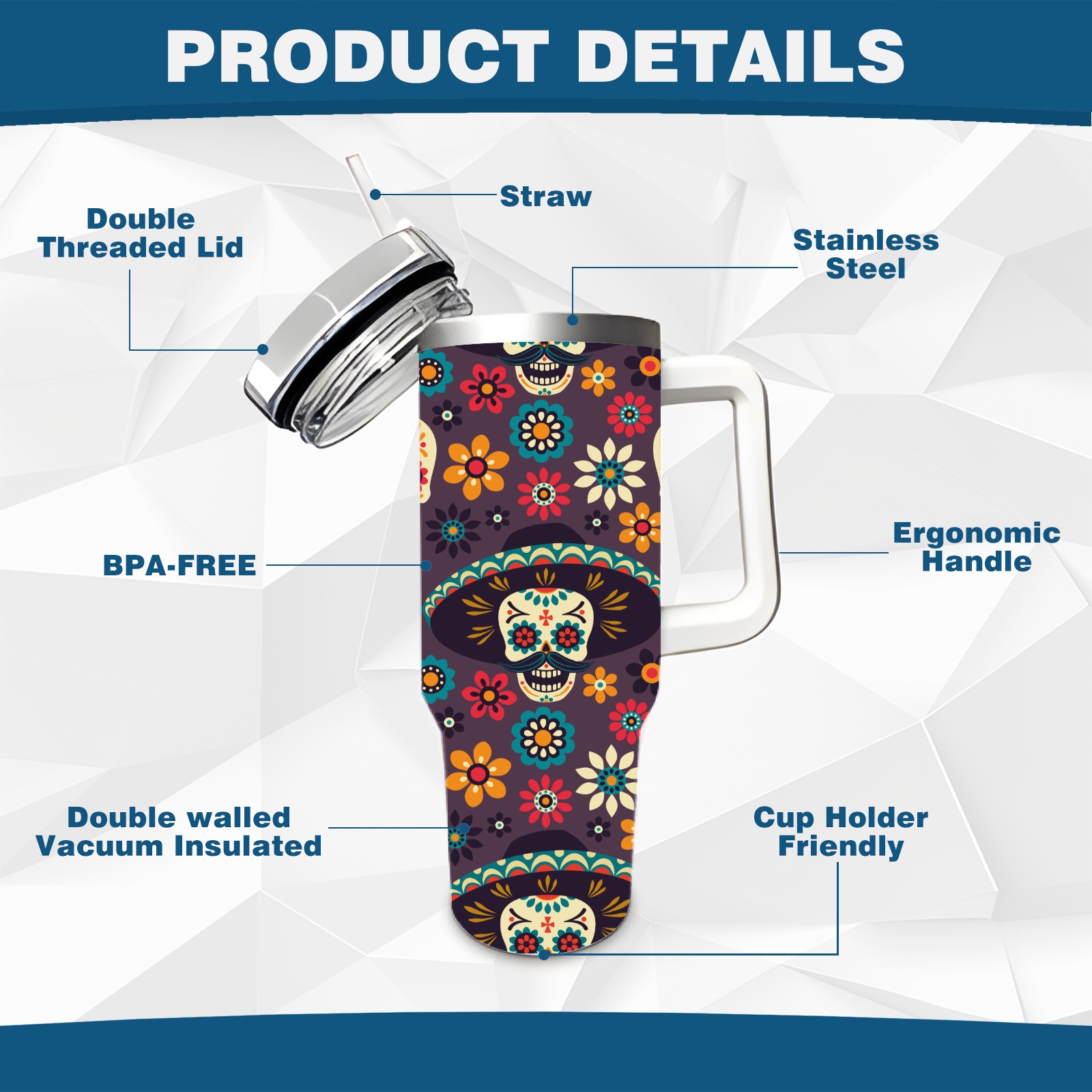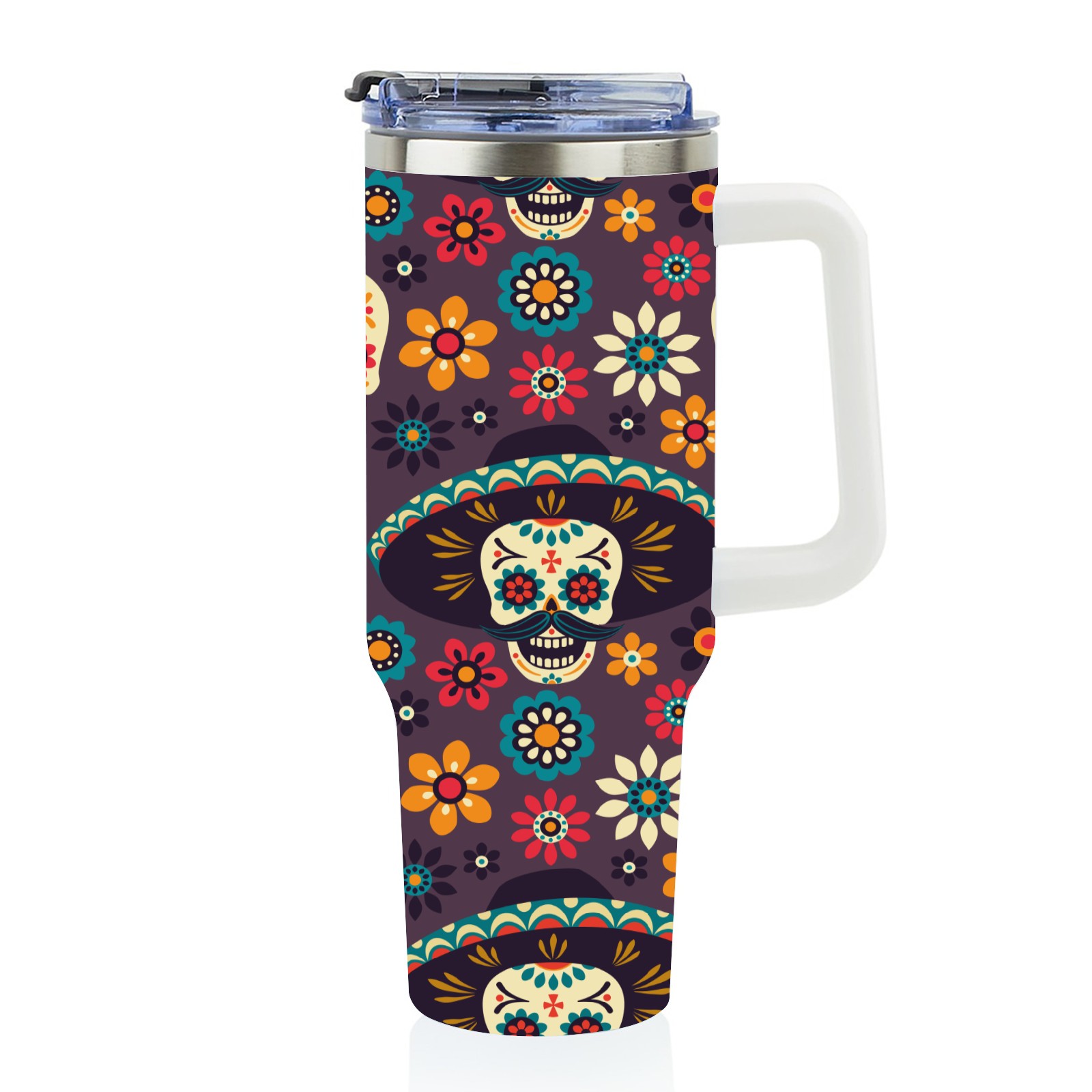 40 унций полностью напечатанный автомобильный стакан Mexico Colorful Sugar Skull Floral Pattern