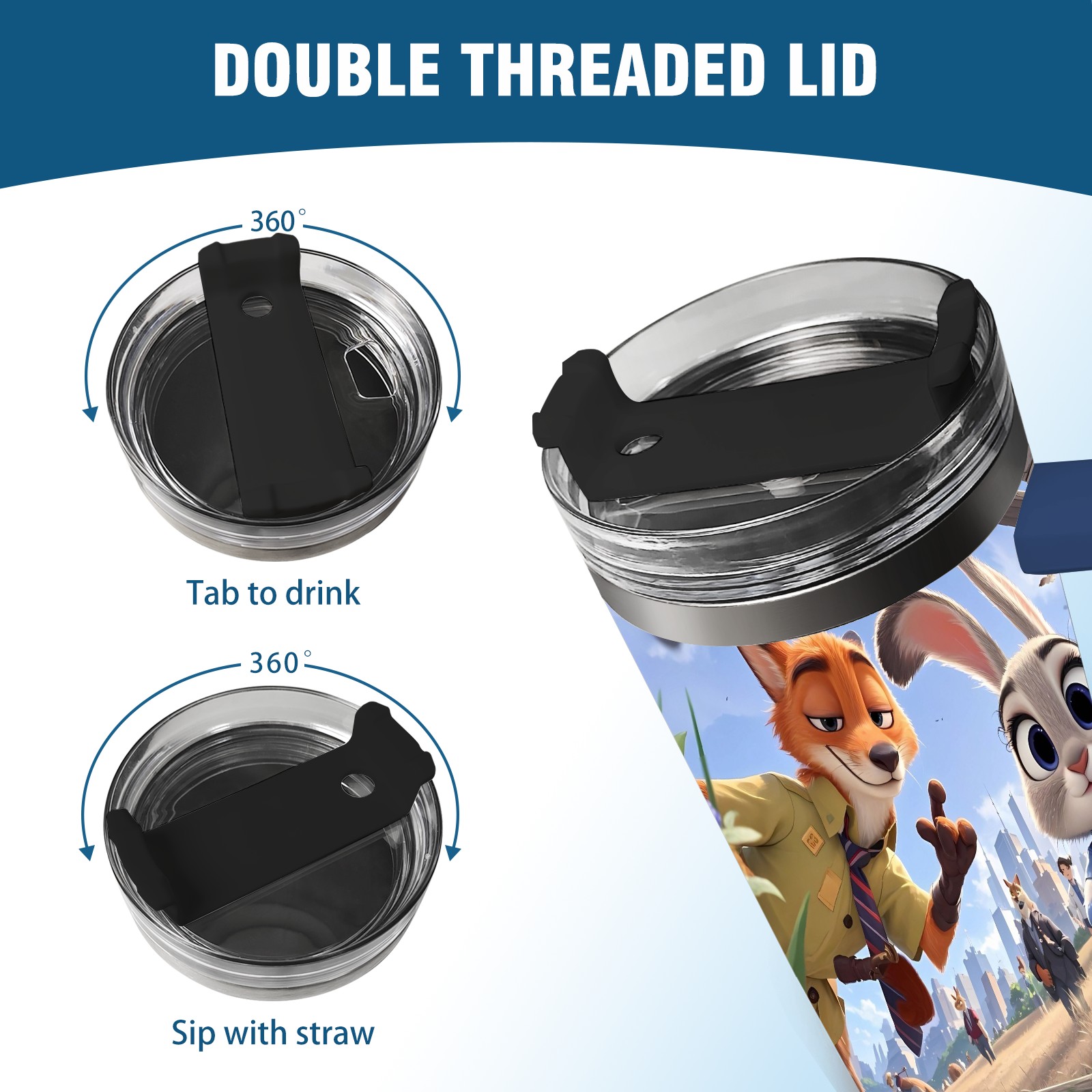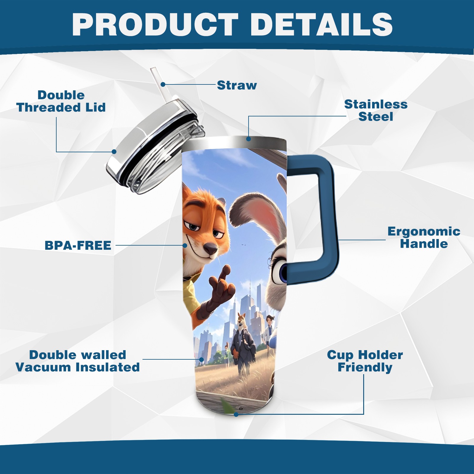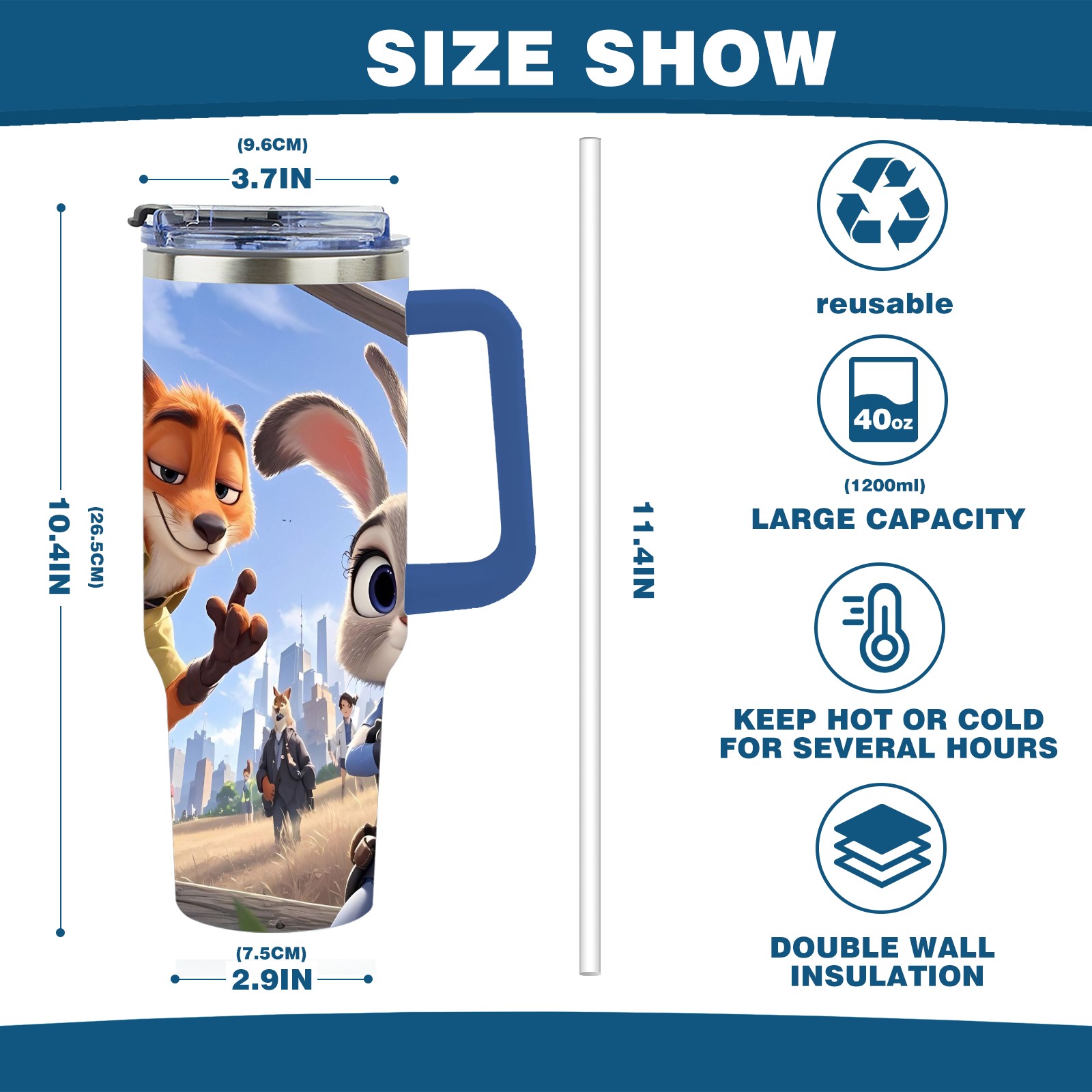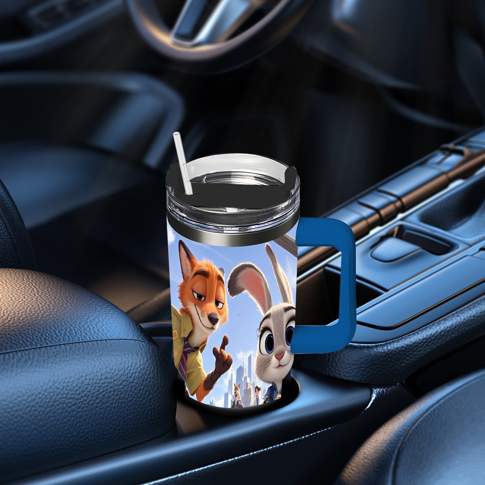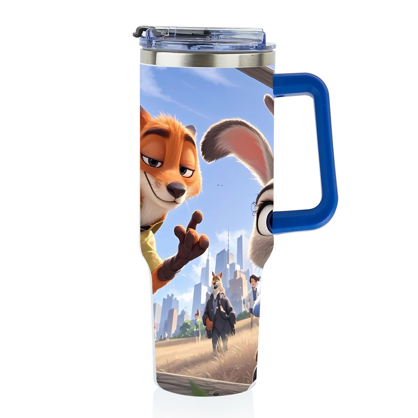 40oz 疯狂动物城 IPad版 08 thermos with lid and straw, leak-proof stainless steel, with handle, spill-proof bottle, convenient for travel(blue)