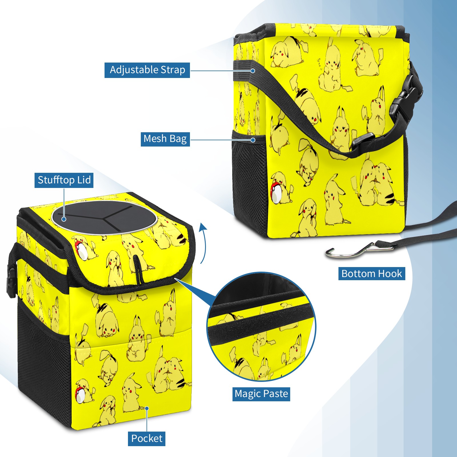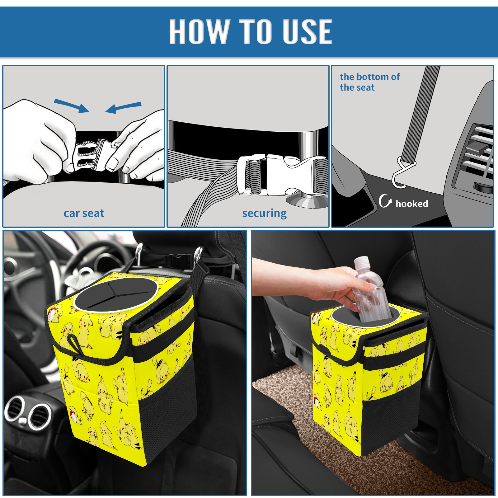 • <p>Keep your car neat with this practical car trash can—built for durability, versatility, and on-the-go convenience! Crafted from quality twill fabric with a waterproof lining, it prevents leaks, keeping seats/floors clean. Clean easily: empty directly or secure a disposable bag with side clips. Adjustable pull cord fits floor, seat, or headrest. 9.5x6.3x6.7 inches, ample space for daily trash, folds flat for storage. More than a trash can, it doubles as a storage bag for cups, toys, docs, and small gadgets—must-have car interior accessory. Installs in seconds on seats, console, or gear shift; adjustable straps keep it stable, no slipping on bumpy roads. Perfect gift for new car owners!</p>