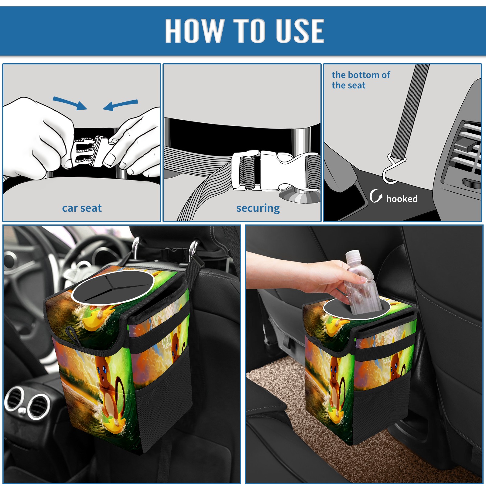• <p>Keep your car neat with this practical car trash can—built for durability, versatility, and on-the-go convenience! Crafted from quality twill fabric with a waterproof lining, it prevents leaks, keeping seats/floors clean. Clean easily: empty directly or secure a disposable bag with side clips. Adjustable pull cord fits floor, seat, or headrest. 9.5x6.3x6.7 inches, ample space for daily trash, folds flat for storage. More than a trash can, it doubles as a storage bag for cups, toys, docs, and small gadgets—must-have car interior accessory. Installs in seconds on seats, console, or gear shift; adjustable straps keep it stable, no slipping on bumpy roads. Perfect gift for new car owners!</p>