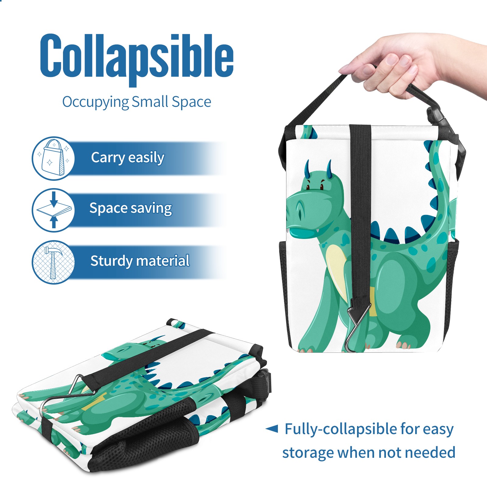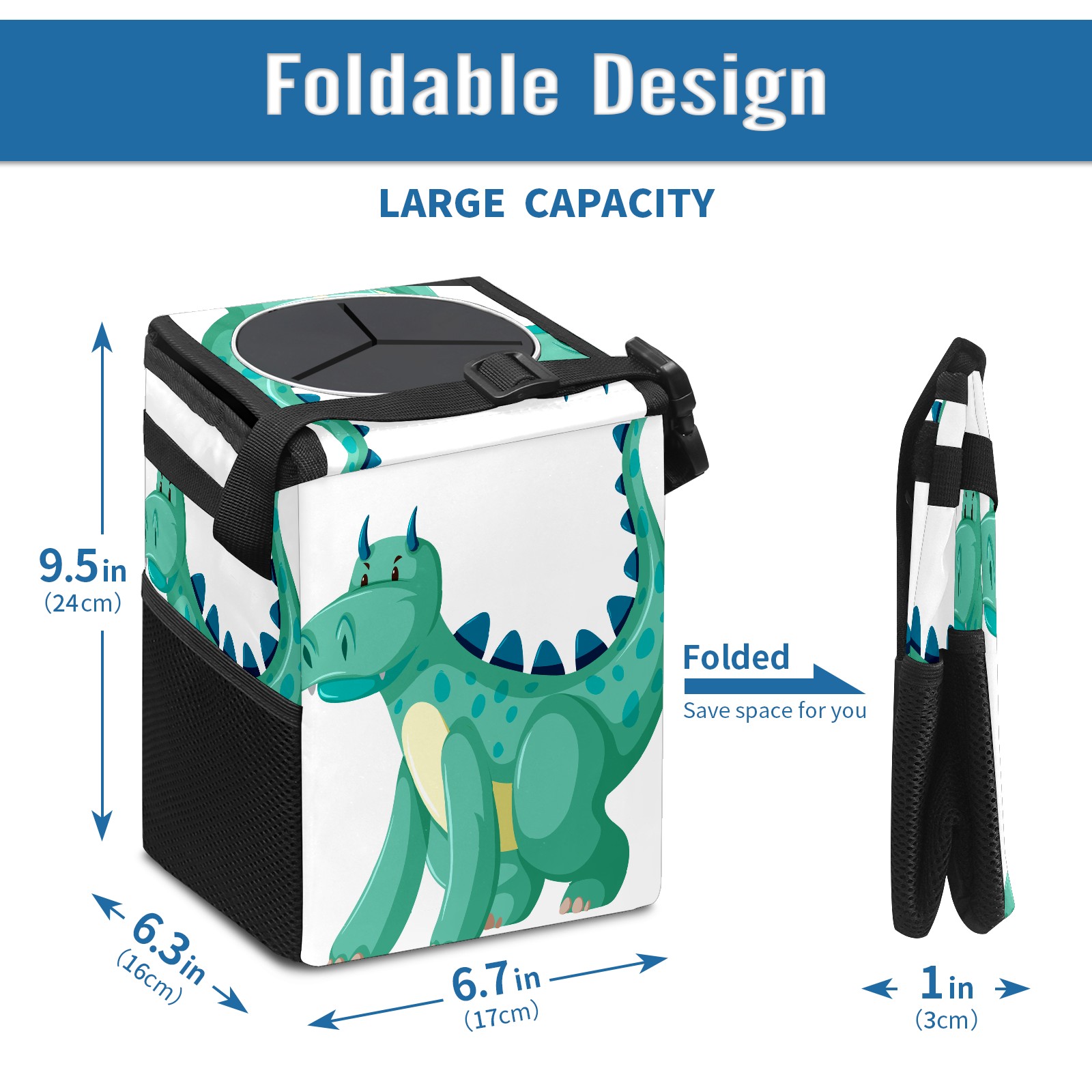 FOLDABLE & SPACE-SAVING Compact 9.5"×6.7"×6.3" size fits perfectly in any vehicle space Instantly folds flat when not in use - stores effortlessly under seats or in door pockets MULTI-FUNCTION ORGANIZER Large main compartment holds bottles, wrappers and tissues Additional pockets for wet wipes, masks or small accessories WATERPROOF & LEAKPROOF Made with premium leak-proof polyester material Contains messy spills from drinks, snacks, and food Wipe-clean surface resists stains and eliminates odors Package Includes 1× Car Trash Can