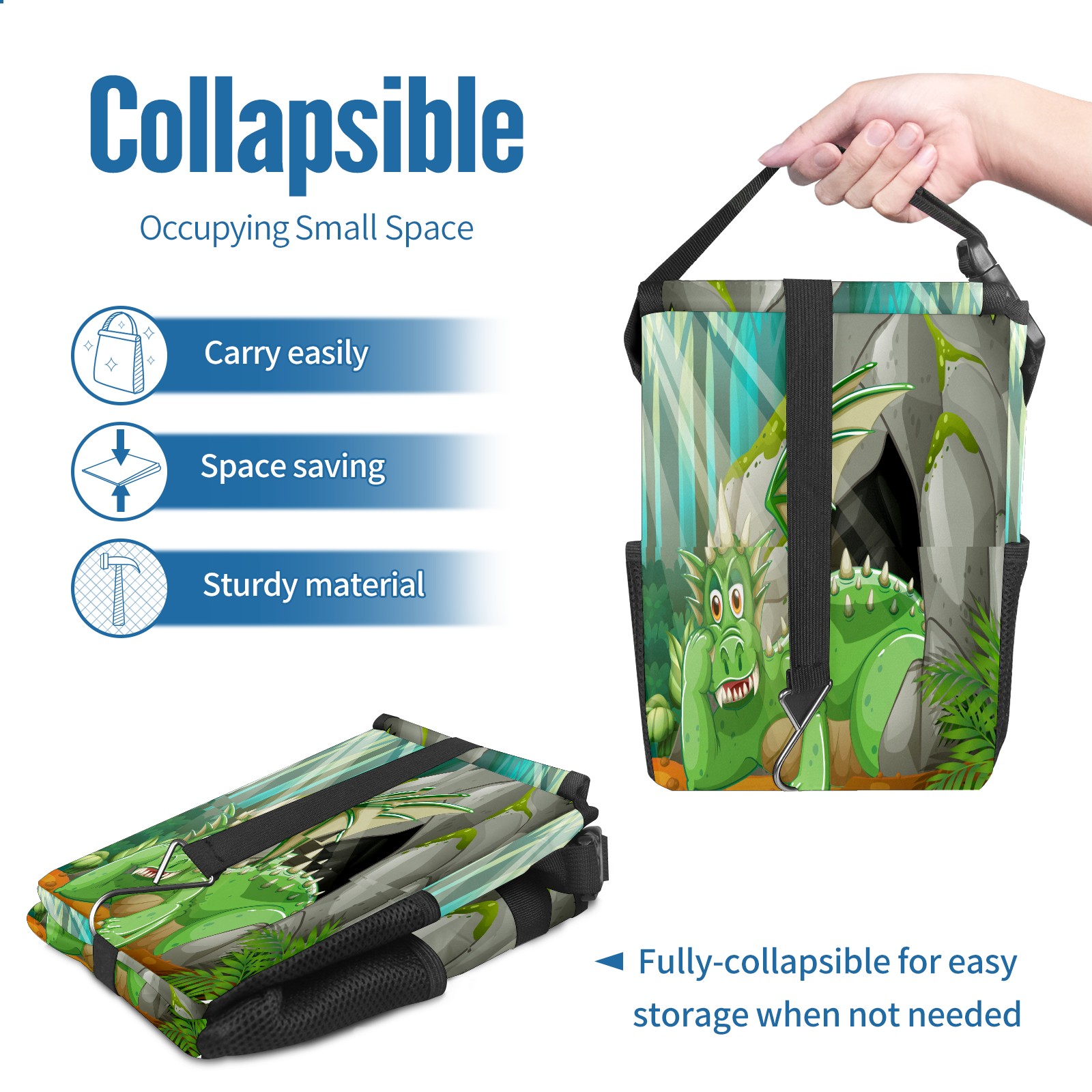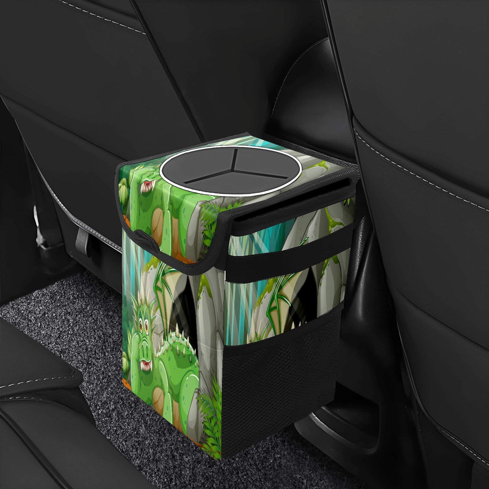 FOLDABLE & SPACE-SAVING Compact 9.5"×6.7"×6.3" size fits perfectly in any vehicle space Instantly folds flat when not in use - stores effortlessly under seats or in door pockets MULTI-FUNCTION ORGANIZER Large main compartment holds bottles, wrappers and tissues Additional pockets for wet wipes, masks or small accessories WATERPROOF & LEAKPROOF Made with premium leak-proof polyester material Contains messy spills from drinks, snacks, and food Wipe-clean surface resists stains and eliminates odors Package Includes 1× Car Trash Can