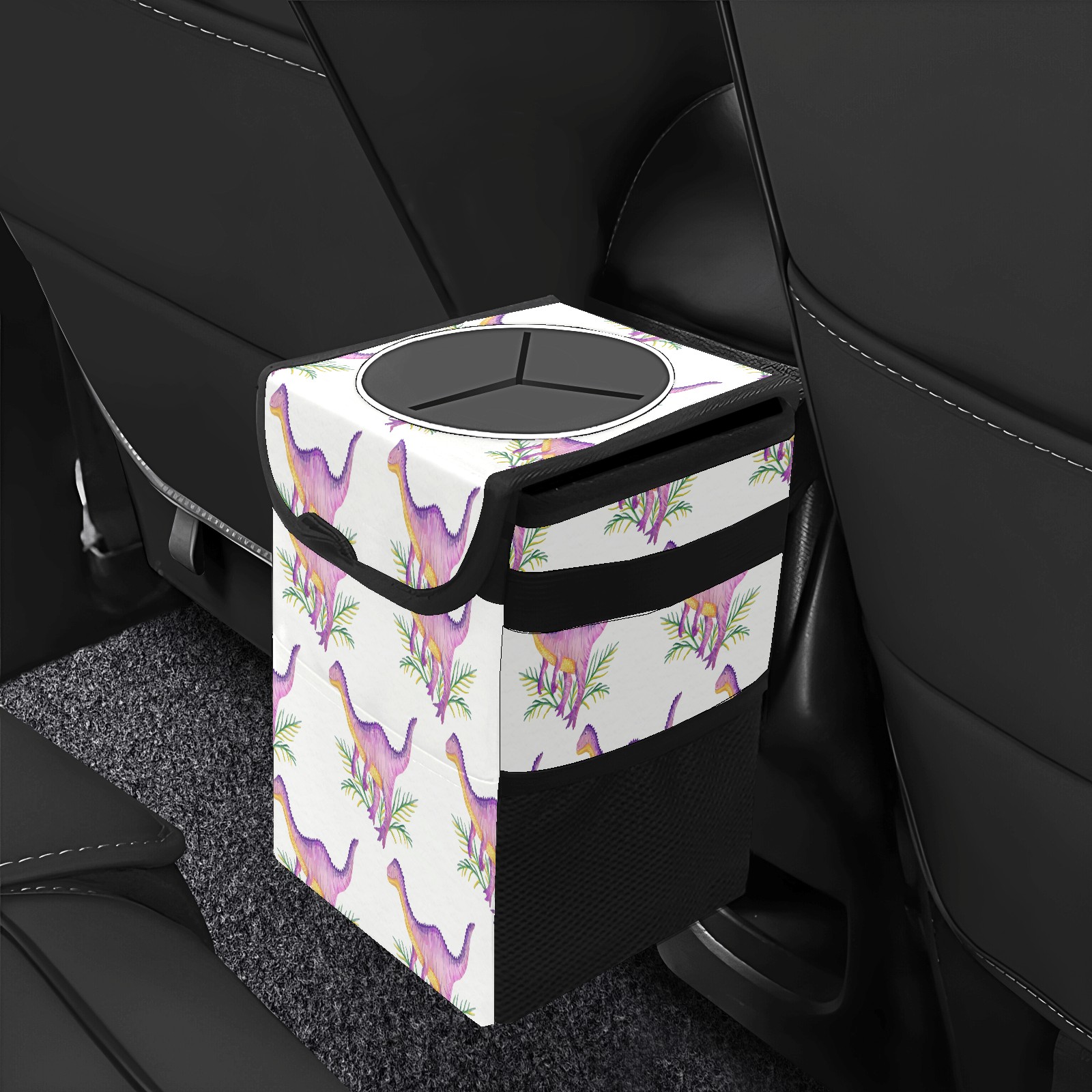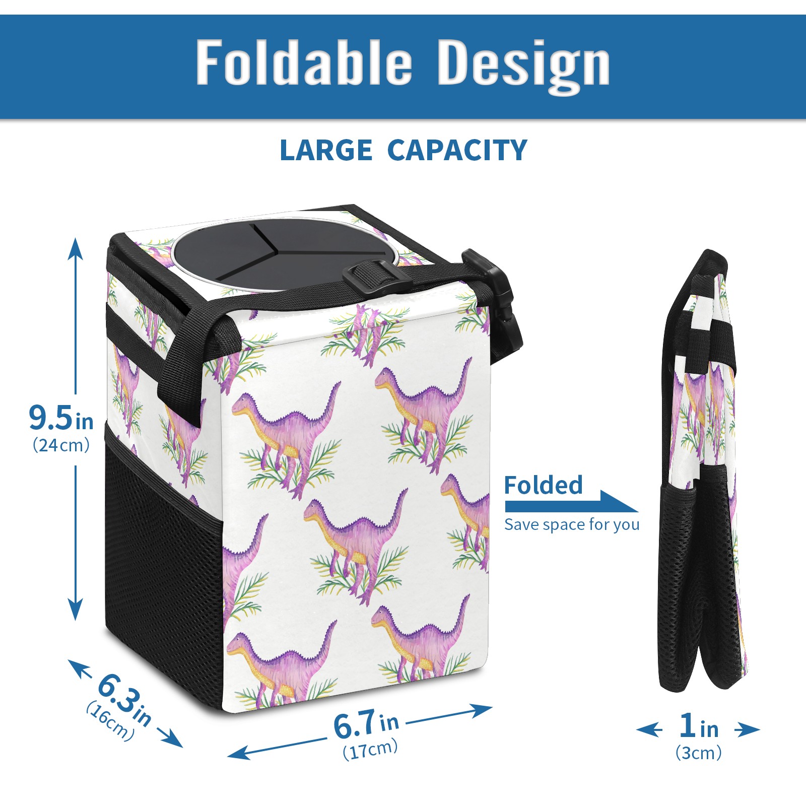 FOLDABLE & SPACE-SAVING Compact 9.5"×6.7"×6.3" size fits perfectly in any vehicle space Instantly folds flat when not in use - stores effortlessly under seats or in door pockets MULTI-FUNCTION ORGANIZER Large main compartment holds bottles, wrappers and tissues Additional pockets for wet wipes, masks or small accessories WATERPROOF & LEAKPROOF Made with premium leak-proof polyester material Contains messy spills from drinks, snacks, and food Wipe-clean surface resists stains and eliminates odors Package Includes 1× Car Trash Can