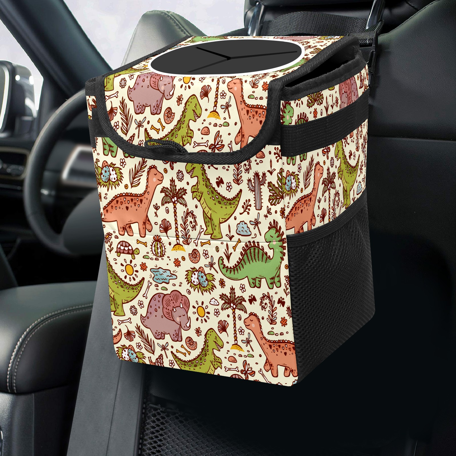 Car Trash Bin with Lid Auto Garbage Bag Hanging for Back Seat - Leakproof Trash Can for Cars SUVs Trucks Vehicle Car Accessories (Cute Cartoon Dinosaur)