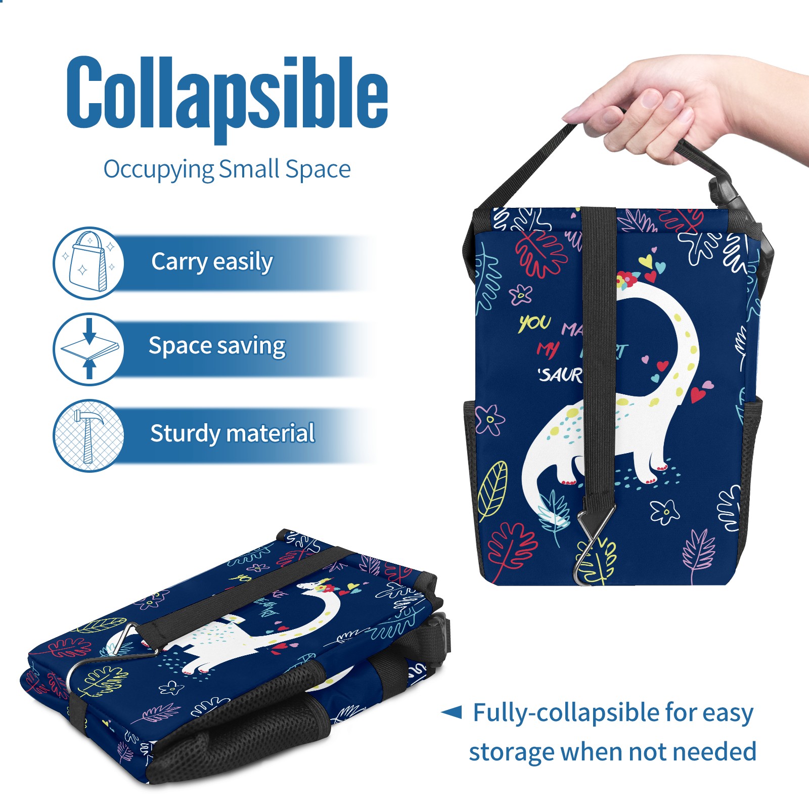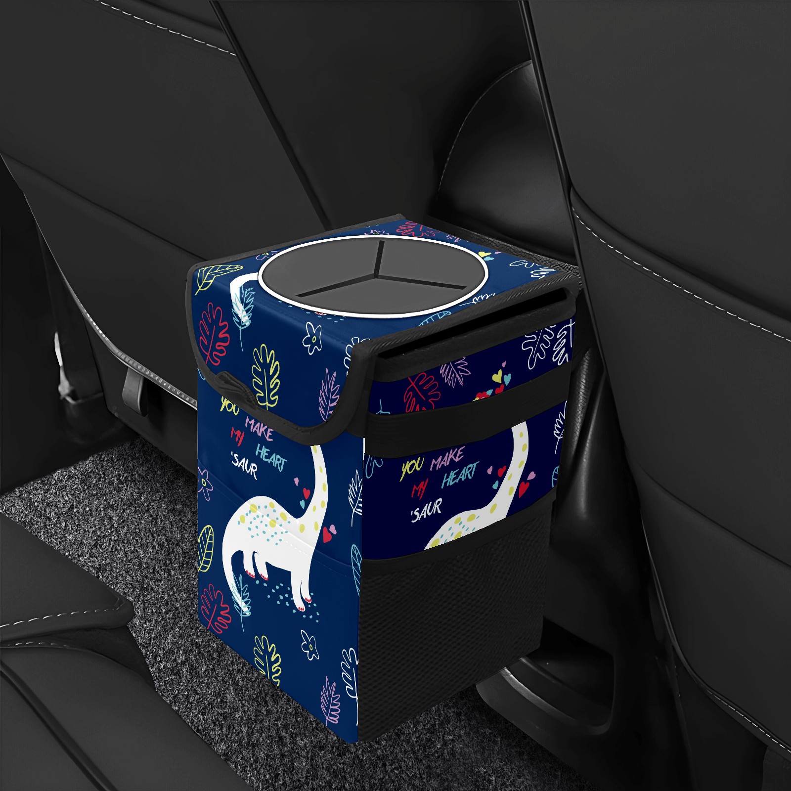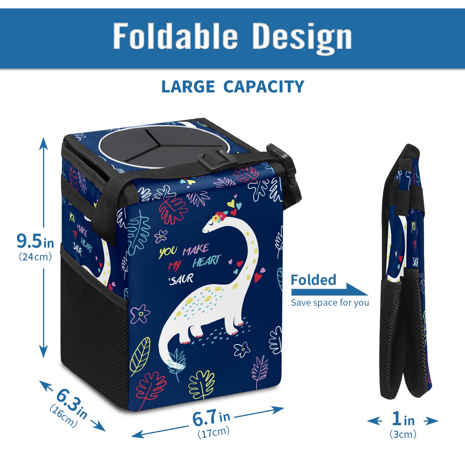 FOLDABLE & SPACE-SAVING Compact 9.5"×6.7"×6.3" size fits perfectly in any vehicle space Instantly folds flat when not in use - stores effortlessly under seats or in door pockets MULTI-FUNCTION ORGANIZER Large main compartment holds bottles, wrappers and tissues Additional pockets for wet wipes, masks or small accessories WATERPROOF & LEAKPROOF Made with premium leak-proof polyester material Contains messy spills from drinks, snacks, and food Wipe-clean surface resists stains and eliminates odors Package Includes 1× Car Trash Can
