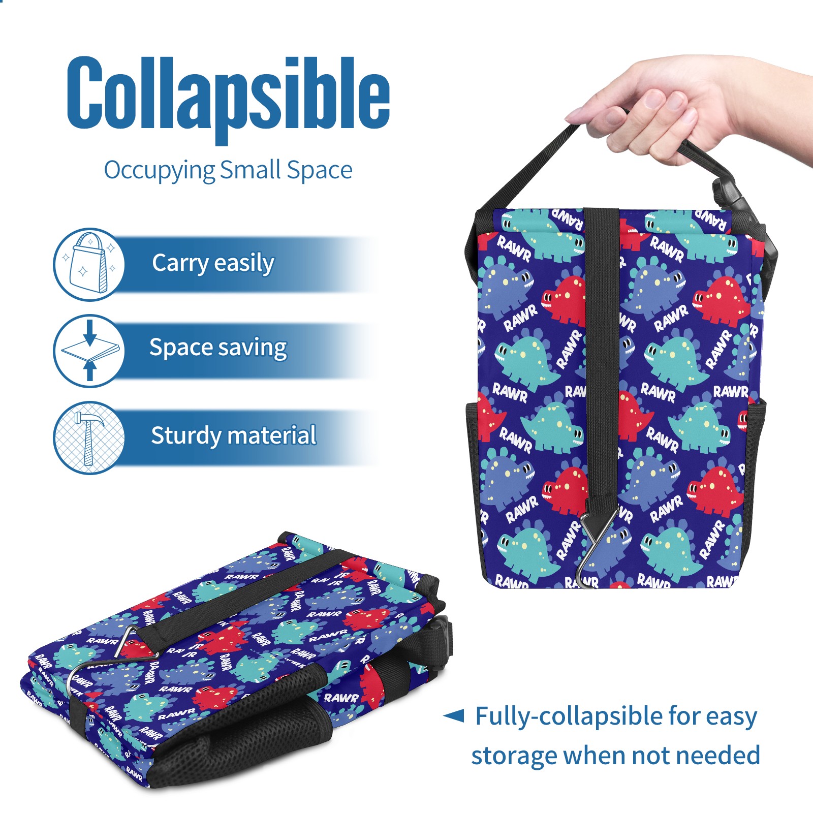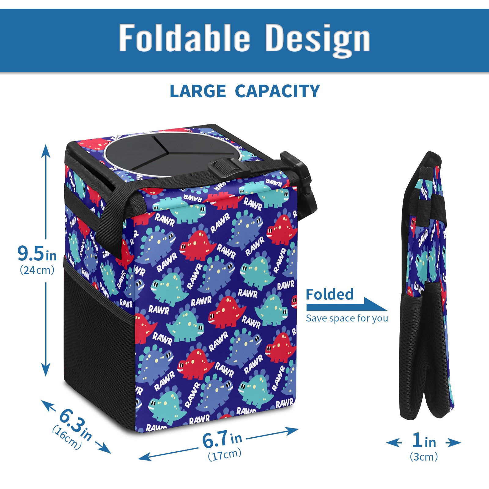 FOLDABLE & SPACE-SAVING Compact 9.5"×6.7"×6.3" size fits perfectly in any vehicle space Instantly folds flat when not in use - stores effortlessly under seats or in door pockets MULTI-FUNCTION ORGANIZER Large main compartment holds bottles, wrappers and tissues Additional pockets for wet wipes, masks or small accessories WATERPROOF & LEAKPROOF Made with premium leak-proof polyester material Contains messy spills from drinks, snacks, and food Wipe-clean surface resists stains and eliminates odors Package Includes 1× Car Trash Can