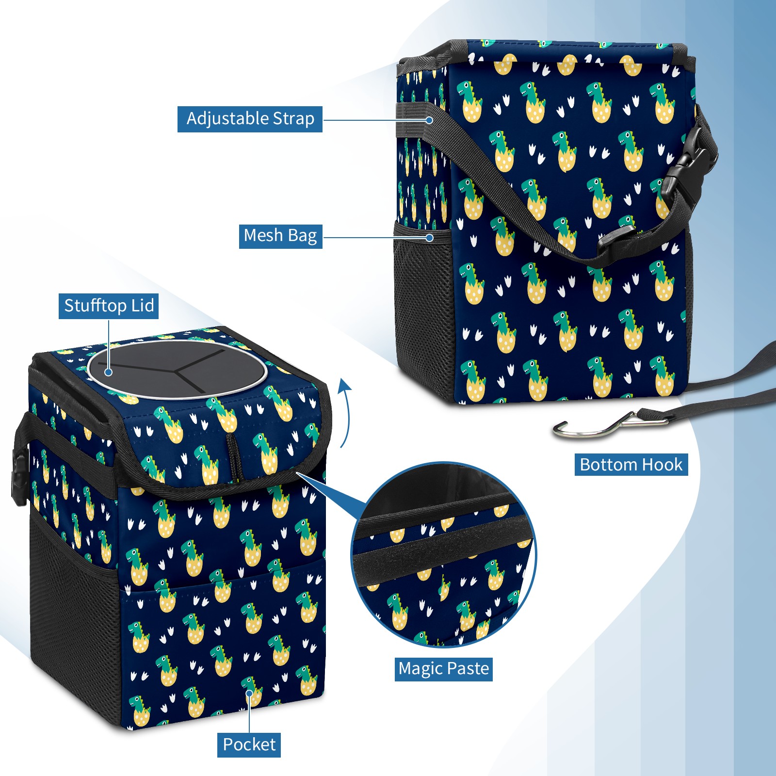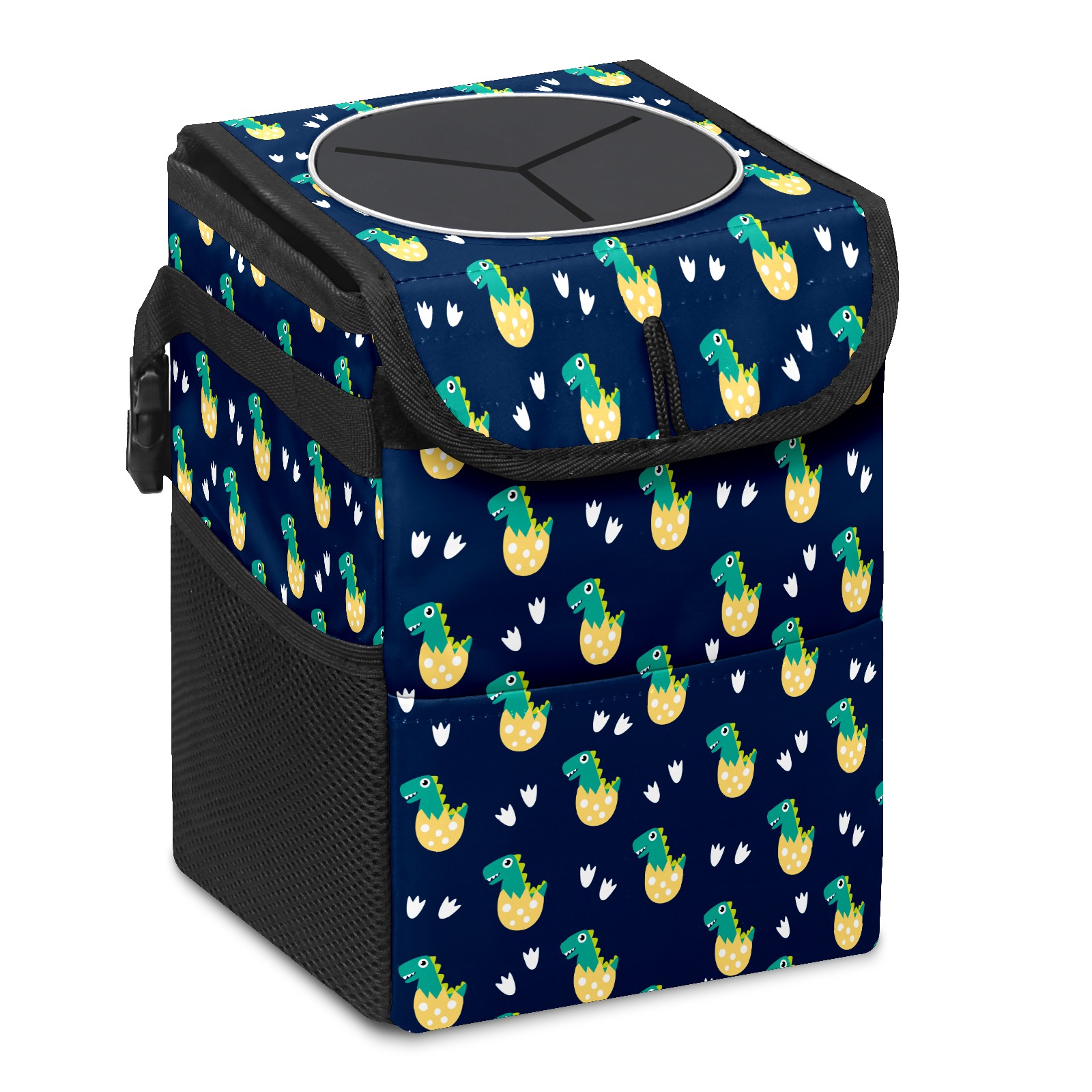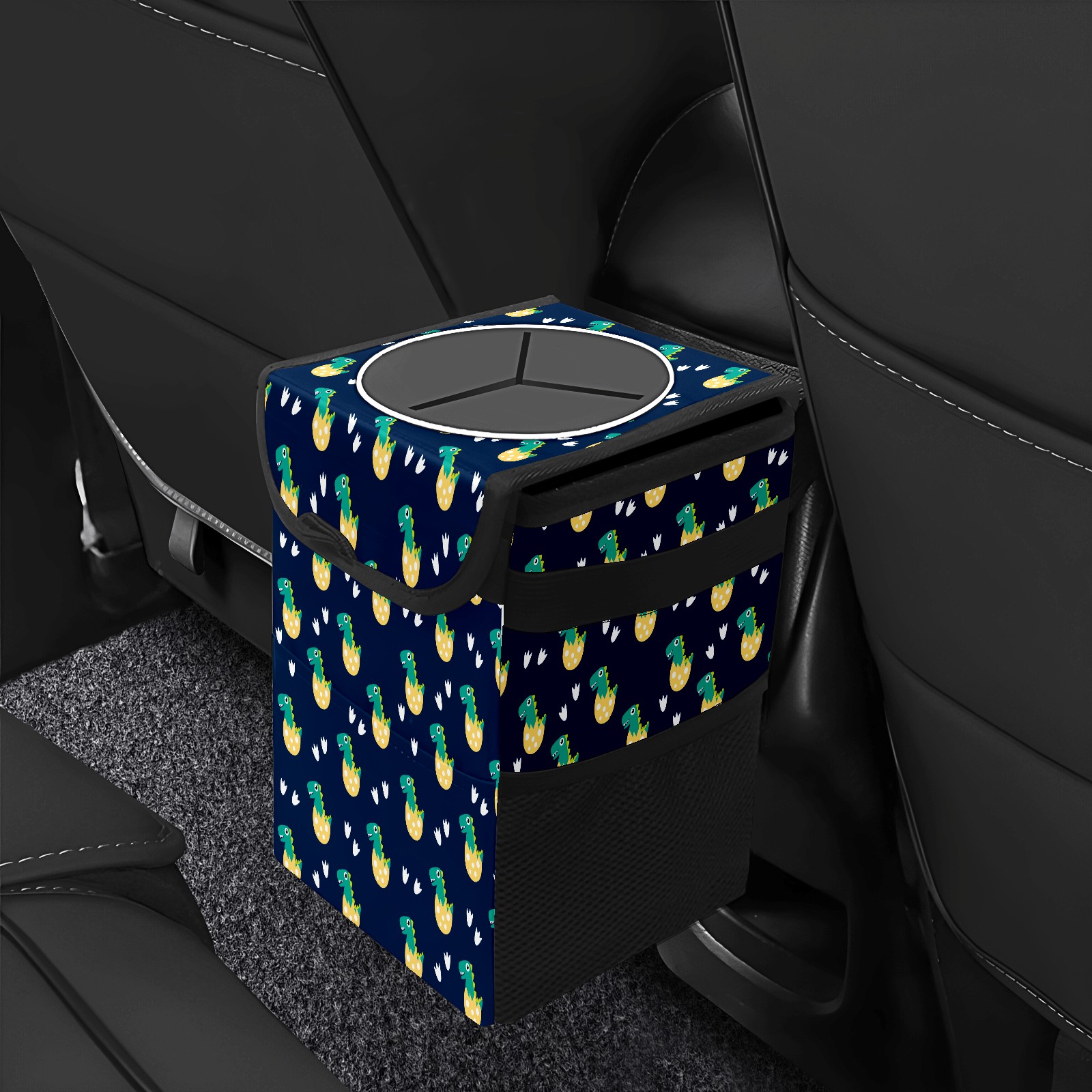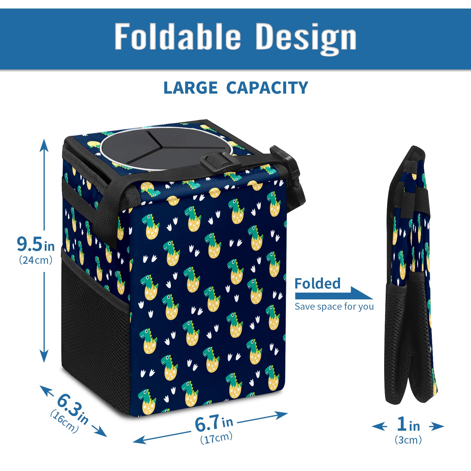 FOLDABLE & SPACE-SAVING Compact 9.5"×6.7"×6.3" size fits perfectly in any vehicle space Instantly folds flat when not in use - stores effortlessly under seats or in door pockets MULTI-FUNCTION ORGANIZER Large main compartment holds bottles, wrappers and tissues Additional pockets for wet wipes, masks or small accessories WATERPROOF & LEAKPROOF Made with premium leak-proof polyester material Contains messy spills from drinks, snacks, and food Wipe-clean surface resists stains and eliminates odors Package Includes 1× Car Trash Can