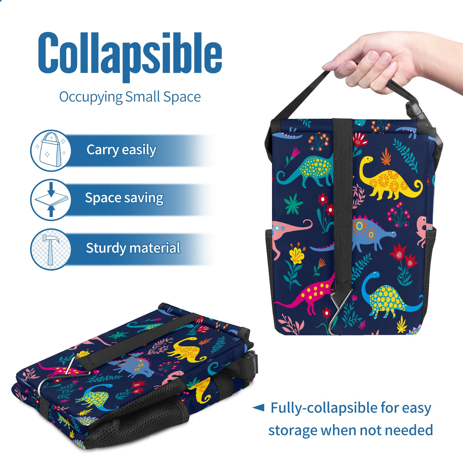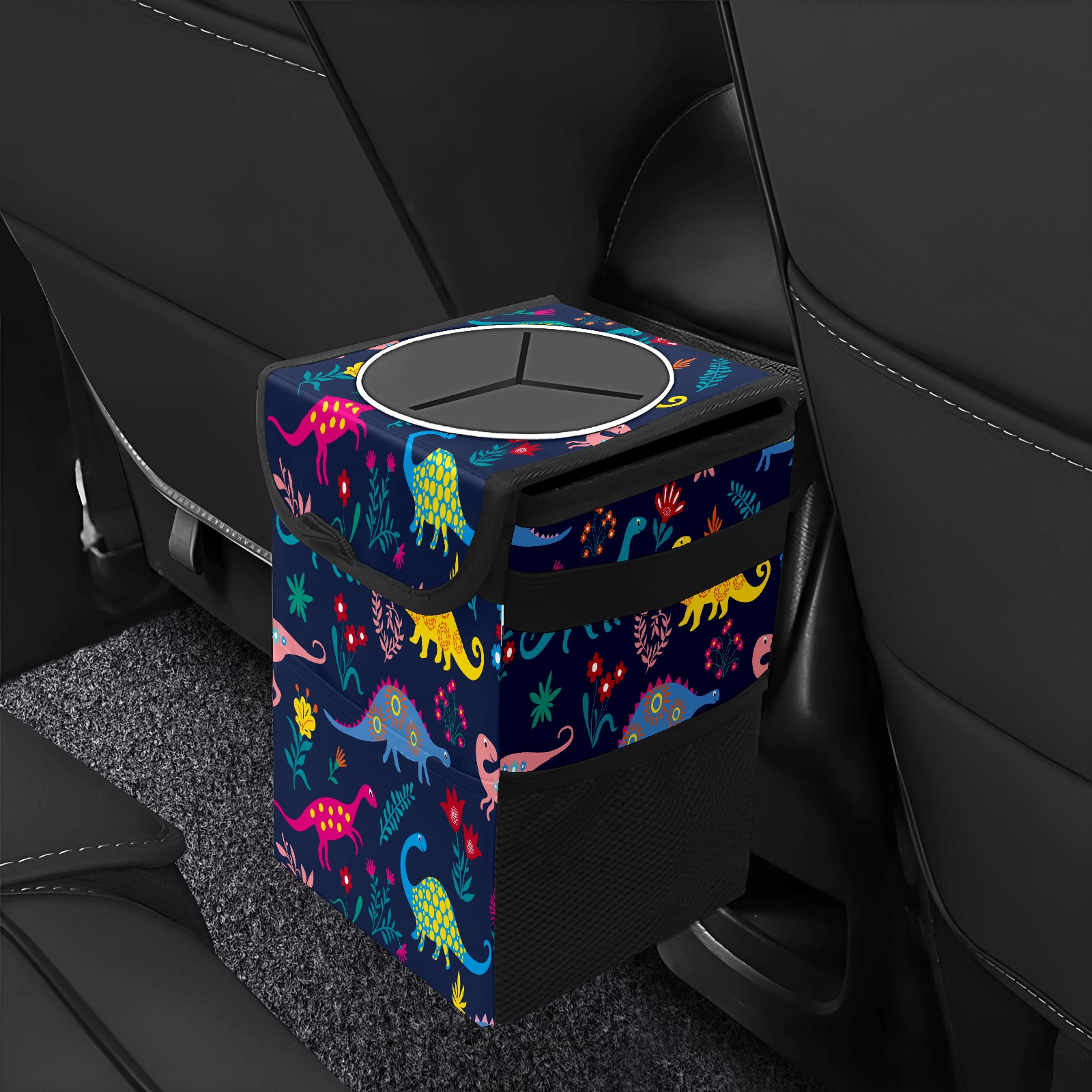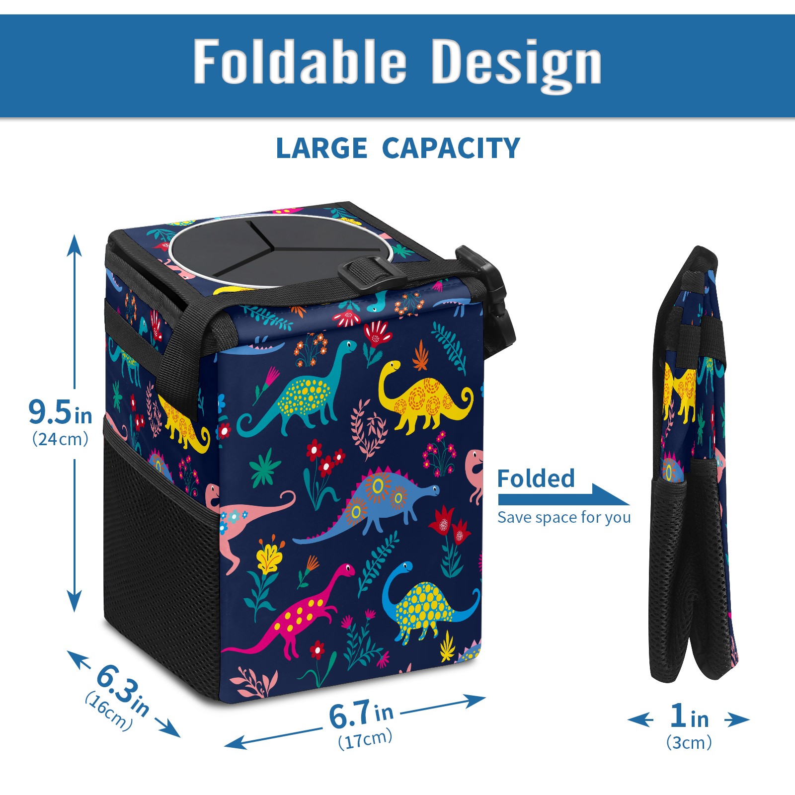 FOLDABLE & SPACE-SAVING Compact 9.5"×6.7"×6.3" size fits perfectly in any vehicle space Instantly folds flat when not in use - stores effortlessly under seats or in door pockets MULTI-FUNCTION ORGANIZER Large main compartment holds bottles, wrappers and tissues Additional pockets for wet wipes, masks or small accessories WATERPROOF & LEAKPROOF Made with premium leak-proof polyester material Contains messy spills from drinks, snacks, and food Wipe-clean surface resists stains and eliminates odors Package Includes 1× Car Trash Can