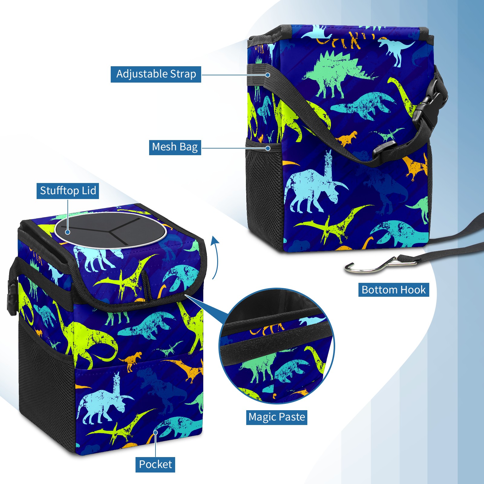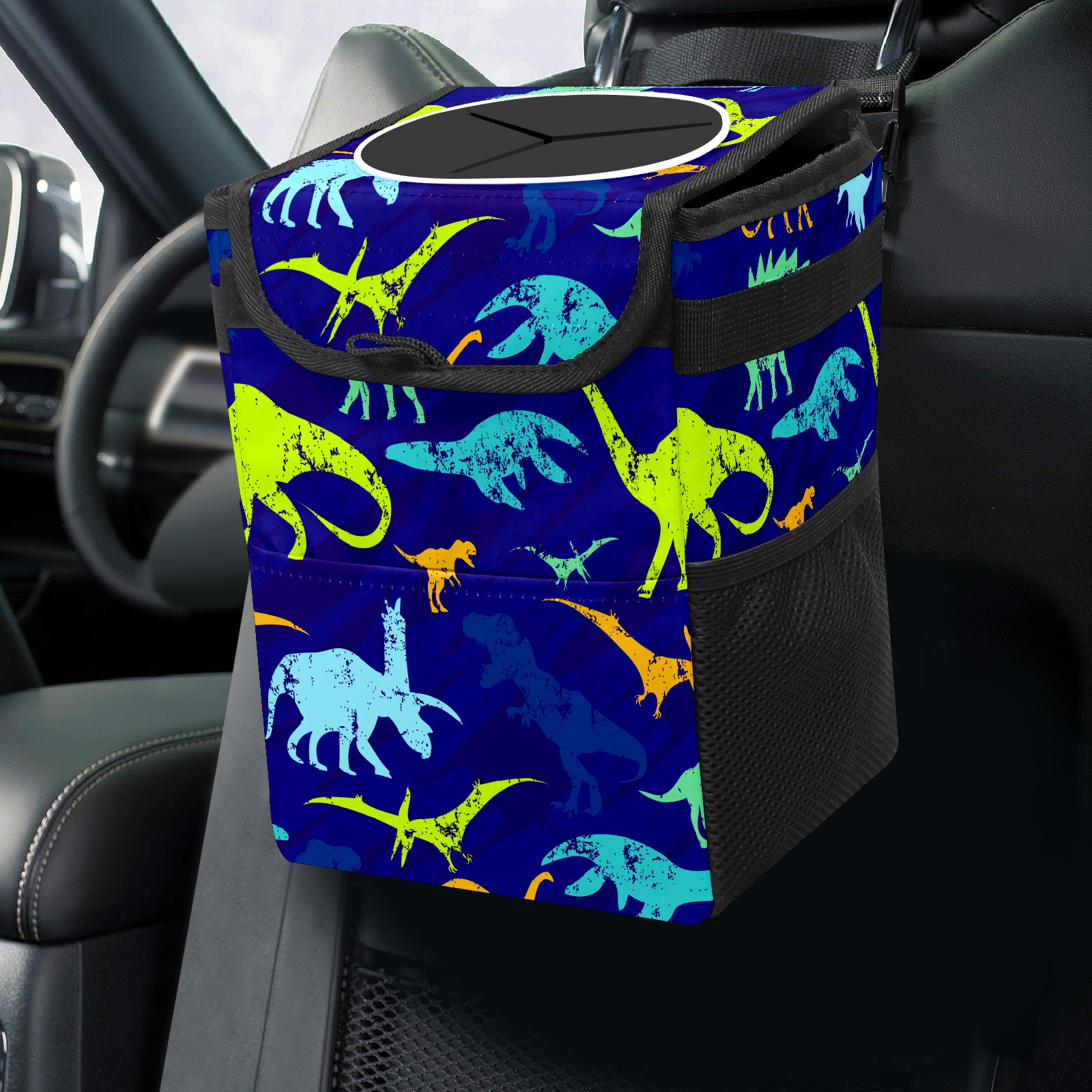 Car Trash Bin with Lid Auto Garbage Bag Hanging for Back Seat - Leakproof Trash Can for Cars SUVs Trucks Vehicle Car Accessories (Color Dinosaurs Blue)