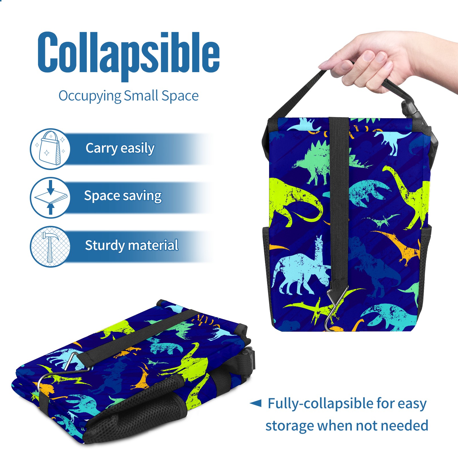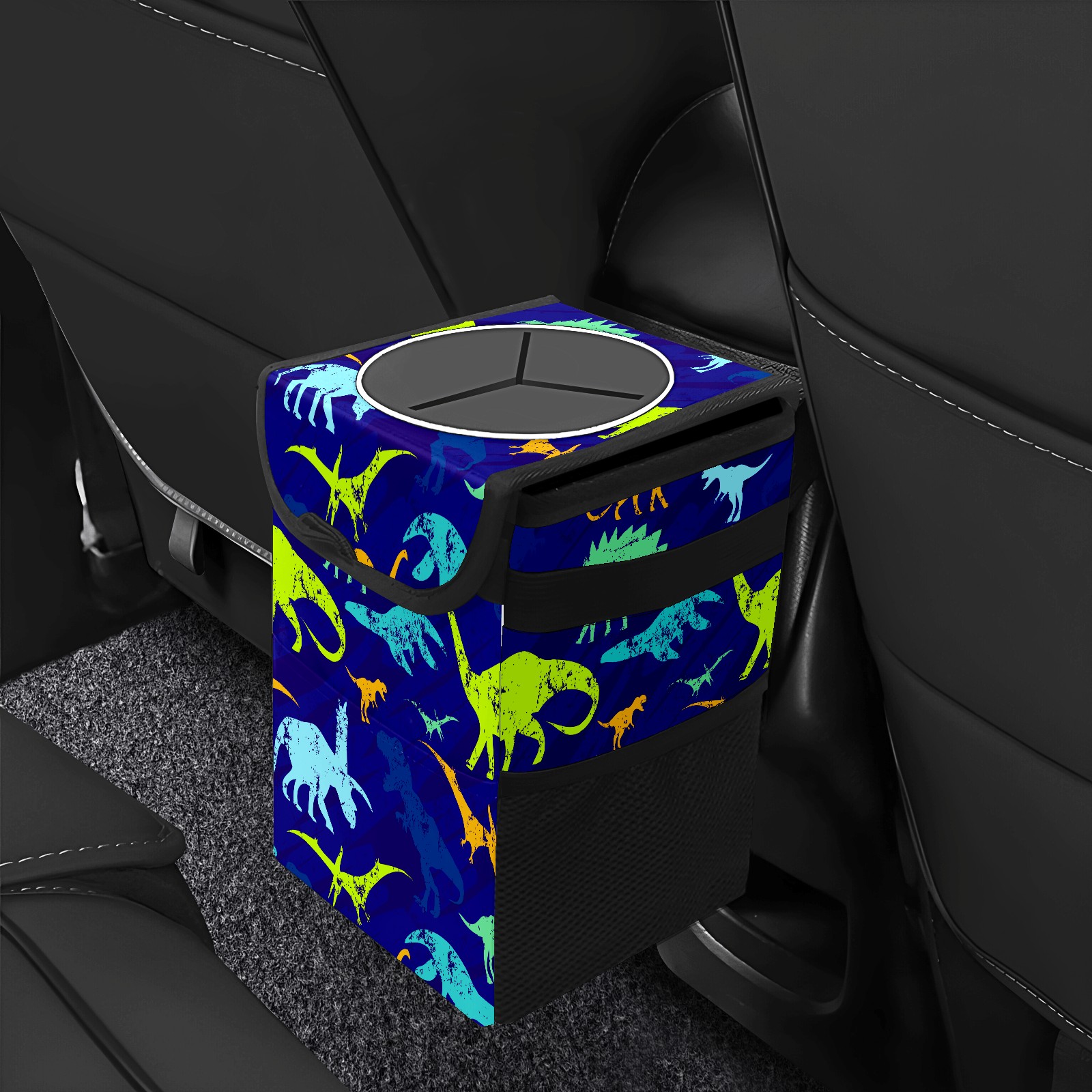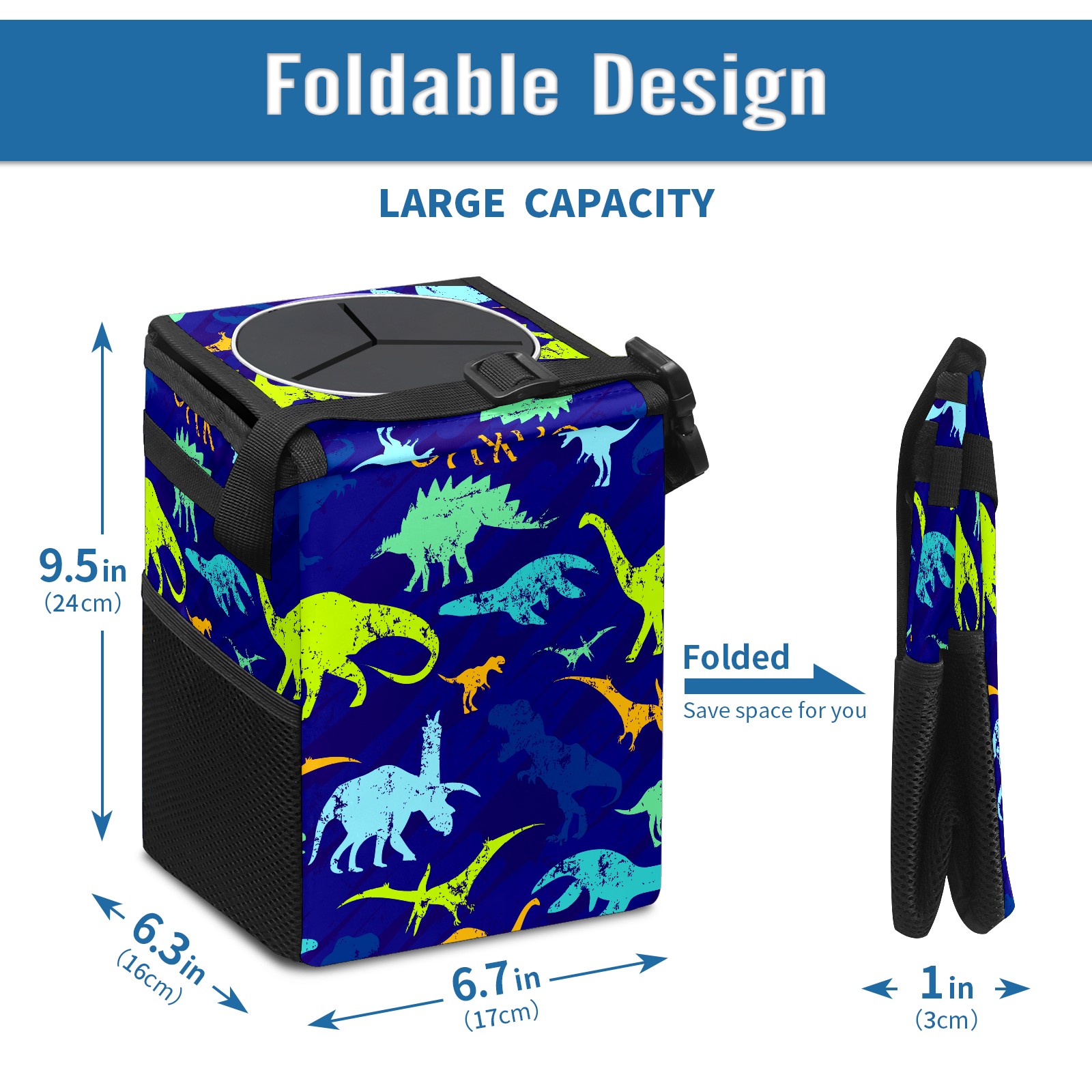 FOLDABLE & SPACE-SAVING Compact 9.5"×6.7"×6.3" size fits perfectly in any vehicle space Instantly folds flat when not in use - stores effortlessly under seats or in door pockets MULTI-FUNCTION ORGANIZER Large main compartment holds bottles, wrappers and tissues Additional pockets for wet wipes, masks or small accessories WATERPROOF & LEAKPROOF Made with premium leak-proof polyester material Contains messy spills from drinks, snacks, and food Wipe-clean surface resists stains and eliminates odors Package Includes 1× Car Trash Can