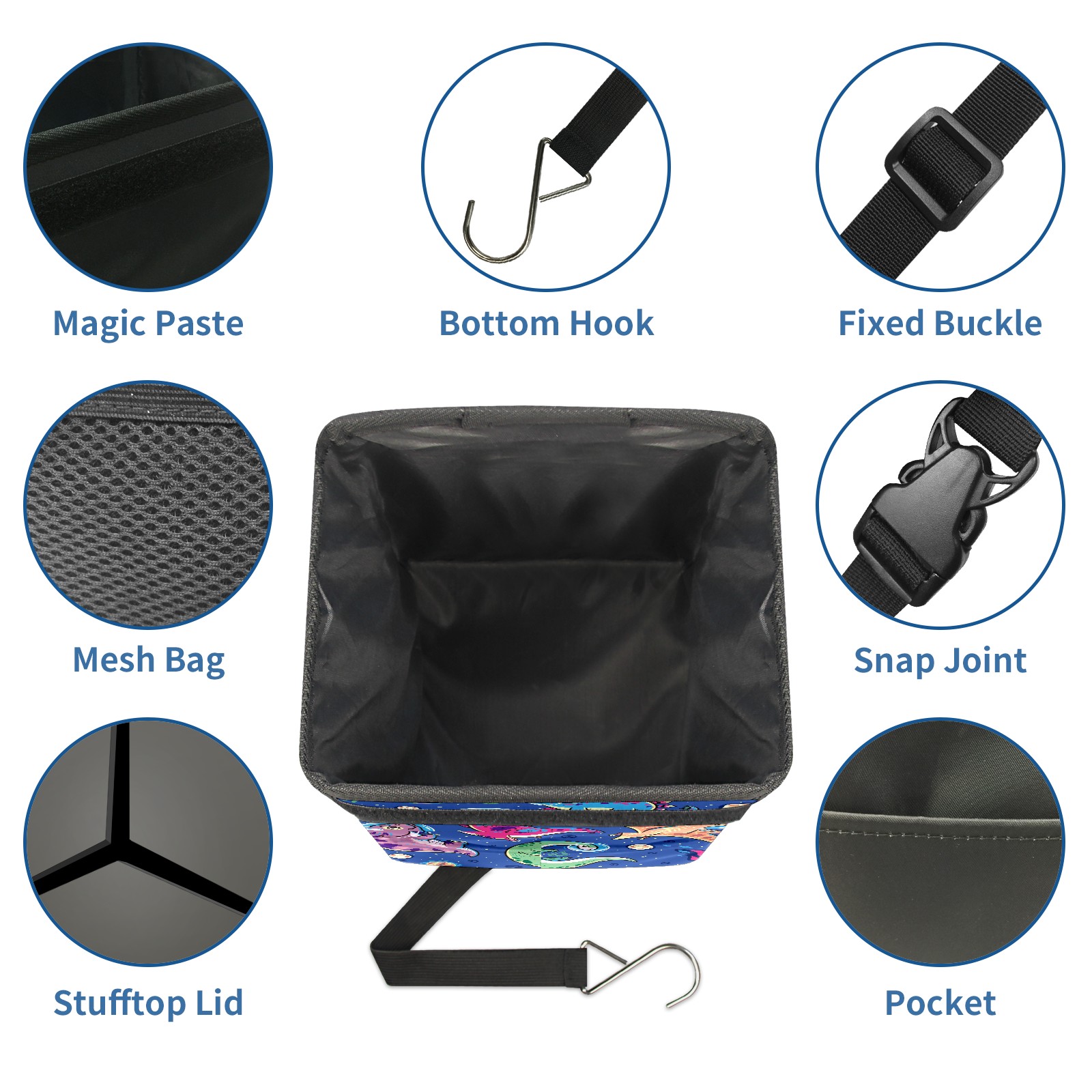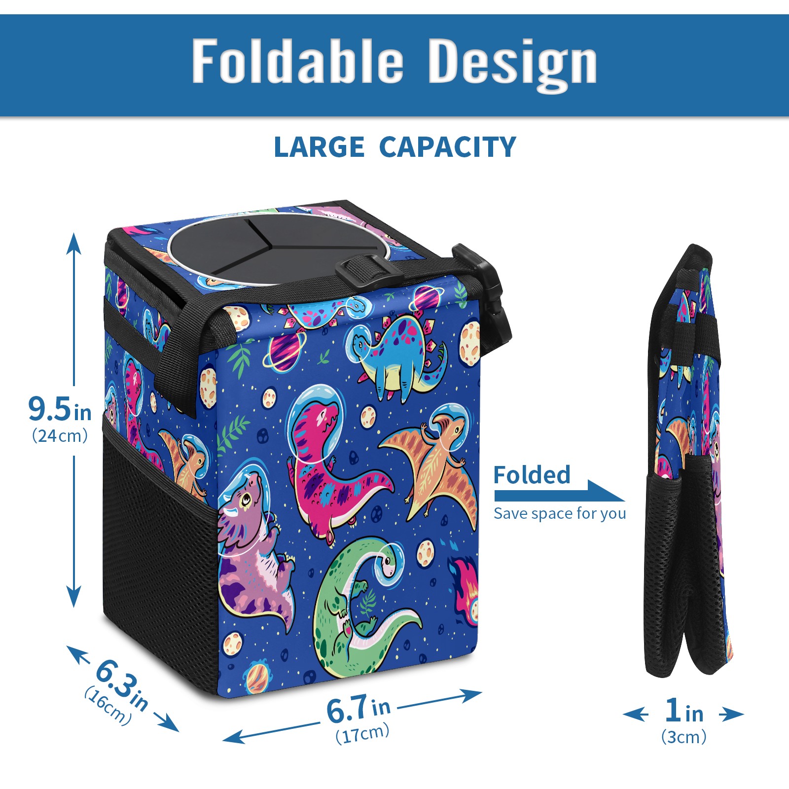 FOLDABLE & SPACE-SAVING Compact 9.5"×6.7"×6.3" size fits perfectly in any vehicle space Instantly folds flat when not in use - stores effortlessly under seats or in door pockets MULTI-FUNCTION ORGANIZER Large main compartment holds bottles, wrappers and tissues Additional pockets for wet wipes, masks or small accessories WATERPROOF & LEAKPROOF Made with premium leak-proof polyester material Contains messy spills from drinks, snacks, and food Wipe-clean surface resists stains and eliminates odors Package Includes 1× Car Trash Can
