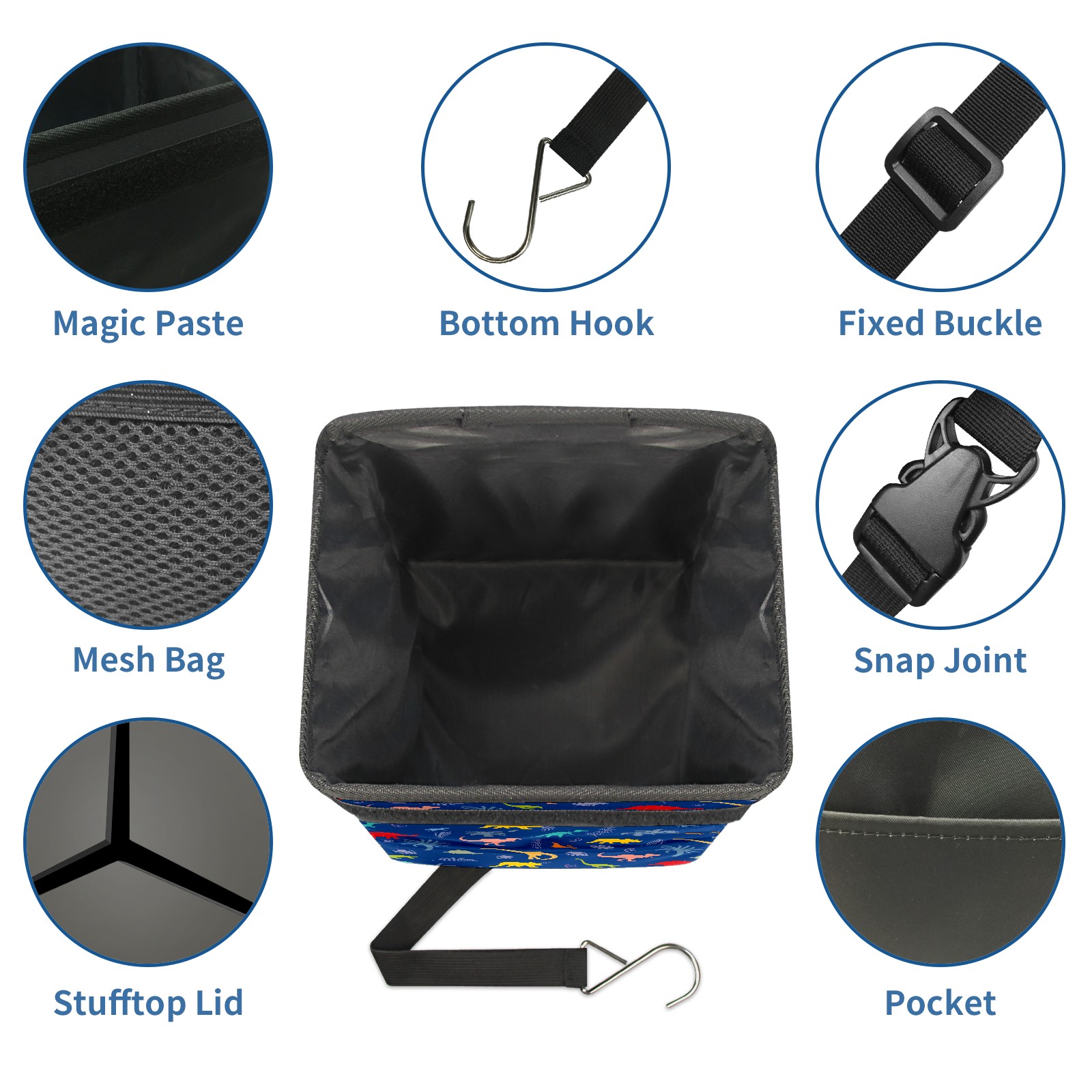 • FOLDABLE & SPACE-SAVING Compact 9.5"×6.7"×6.3" size fits perfectly in any vehicle space Instantly folds flat when not in use - stores effortlessly under seats or in door pockets MULTI-FUNCTION ORGANIZER Large main compartment holds bottles, wrappers and tissues Additional pockets for wet wipes, masks or small accessories WATERPROOF & LEAKPROOF Made with premium leak-proof polyester material Contains messy spills from drinks, snacks, and food Wipe-clean surface resists stains and eliminates odors Package Includes 1× Car Trash Can