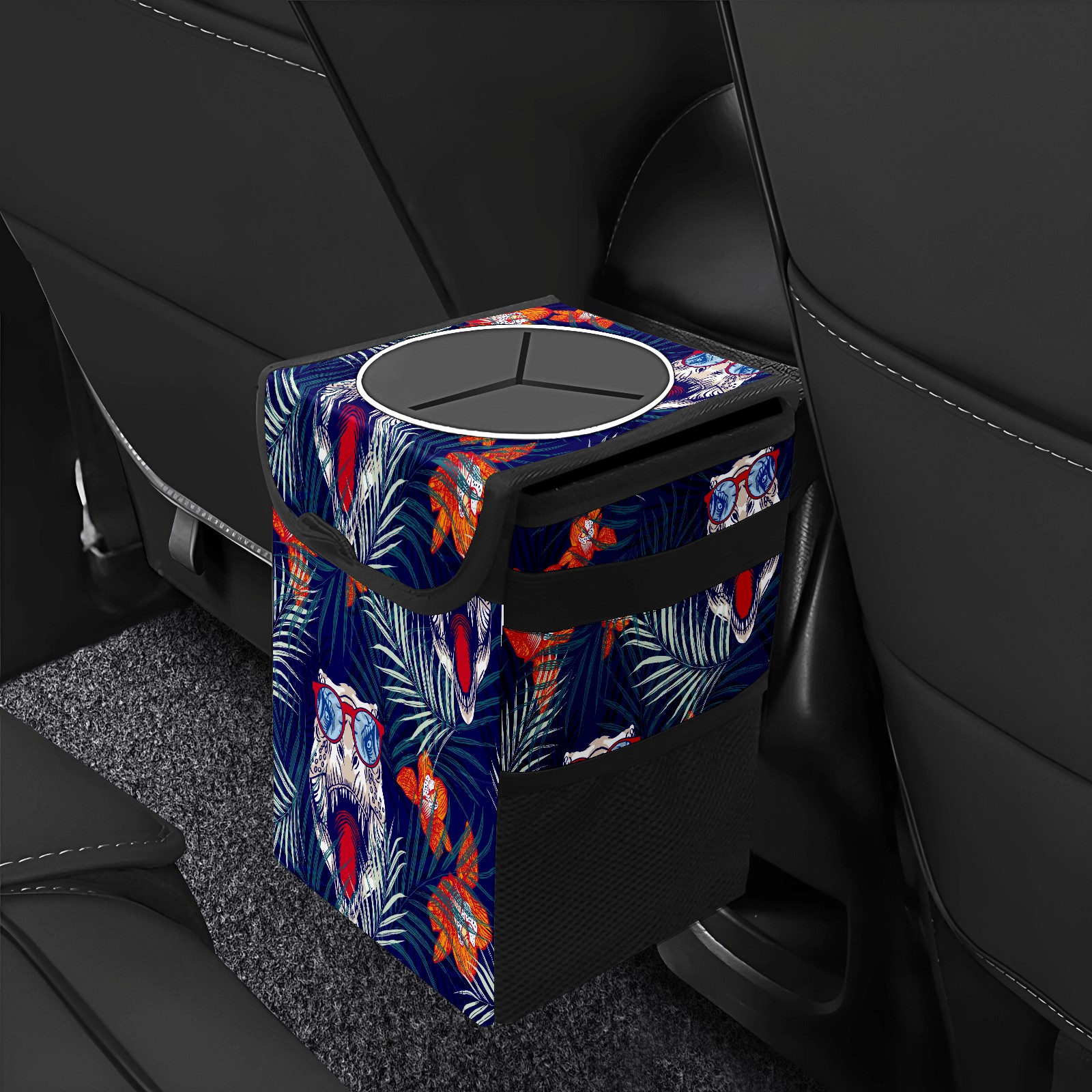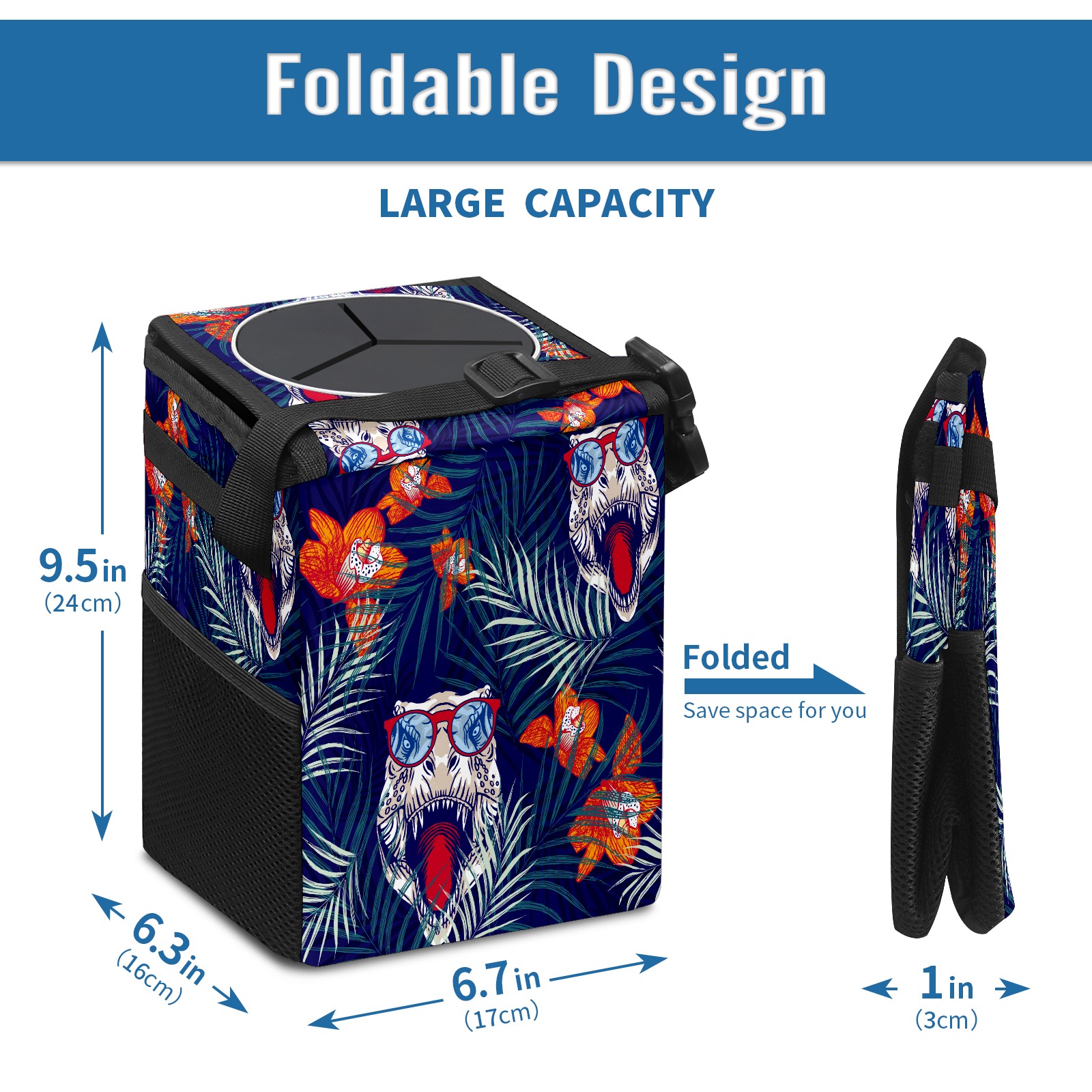 FOLDABLE & SPACE-SAVING Compact 9.5"×6.7"×6.3" size fits perfectly in any vehicle space Instantly folds flat when not in use - stores effortlessly under seats or in door pockets MULTI-FUNCTION ORGANIZER Large main compartment holds bottles, wrappers and tissues Additional pockets for wet wipes, masks or small accessories WATERPROOF & LEAKPROOF Made with premium leak-proof polyester material Contains messy spills from drinks, snacks, and food Wipe-clean surface resists stains and eliminates odors Package Includes 1× Car Trash Can