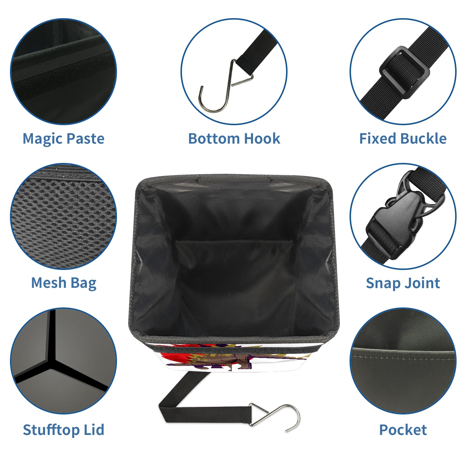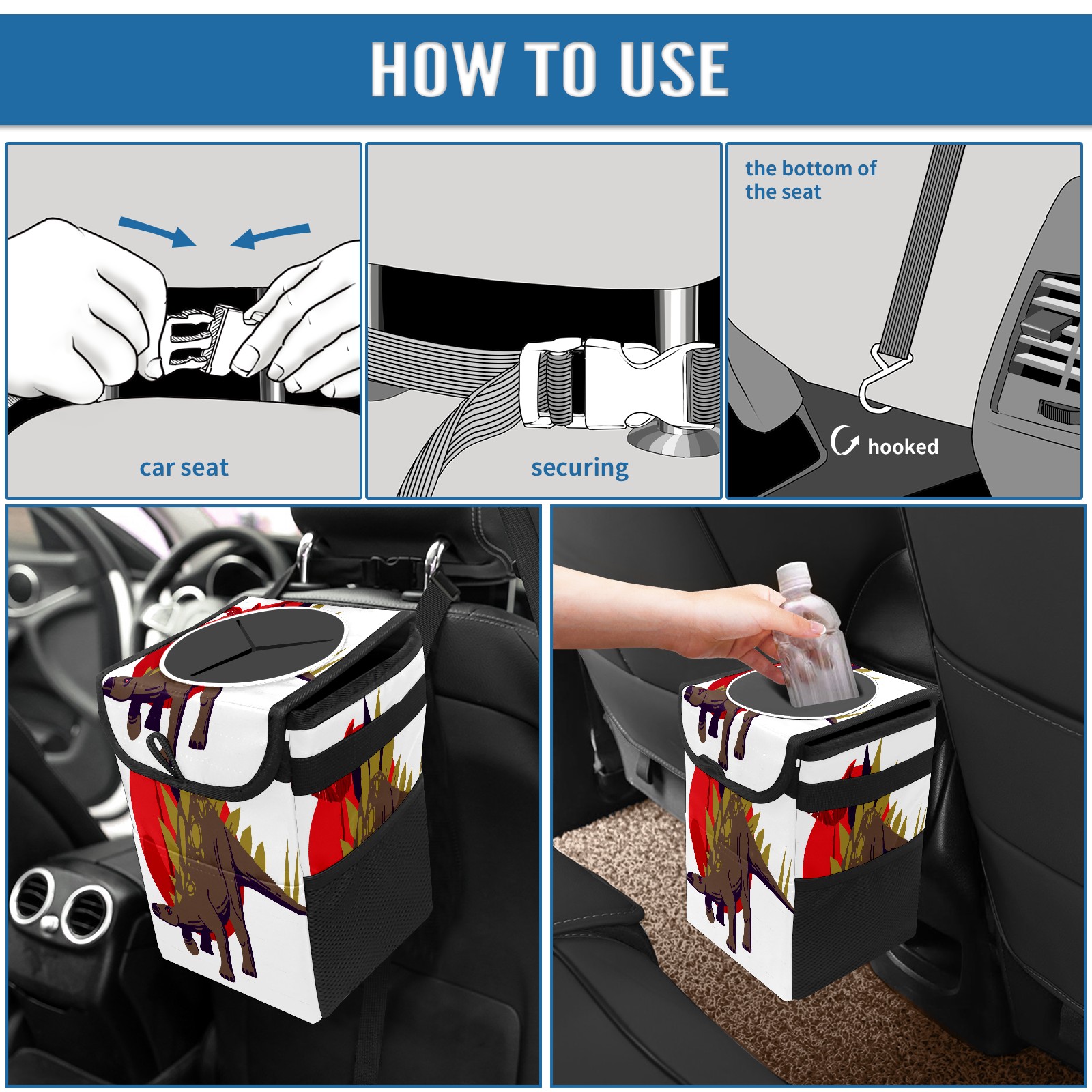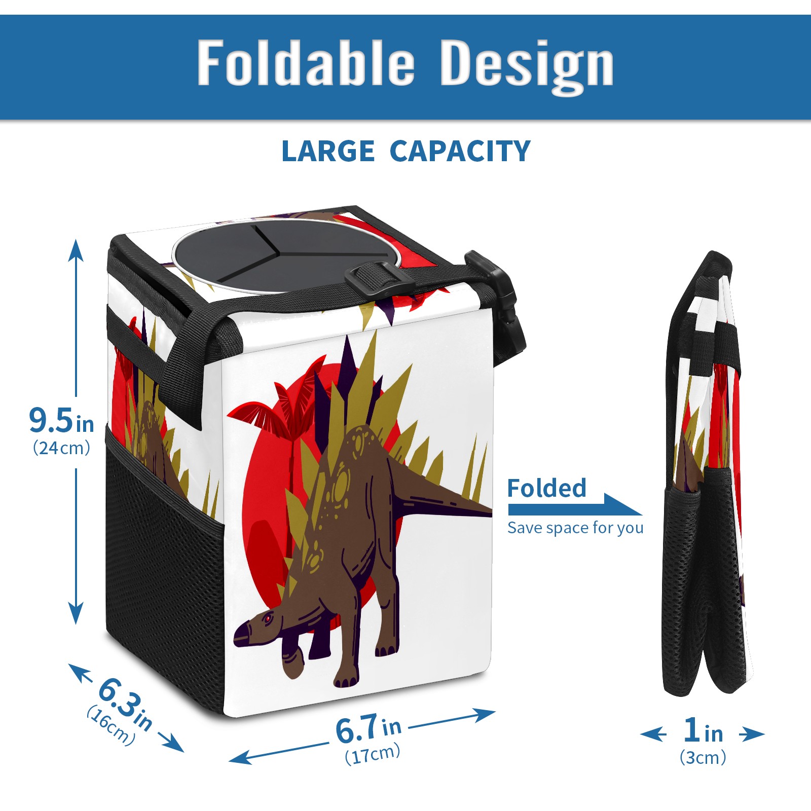 FOLDABLE & SPACE-SAVING Compact 9.5"×6.7"×6.3" size fits perfectly in any vehicle space Instantly folds flat when not in use - stores effortlessly under seats or in door pockets MULTI-FUNCTION ORGANIZER Large main compartment holds bottles, wrappers and tissues Additional pockets for wet wipes, masks or small accessories WATERPROOF & LEAKPROOF Made with premium leak-proof polyester material Contains messy spills from drinks, snacks, and food Wipe-clean surface resists stains and eliminates odors Package Includes 1× Car Trash Can
