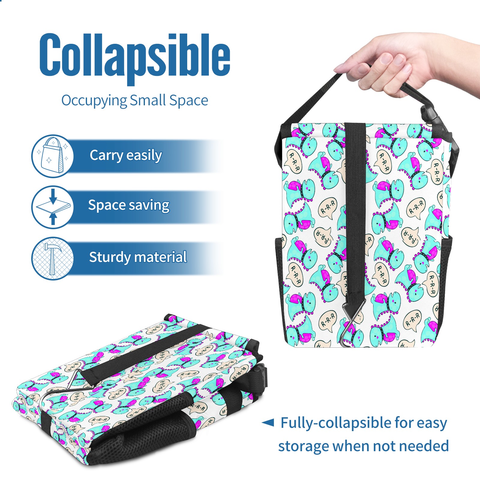 FOLDABLE & SPACE-SAVING Compact 9.5"×6.7"×6.3" size fits perfectly in any vehicle space Instantly folds flat when not in use - stores effortlessly under seats or in door pockets MULTI-FUNCTION ORGANIZER Large main compartment holds bottles, wrappers and tissues Additional pockets for wet wipes, masks or small accessories WATERPROOF & LEAKPROOF Made with premium leak-proof polyester material Contains messy spills from drinks, snacks, and food Wipe-clean surface resists stains and eliminates odors Package Includes 1× Car Trash Can