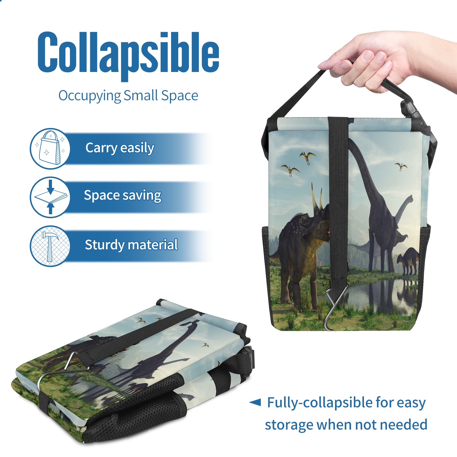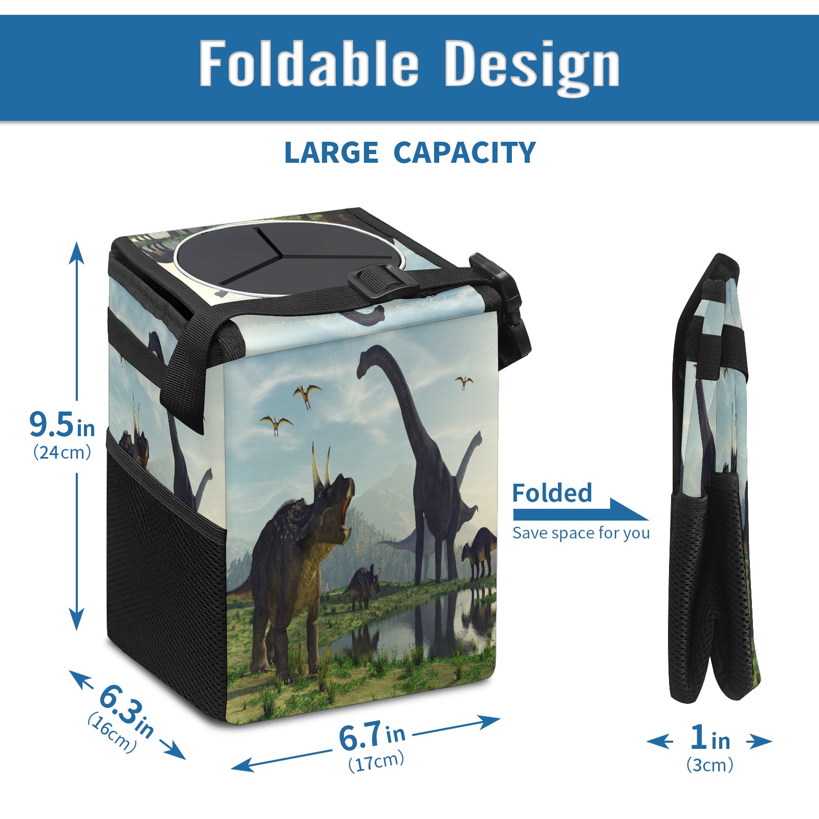 FOLDABLE & SPACE-SAVING Compact 9.5"×6.7"×6.3" size fits perfectly in any vehicle space Instantly folds flat when not in use - stores effortlessly under seats or in door pockets MULTI-FUNCTION ORGANIZER Large main compartment holds bottles, wrappers and tissues Additional pockets for wet wipes, masks or small accessories WATERPROOF & LEAKPROOF Made with premium leak-proof polyester material Contains messy spills from drinks, snacks, and food Wipe-clean surface resists stains and eliminates odors Package Includes 1× Car Trash Can