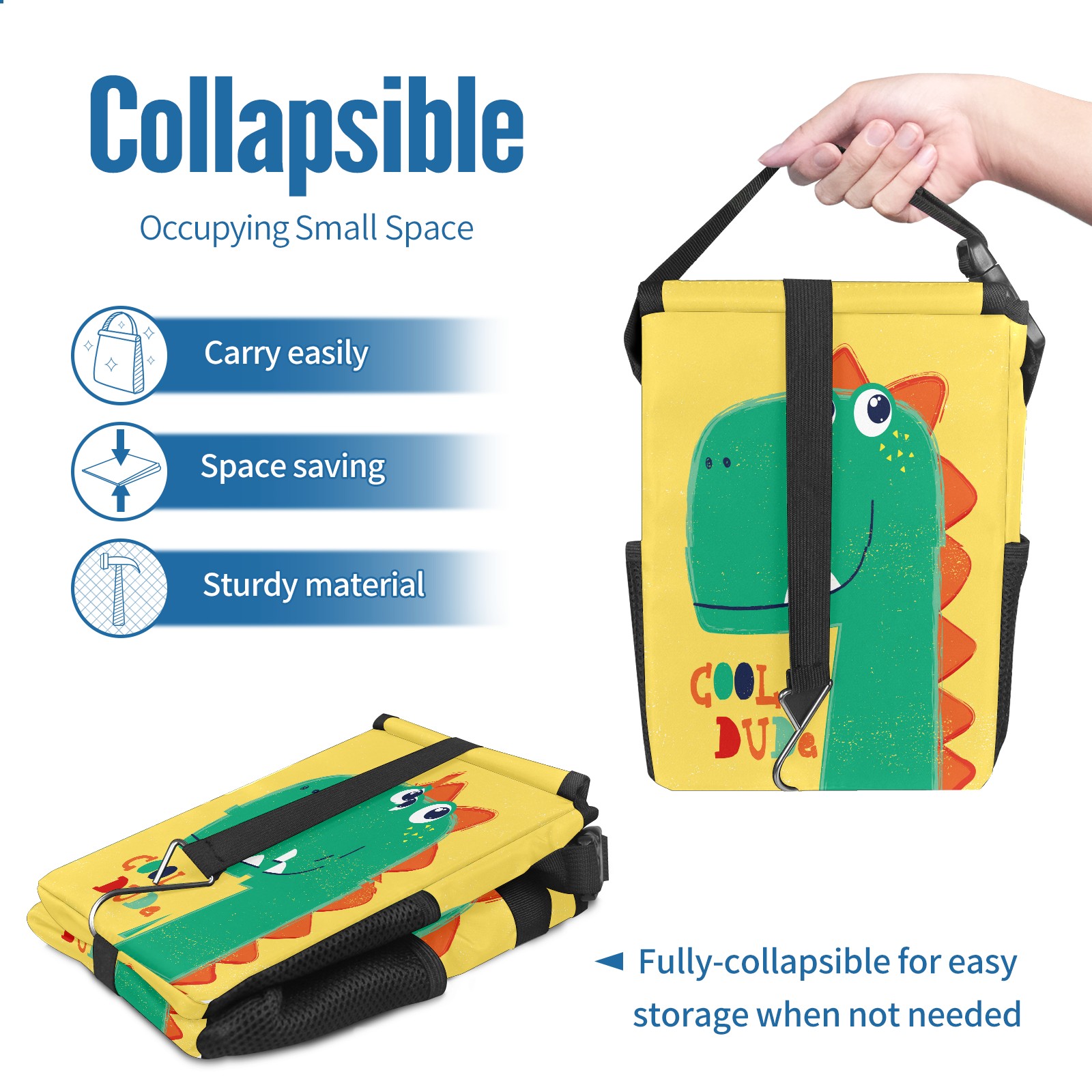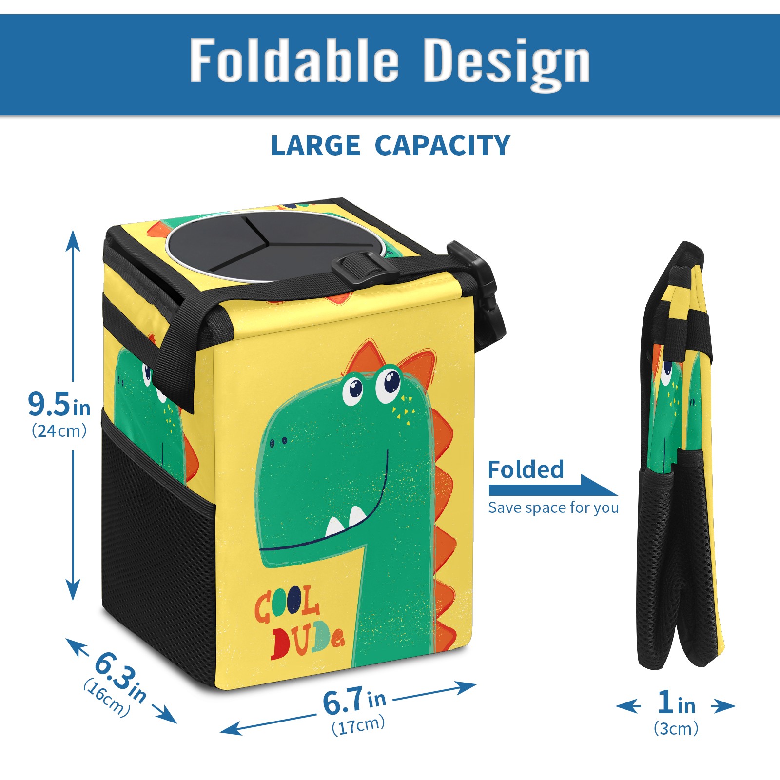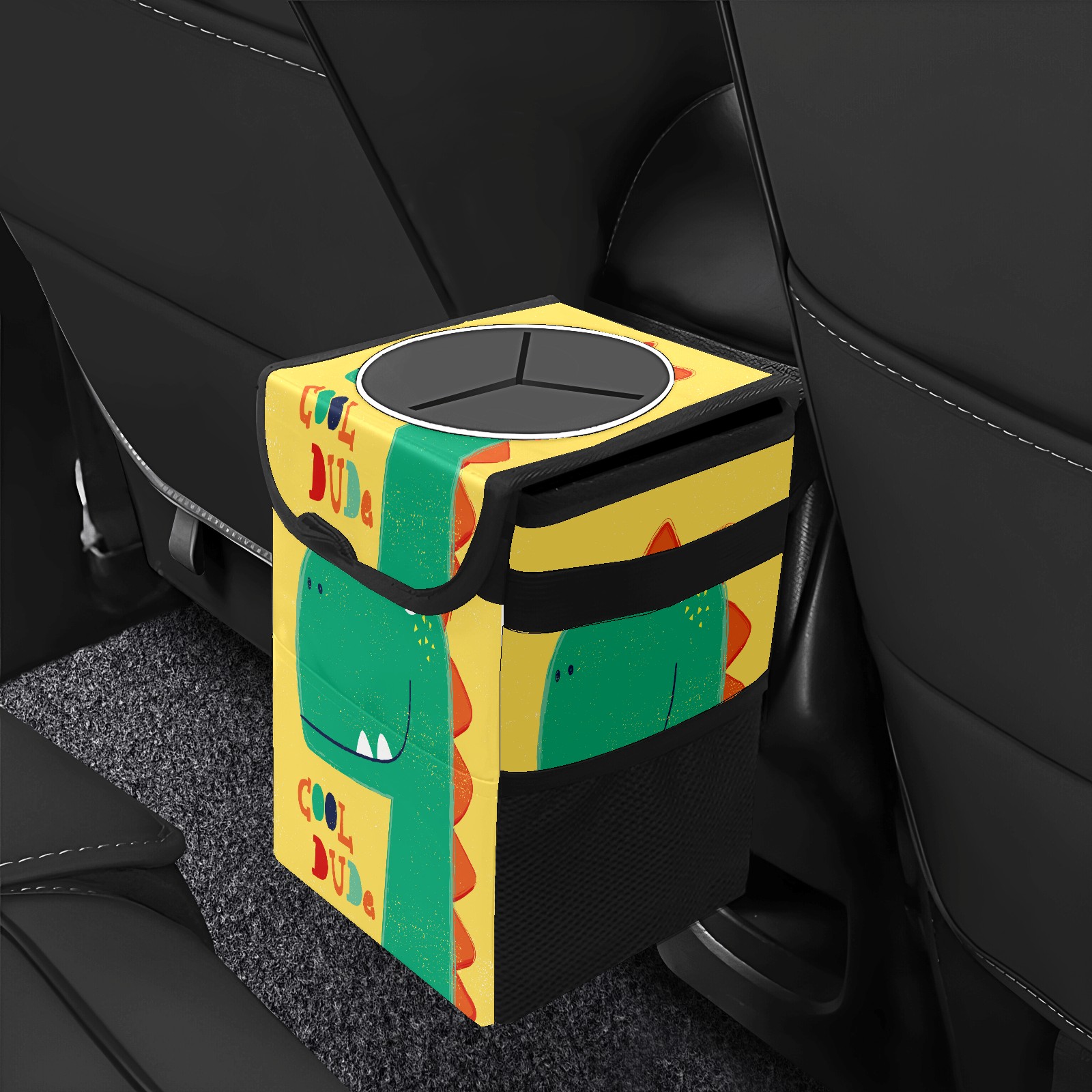 FOLDABLE & SPACE-SAVING Compact 9.5"×6.7"×6.3" size fits perfectly in any vehicle space Instantly folds flat when not in use - stores effortlessly under seats or in door pockets MULTI-FUNCTION ORGANIZER Large main compartment holds bottles, wrappers and tissues Additional pockets for wet wipes, masks or small accessories WATERPROOF & LEAKPROOF Made with premium leak-proof polyester material Contains messy spills from drinks, snacks, and food Wipe-clean surface resists stains and eliminates odors Package Includes 1× Car Trash Can