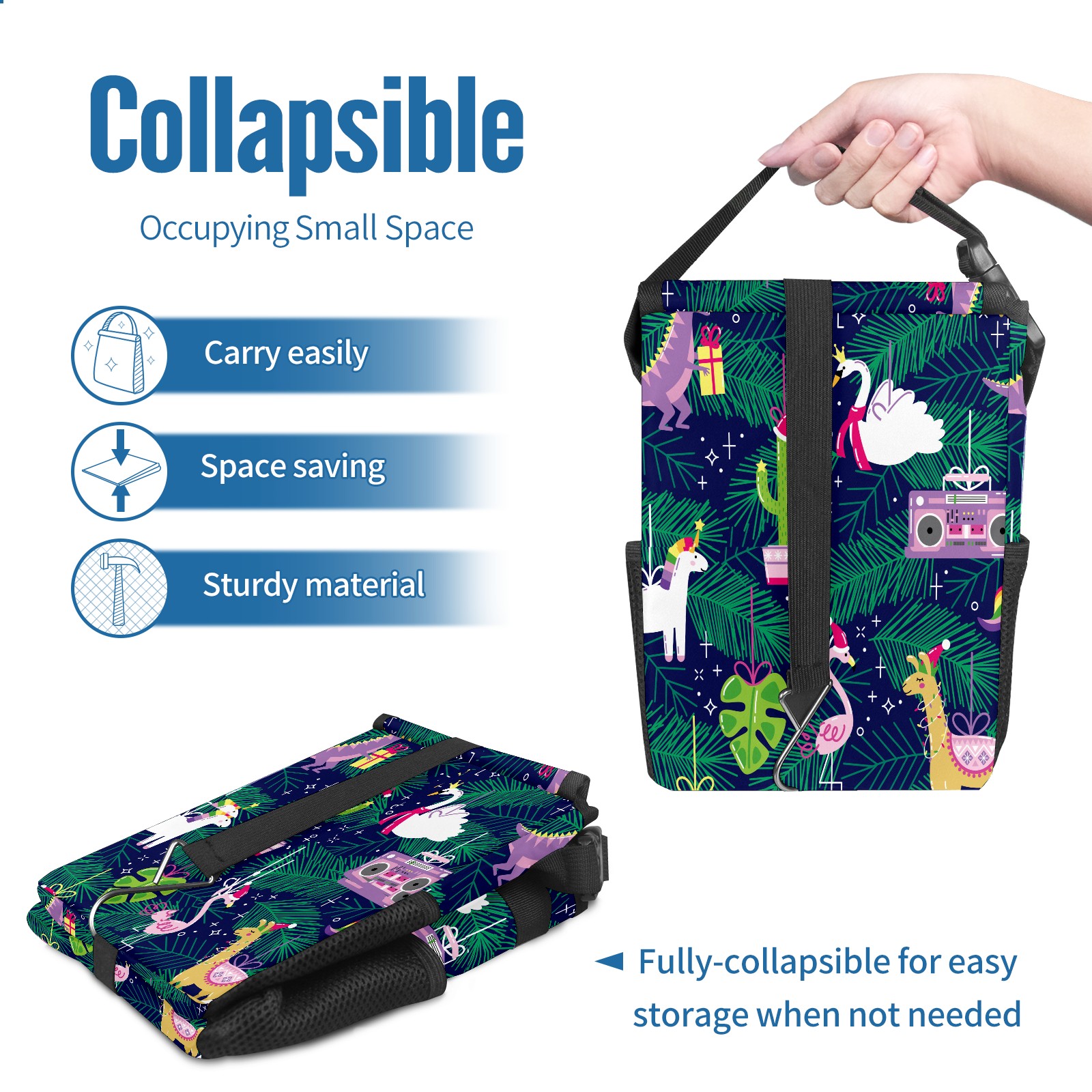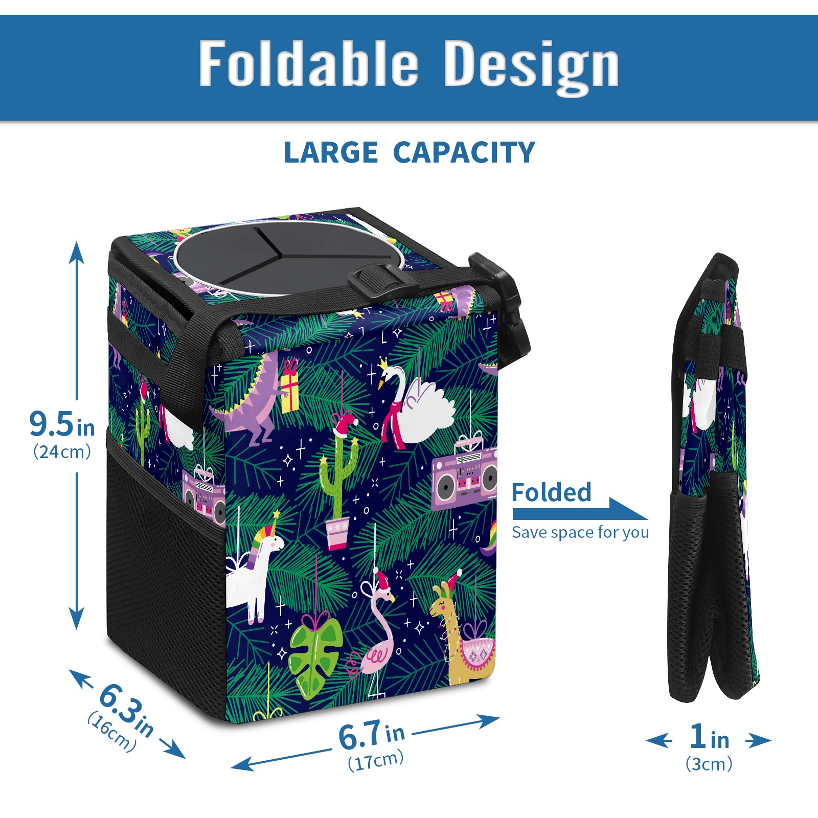 FOLDABLE & SPACE-SAVING Compact 9.5"×6.7"×6.3" size fits perfectly in any vehicle space Instantly folds flat when not in use - stores effortlessly under seats or in door pockets MULTI-FUNCTION ORGANIZER Large main compartment holds bottles, wrappers and tissues Additional pockets for wet wipes, masks or small accessories WATERPROOF & LEAKPROOF Made with premium leak-proof polyester material Contains messy spills from drinks, snacks, and food Wipe-clean surface resists stains and eliminates odors Package Includes 1× Car Trash Can