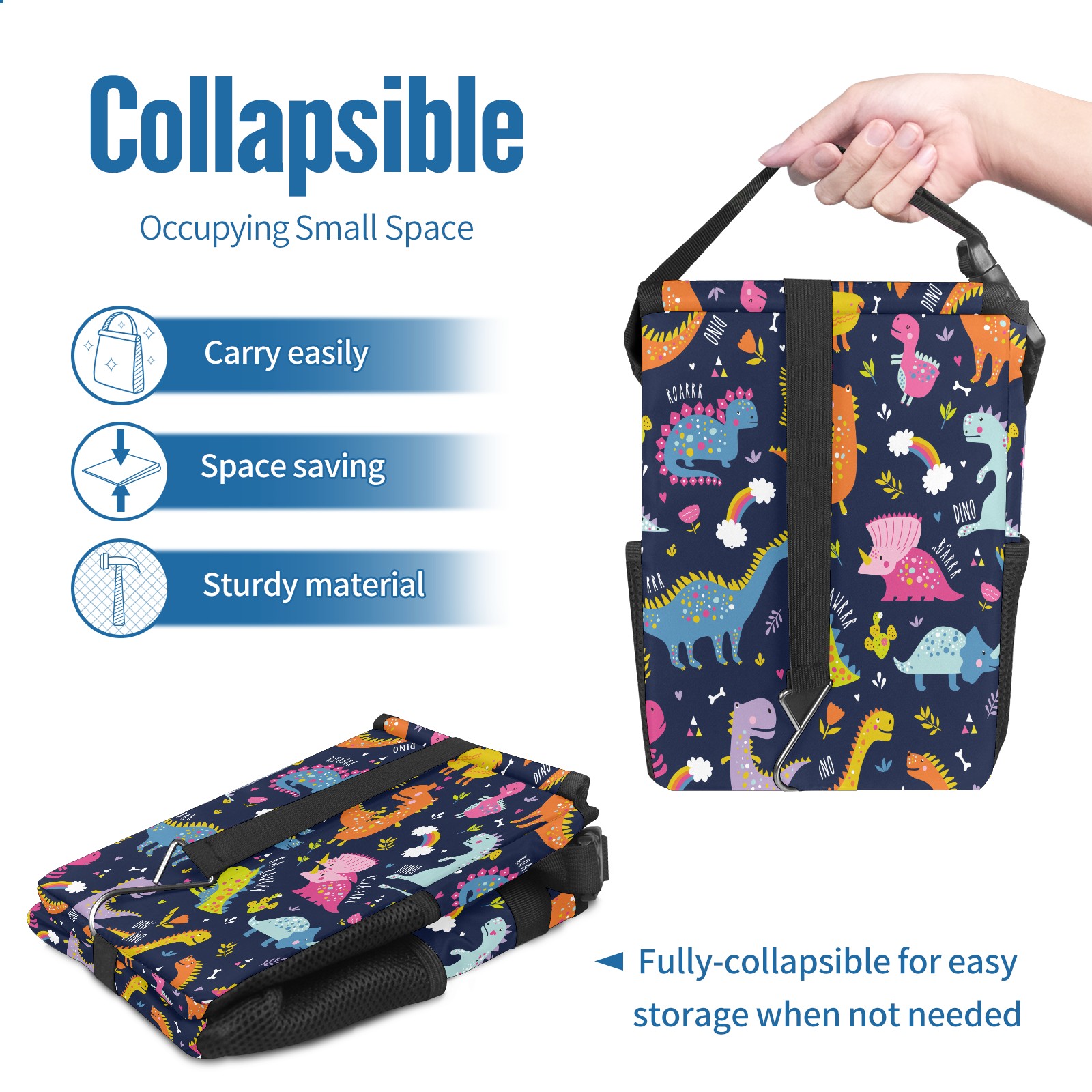 FOLDABLE & SPACE-SAVING Compact 9.5"×6.7"×6.3" size fits perfectly in any vehicle space Instantly folds flat when not in use - stores effortlessly under seats or in door pockets MULTI-FUNCTION ORGANIZER Large main compartment holds bottles, wrappers and tissues Additional pockets for wet wipes, masks or small accessories WATERPROOF & LEAKPROOF Made with premium leak-proof polyester material Contains messy spills from drinks, snacks, and food Wipe-clean surface resists stains and eliminates odors Package Includes 1× Car Trash Can