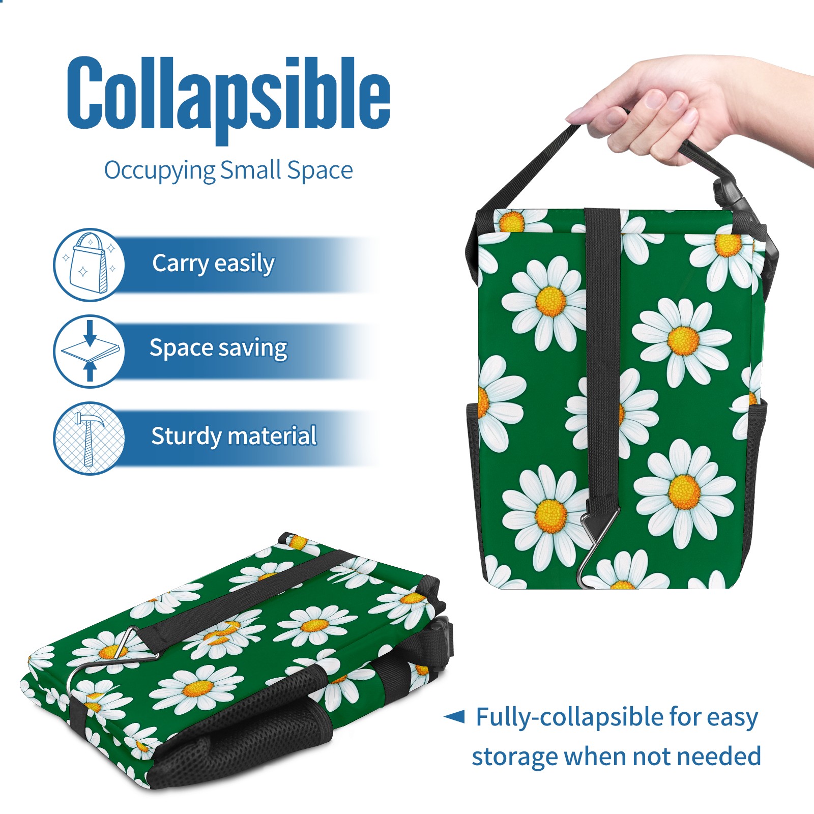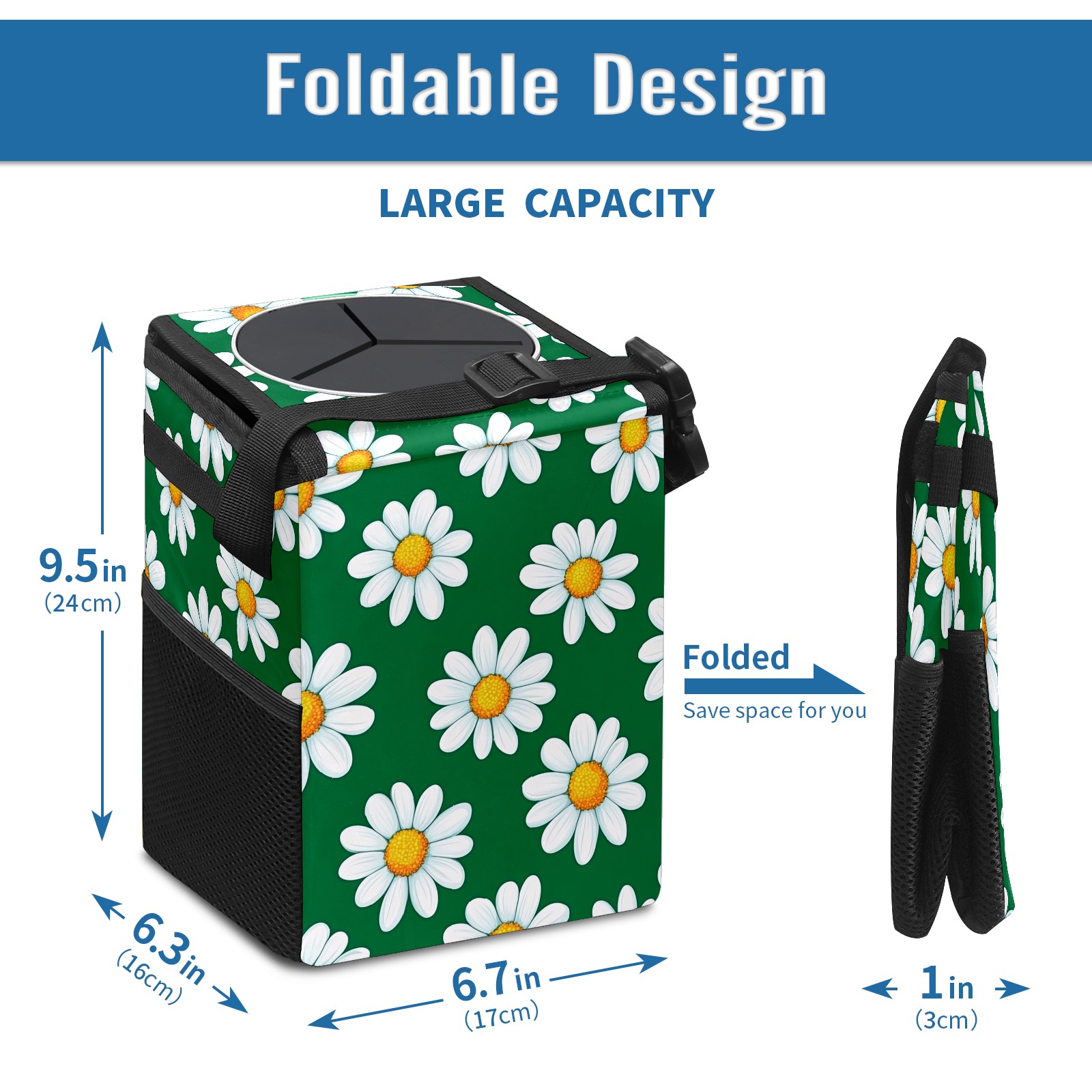 • <p>【FOLDABLE &amp; SPACE-SAVING】</p> <p>✔ Compact 9.5"×6.7"×6.3" size fits perfectly in any vehicle space.</p> <p>✔ Instantly folds flat when not in use - stores effortlessly under seats or in door pockets.</p> <p>【MULTI-FUNCTION ORGANIZER】</p> <p>✔ Large main compartment holds bottles, wrappers and tissues.</p> <p>✔ Additional pockets for wet wipes, masks or small accessories.</p> <p>【WATERPROOF &amp; LEAKPROOF】</p> <p>✔ Made with premium leak-proof polyester material.</p> <p>✔ Contains messy spills from drinks, snacks, and food. </p> <p>✔ Wipe-clean surface resists stains and eliminates odors.</p> <p>Package Includes:</p> <p>1× Car Trash Can</p>