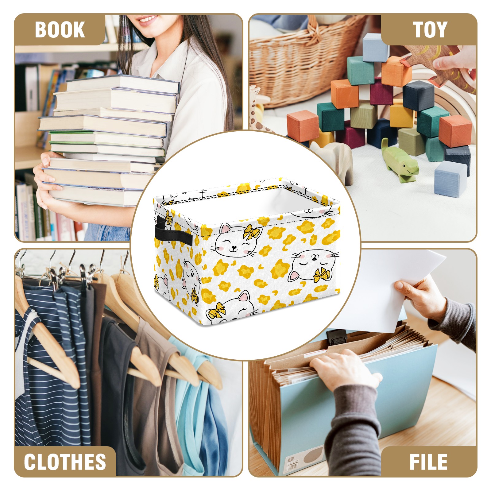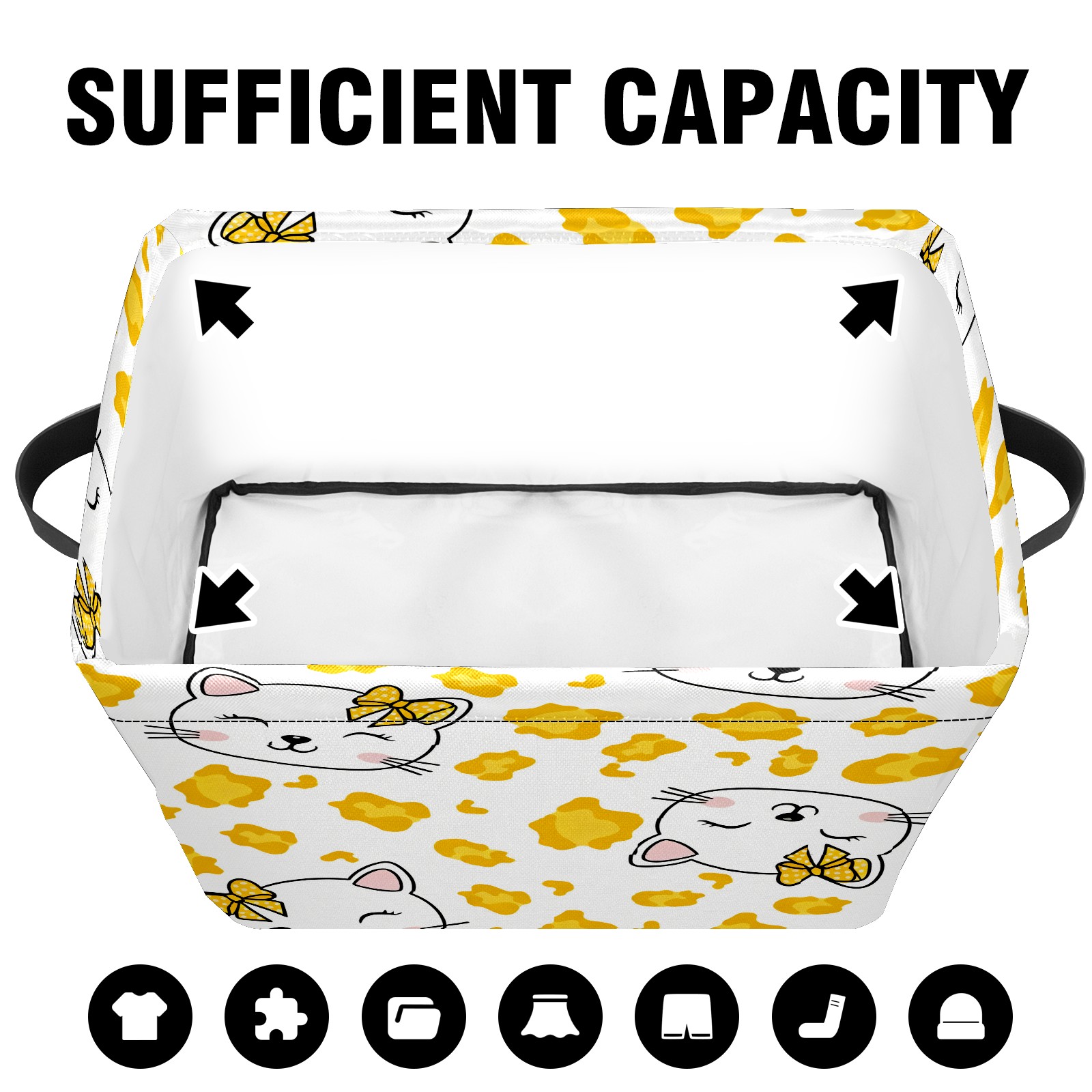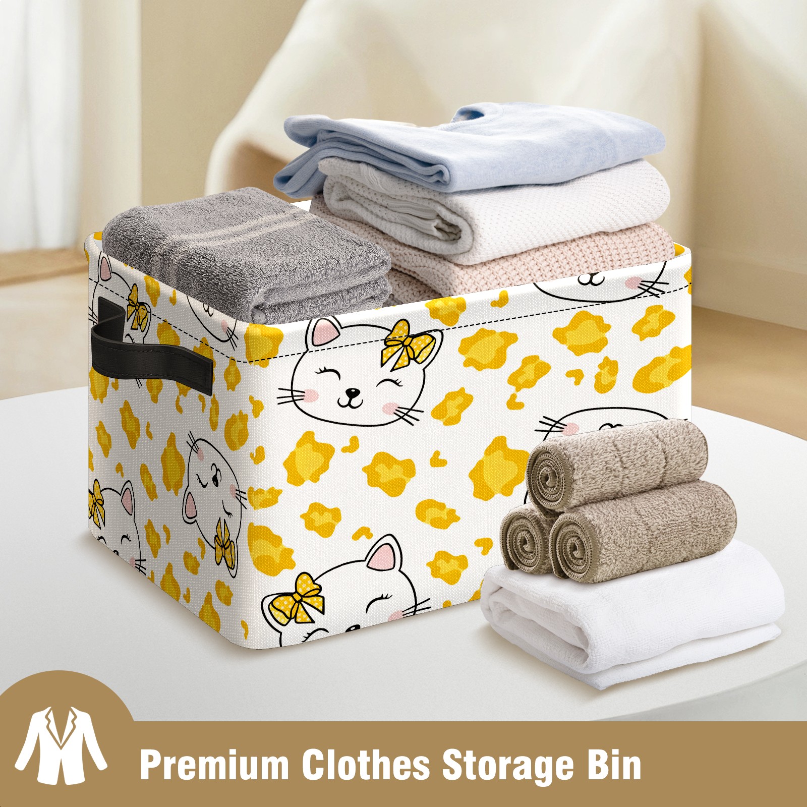 Foldable and Stackable Fabric Storage Basket for Home Organization with Handles, Decorative Closet Bins for Shelves and Laundry Storage( Hello Cat Yellow)